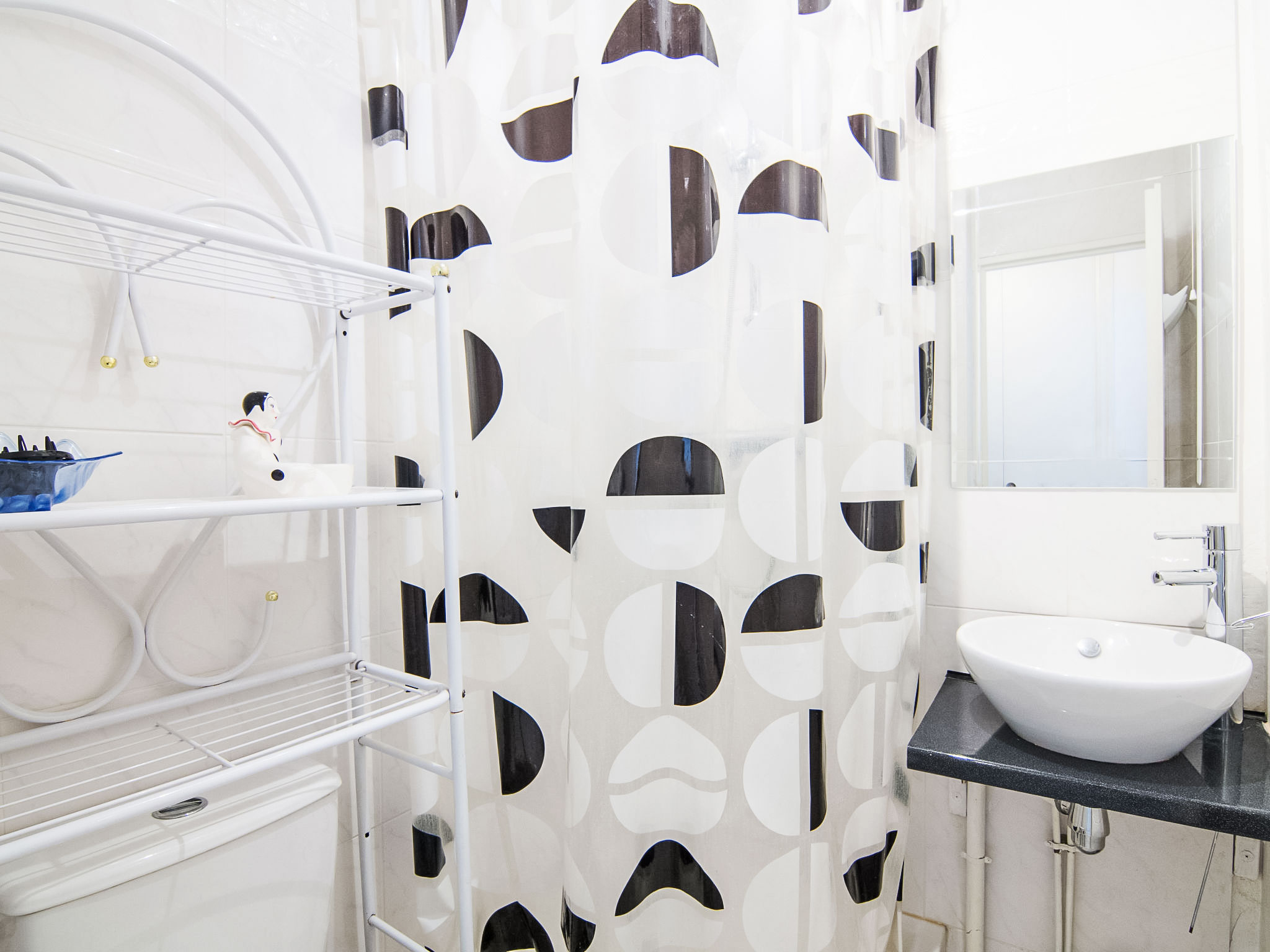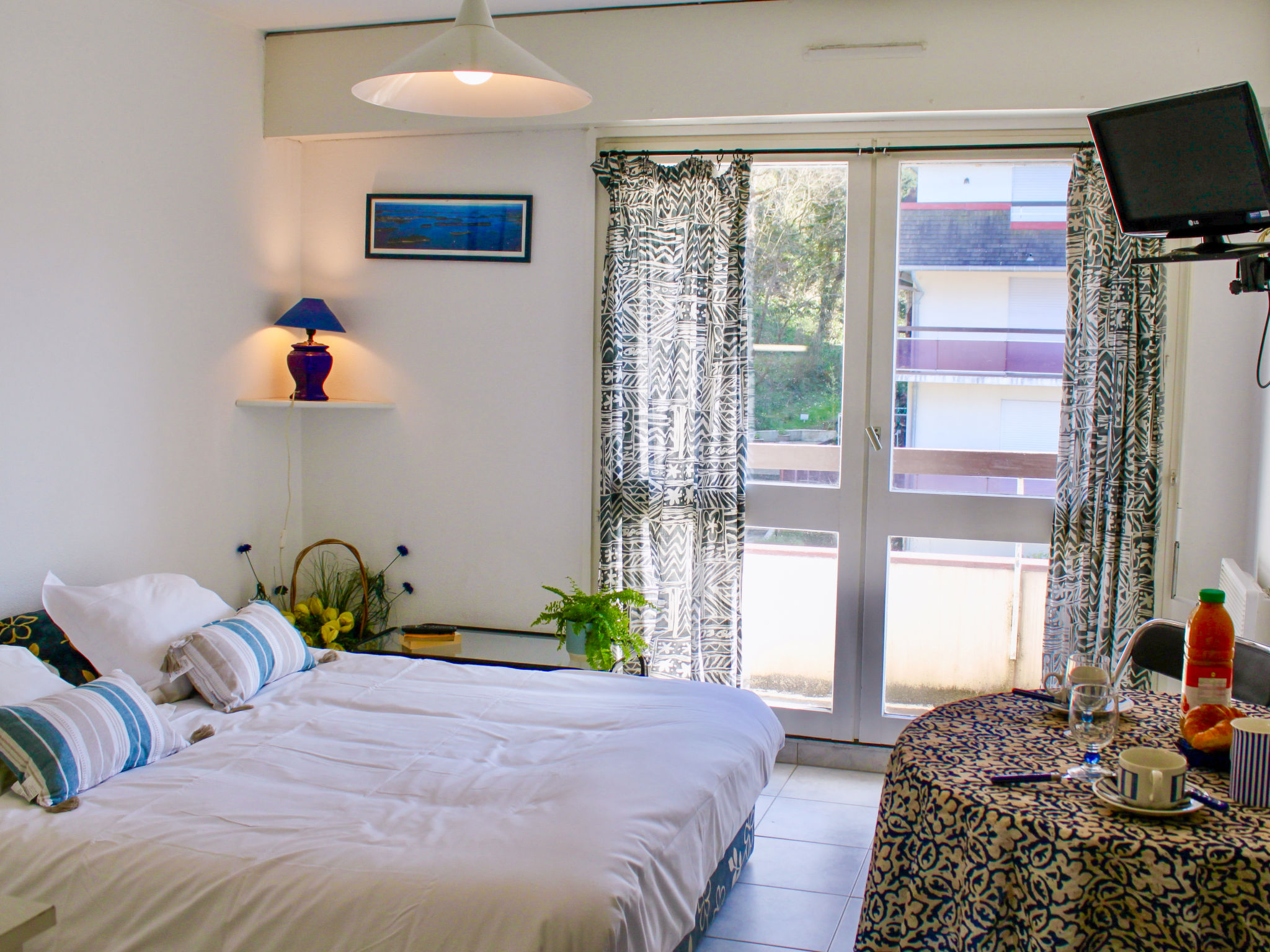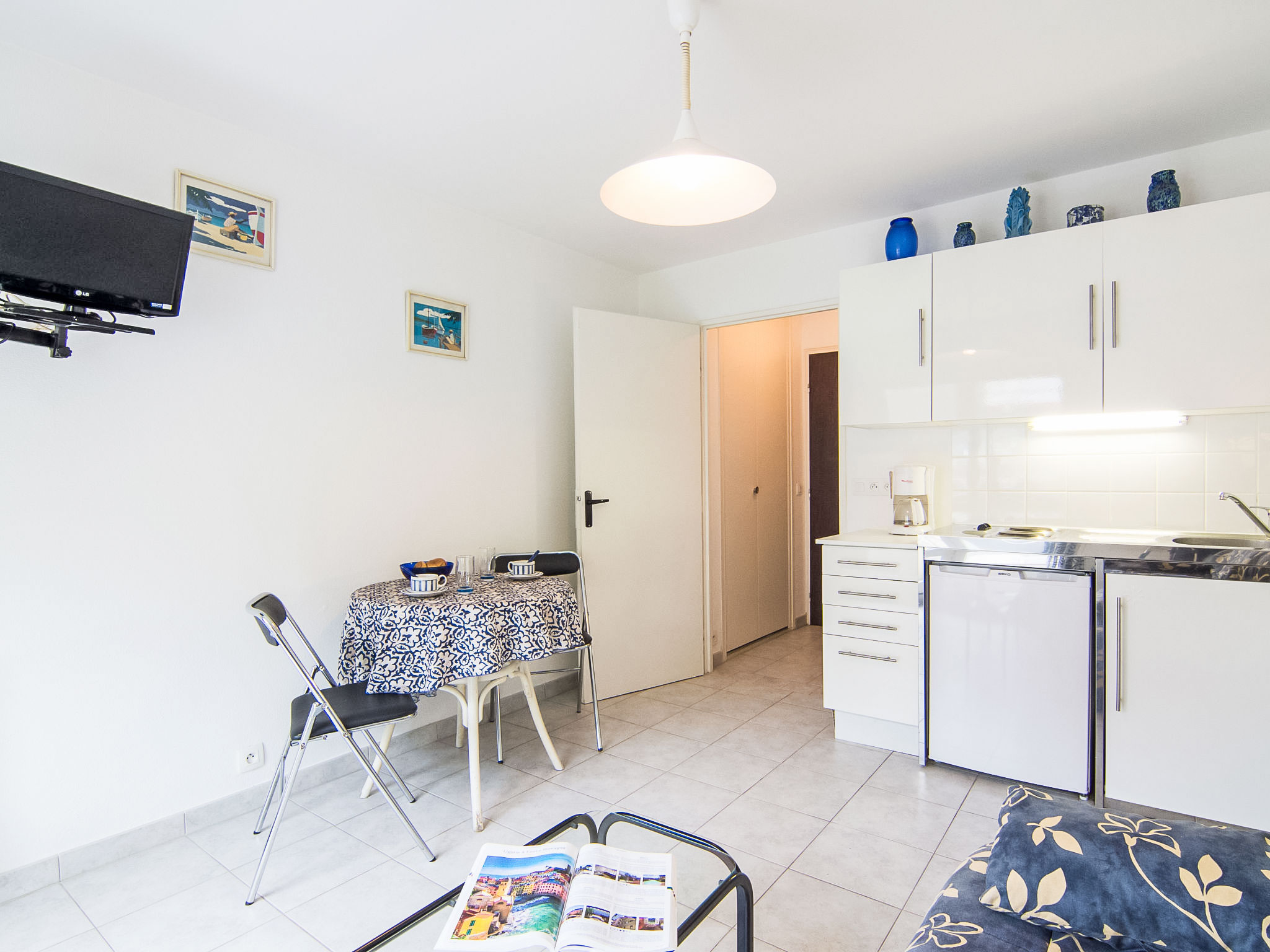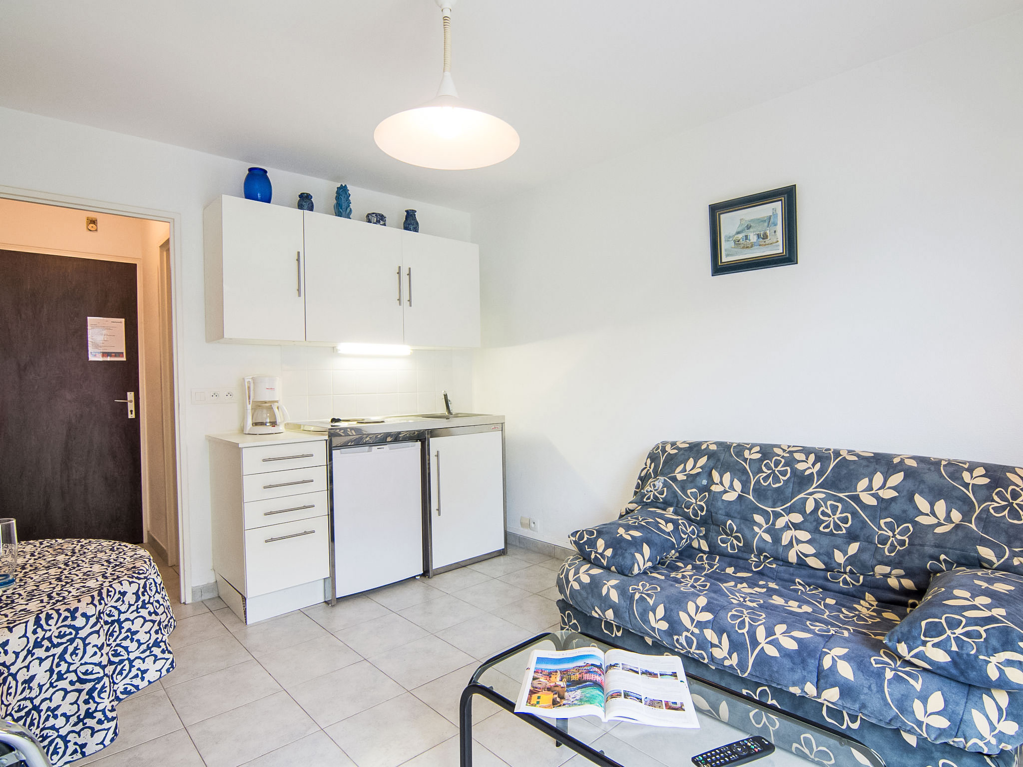 1-Zimmer-Studio 18 m2 im 2. Stock, Südlage. Eingang. Wohn-/Esszimmer mit 1 Doppeldiwanbett (140 cm), Essecke und TV (Flachbildschirm). Ausgang zum Balkon. Kochnische (2 Kochplatten, Toaster, Wasserkocher, Mikrowelle, elektrische Kaffeemaschine). Dusche/WC. Kleiner Balkon 1 m2. Zur Verfügung: Internet (Wireless LAN, extra). Bitte beachten: Wohnung auf Parkplatzseite. Nichtraucher-Unterkunft. Rauchmelder.