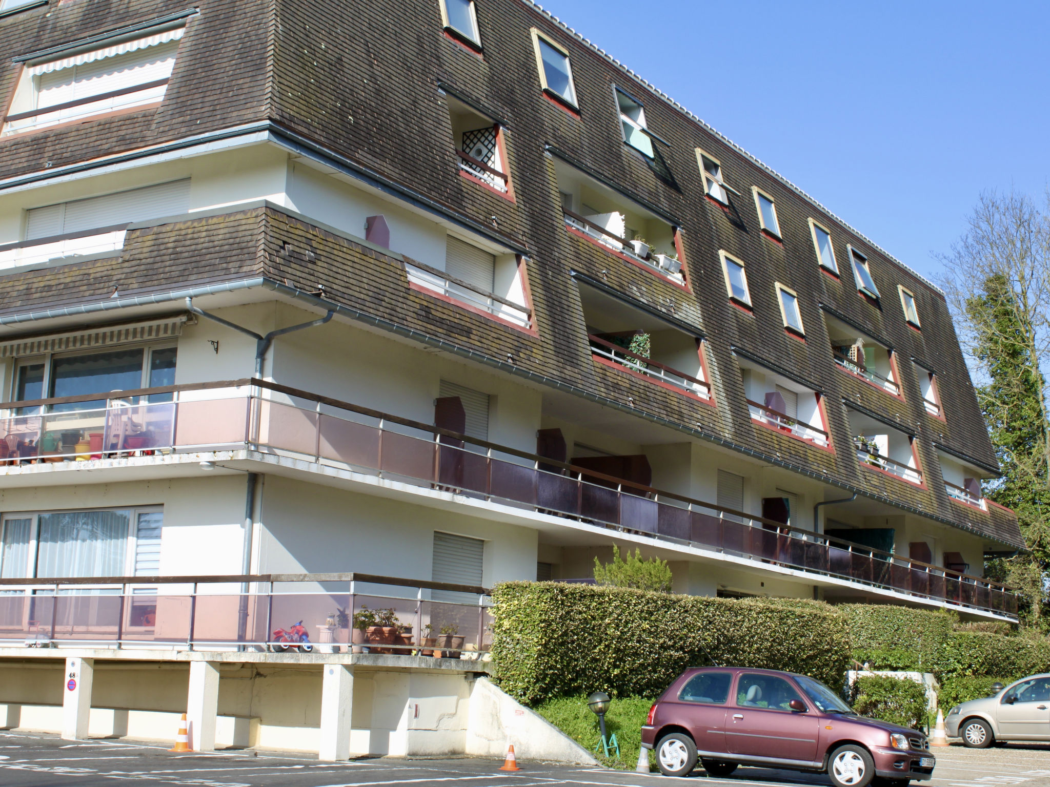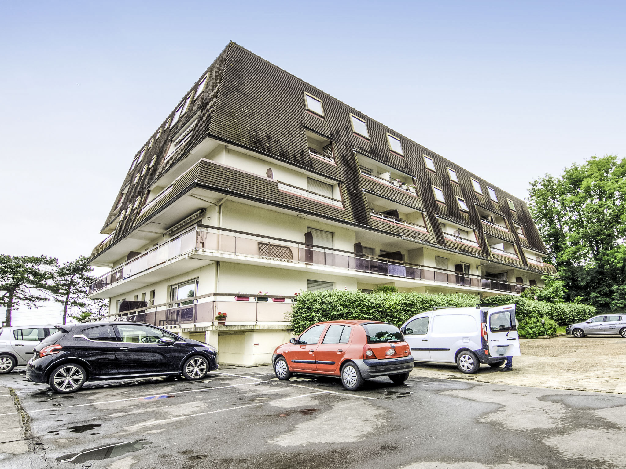 Trouville sur Mer: Residenz "Les Flots Bleus", auf 4 Stockwerken. Ausserhalb des Ortes, auf einem Hügel, 900 m vom Meer, 900 m vom Strand. In der Anlage: Fahrstuhl. (5 Stufen). Einkaufsgeschäft 2 km, Lebensmittelgeschäft 2.1 km, Supermarkt 2.1 km, Bushaltestelle 50 m, Bahnstation "Deauville-Trouville" 2.4 km, Sandstrand 1 km, Hallenbad 2 km, Thermalbad "Trouville sur Mer" 2 km. Golfplatz 6.1 km, Segelschule 1.5 km, Tennis 1.5 km. Nahe gelegene Sehenswürdigkeiten: Honfleur 13 km, Mémorial de Caen 64 km, Plage du débarquement d'Arromanches 97 km. Bitte beachten: Fahrzeug empfohlen. Die Schlüsselübergabe findet bei der Agentur Interhome in Deauville statt. In diesem Haus sind weitere Ferienwohnungen mietbar.