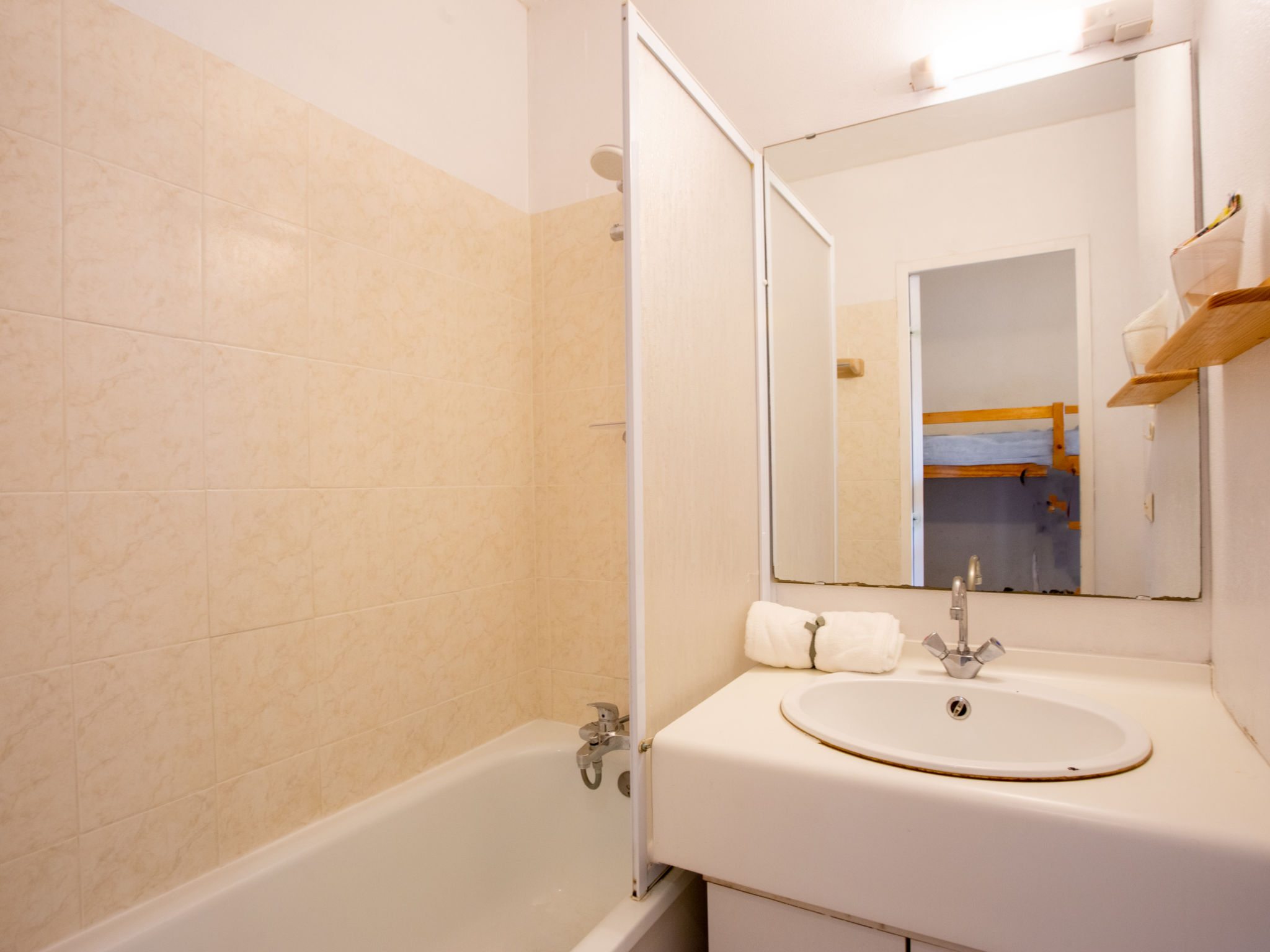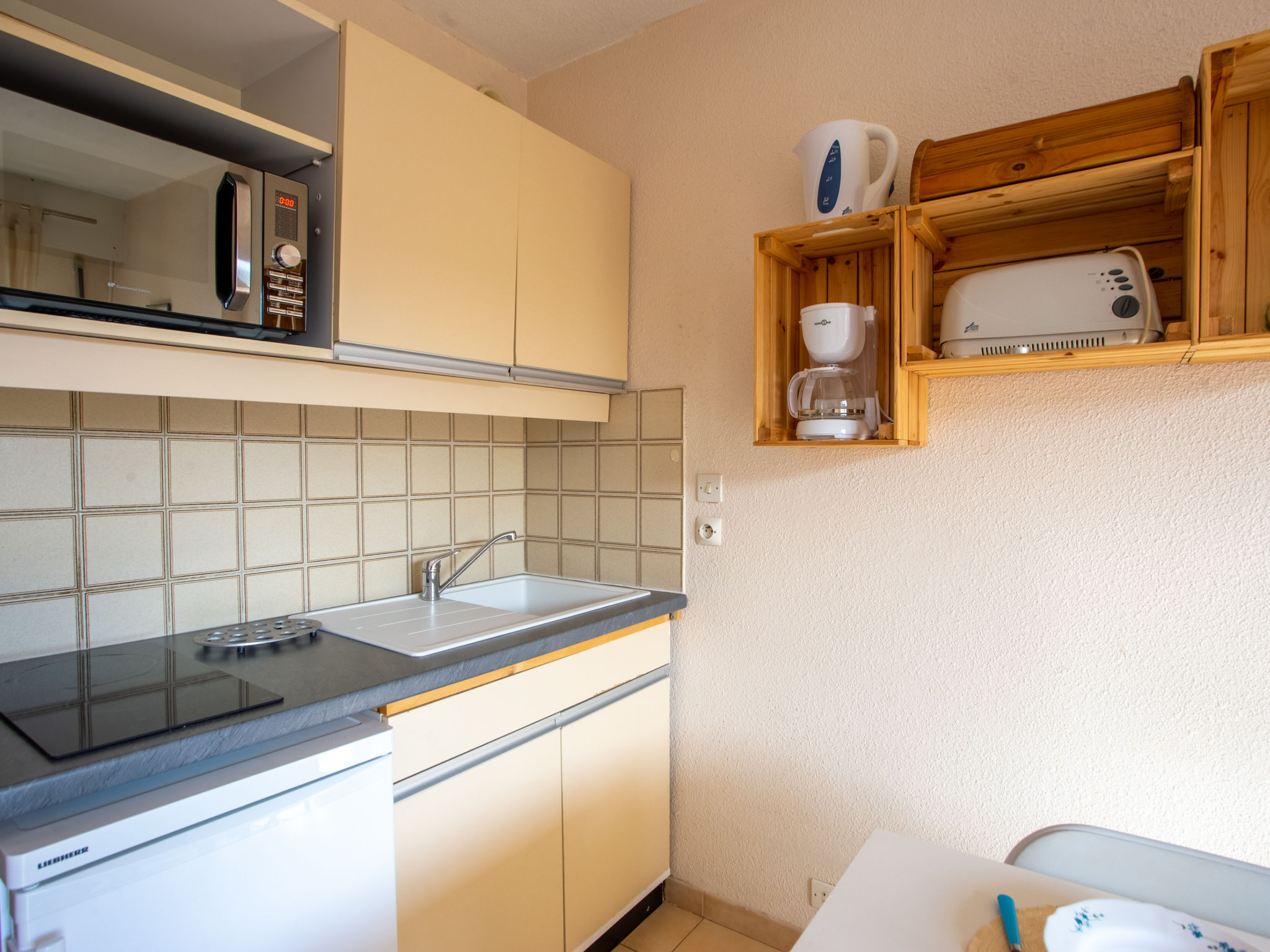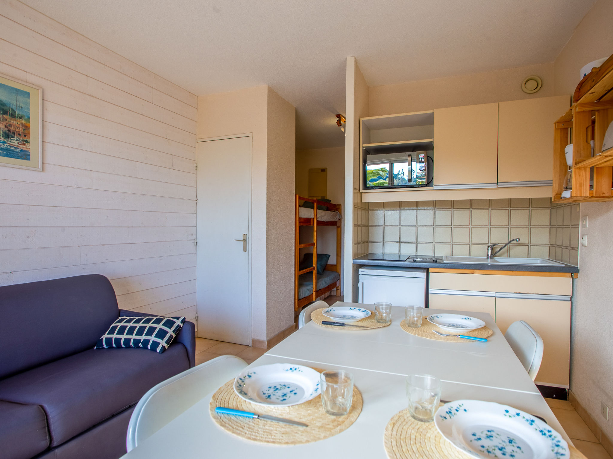 1-Zimmer-Studio 24 m2 im 1. Stock. Objekt geeignet für 2 Erwachsene + 2 Kinder. Einfach und schön eingerichtet: Wohn-/Esszimmer mit 1 Doppeldiwanbett (140 cm, Länge 190 cm), TV (Flachbildschirm). Ausgang zum Balkon. Eingang mit 1 x 2 Etagenbetten (80 cm, Länge 190 cm). Kochnische (2 Glaskeramikherd Platten, Toaster, Wasserkocher, Mikrowelle, elektrische Kaffeemaschine). Bad/WC. E-Heizung. Kleiner Balkon 6 m2, Südlage. Balkonmöbel. Zur Verfügung: Internet (Wireless LAN, extra). Garage Nr. 128, Höhe 180 cm, Breite 240 cm. Bitte beachten: Maximal 1 Haustier/Hund erlaubt. TV nur FR. Rauchmelder. Inserat einer Privatperson nach Artikel 155, IV, CGI. 83019000598VF