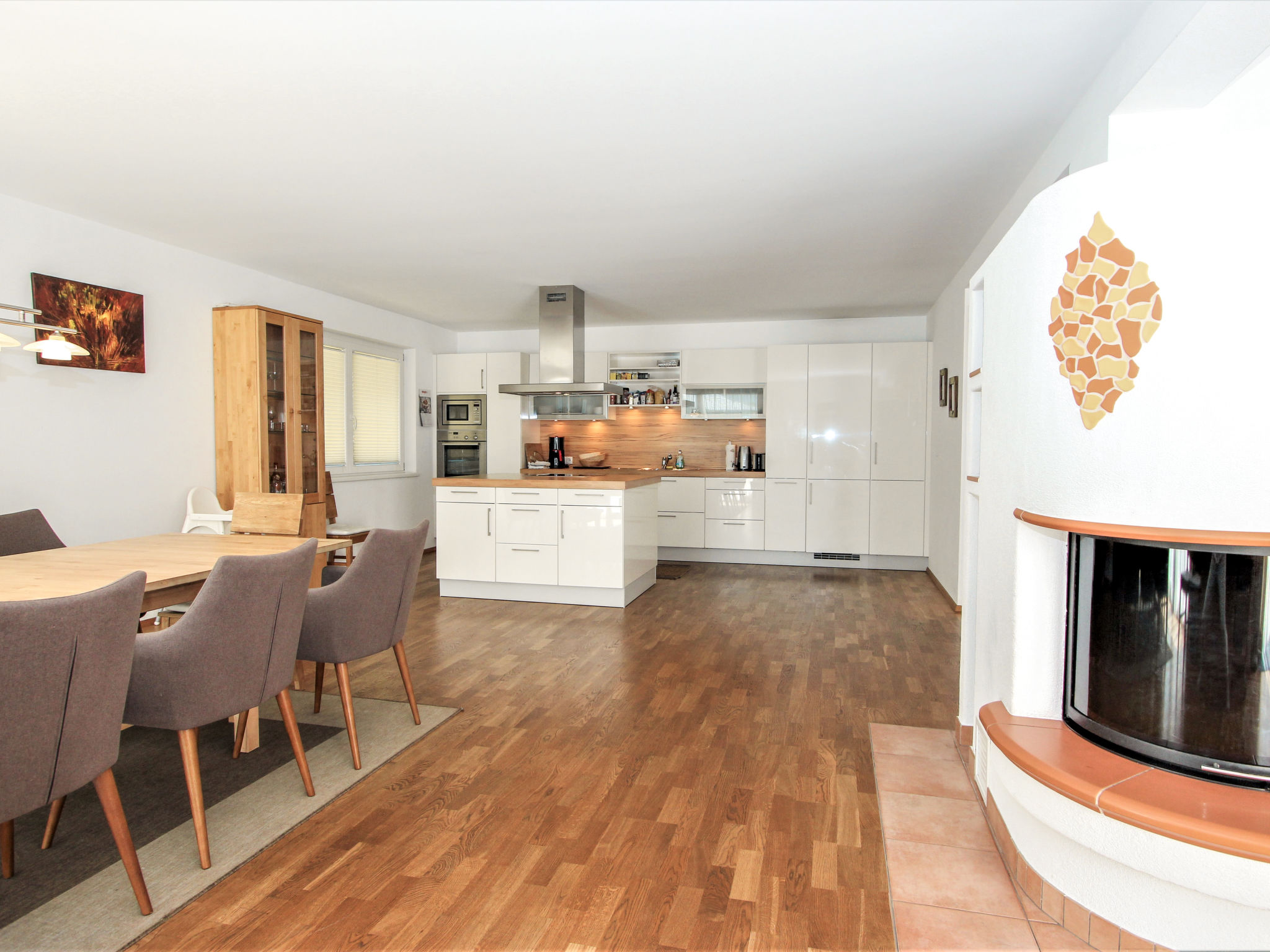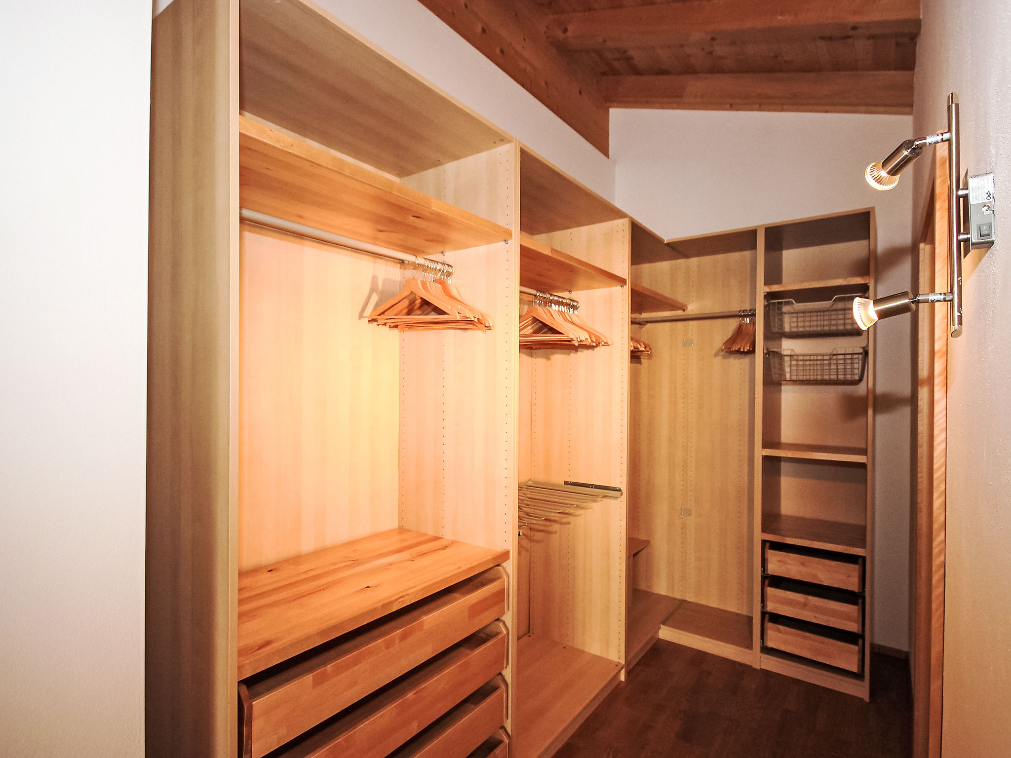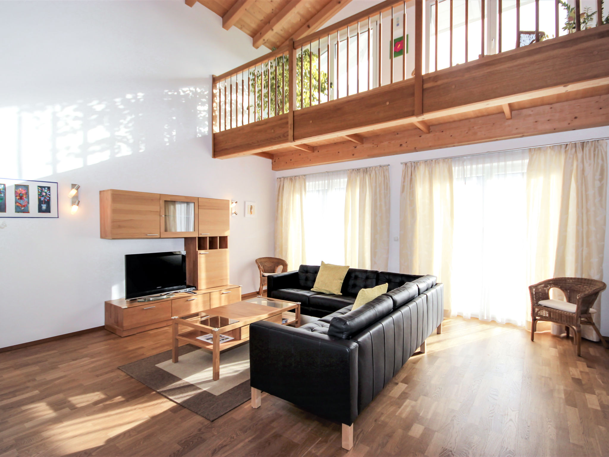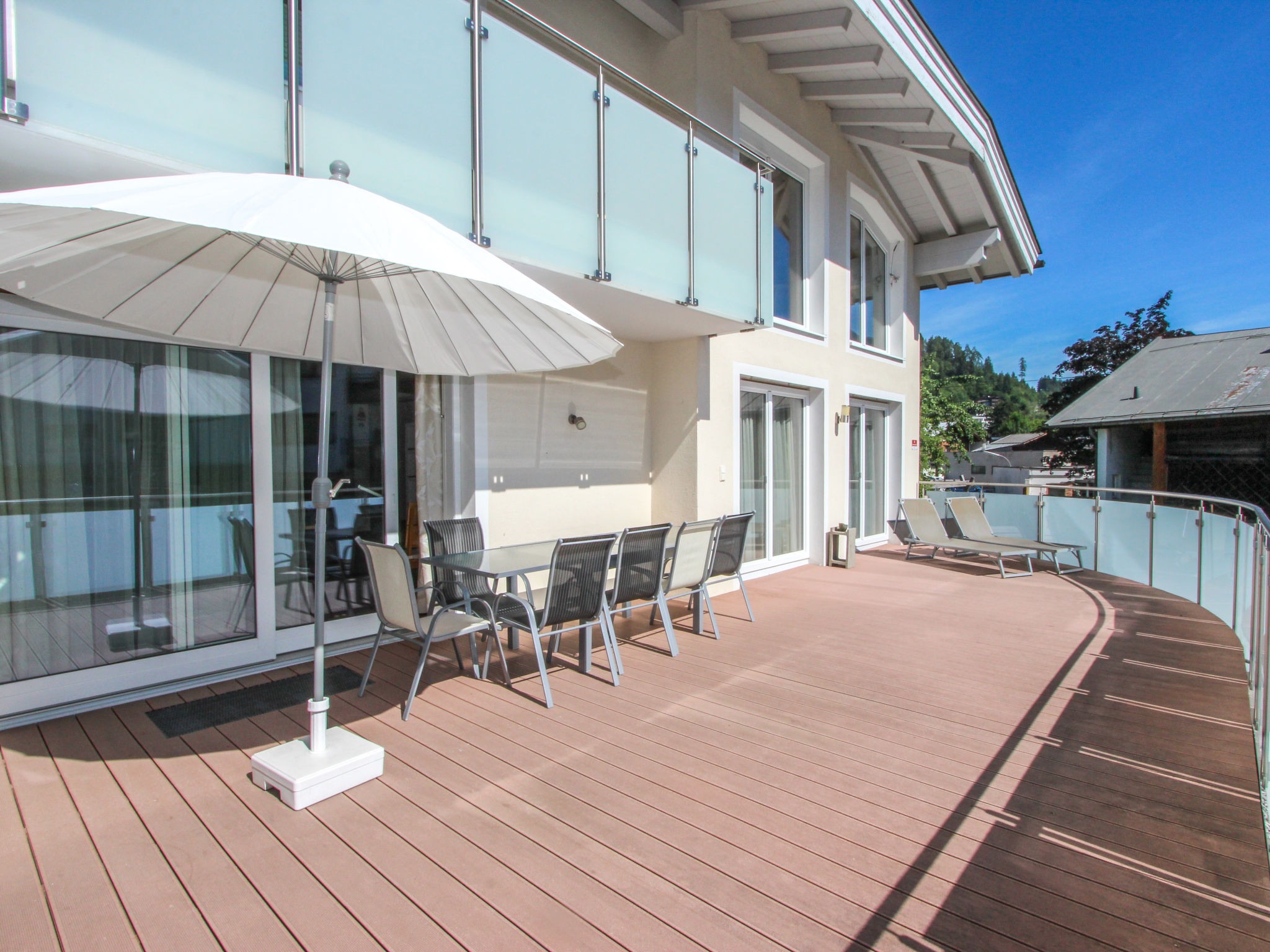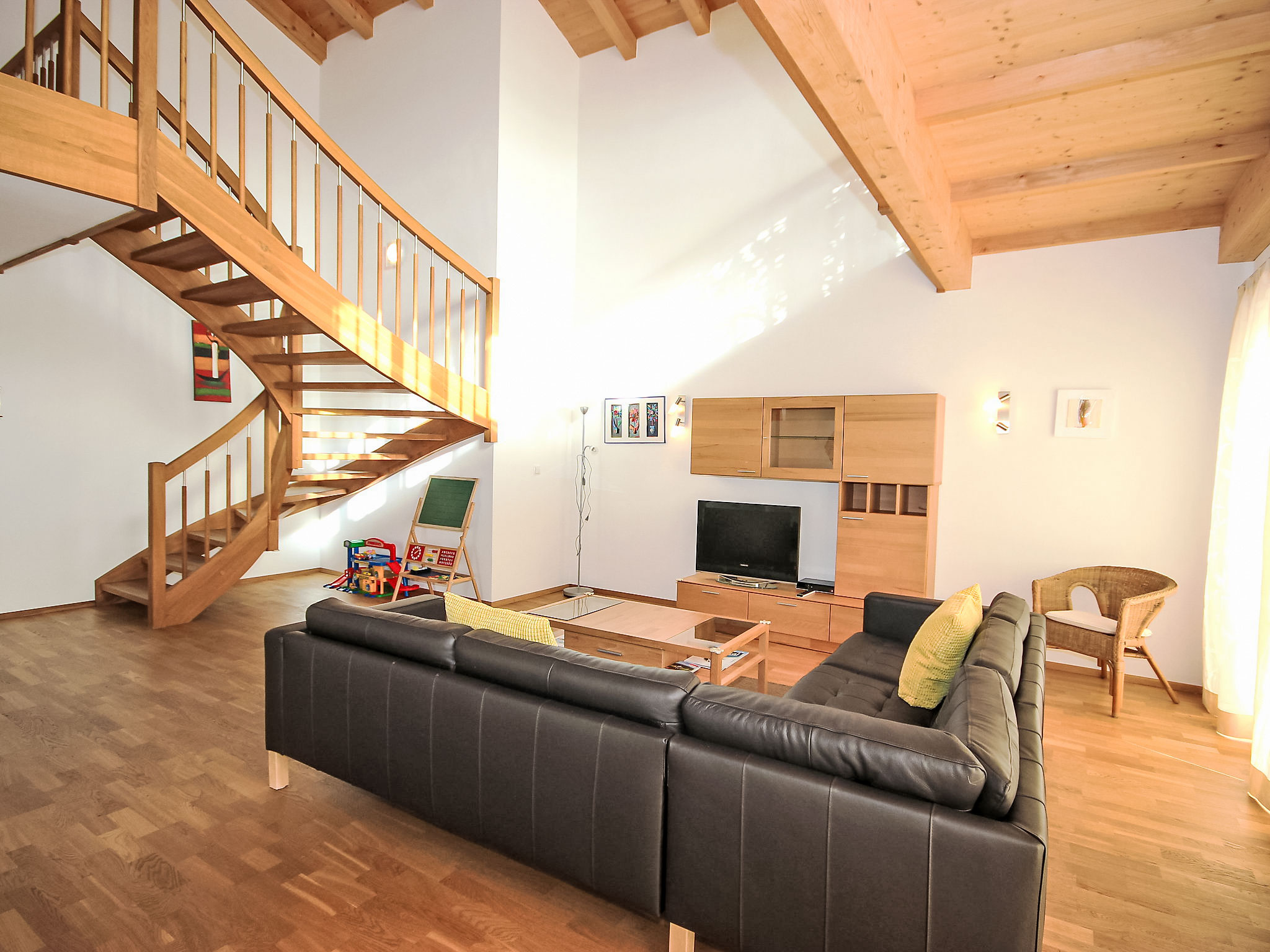 7-Zimmer-Haus 260 m2 auf 3 Stockwerken. Geräumig, sehr komfortabel und modern eingerichtet: Eingang. Grosses Wohnzimmer mit Kabel-TV (Flachbildschirm). Ausgang zur Terrasse. Grosse, offene Küche (Backofen, Geschirrspüler, 4 Glaskeramikherd Platten, Mikrowelle, Tiefkühler) mit Esstisch. Sep. WC. Unteres Geschoss: 1 Doppelzimmer. Durchgangszimmer mit Sat-TV (Flachbildschirm). Dusche, Dusche/WC, Sauna. Obergeschoss: Galerie. 1 Zimmer mit 1 Bett und 1 Doppelbett. 1 Doppelzimmer. 1 grosses Zimmer mit begehbarer Kleiderschrank mit 1 Bett, 1 Doppelbett und Bad/Dusche/WC. Bad/WC. 3 Balkone, grosse Terrasse. Liegestühle, Abstellkammer. Schöne Sicht auf die Berge. Zur Verfügung: Kinderhochstuhl, Babybett bis 2 Jahre. Internet (Wireless LAN, gratis). Garage (2 Autos). Geeignet für Familien. Kinderspielzeug vorhanden. Bei Aufenthalten länger als 10 Nächte wird eine zusätzliche Reinigung von EURO 90.- durchgeführt.
