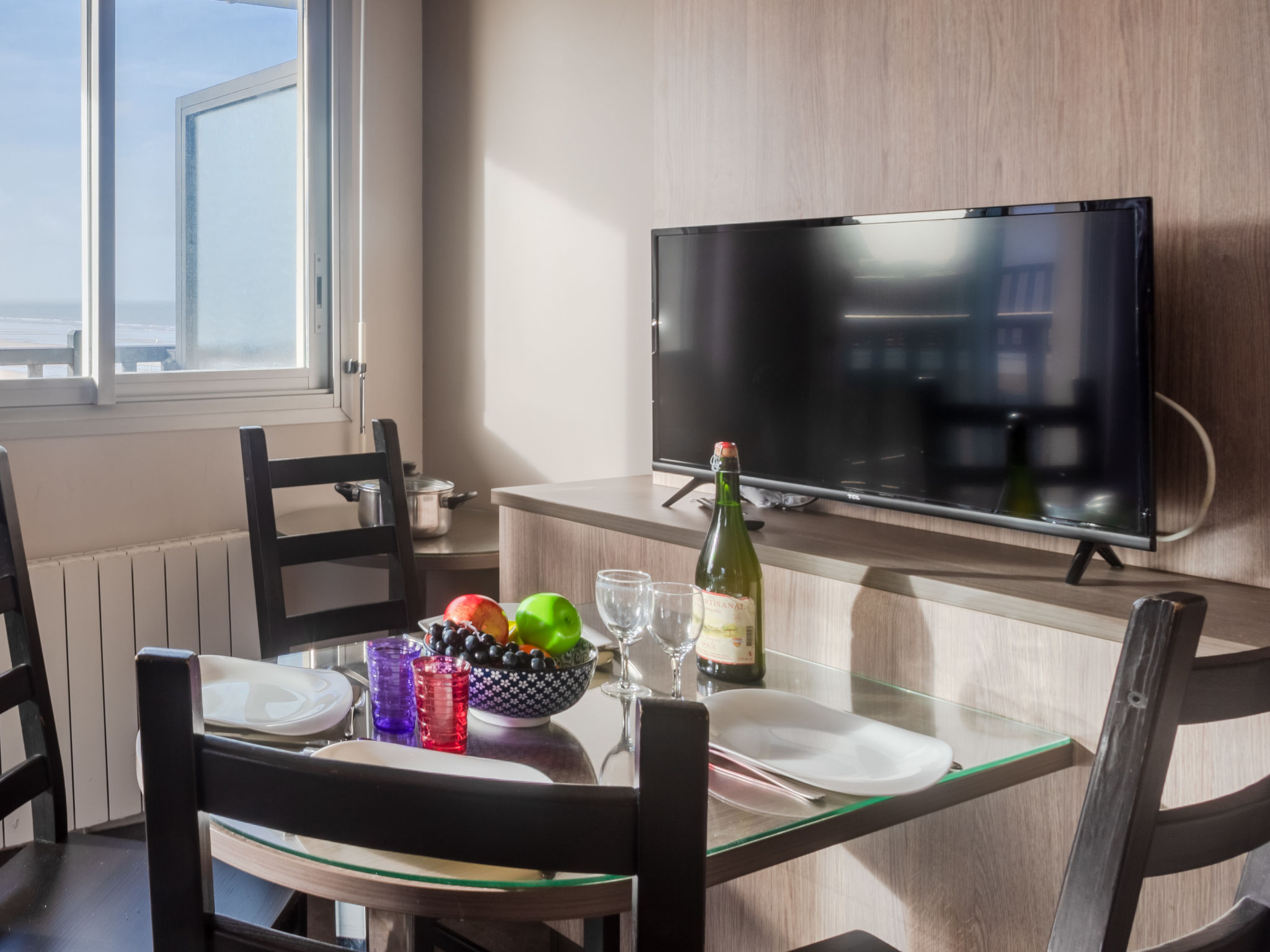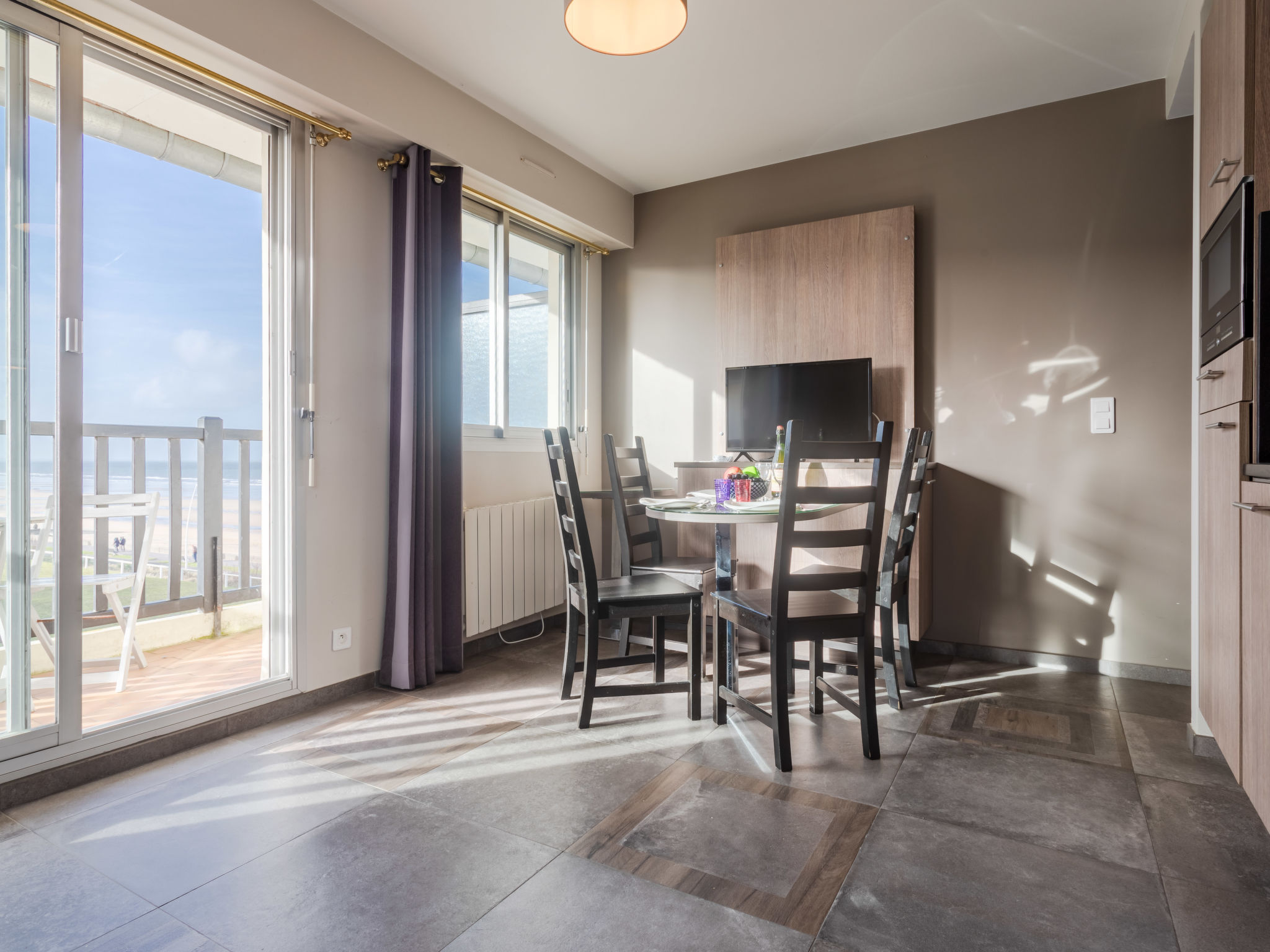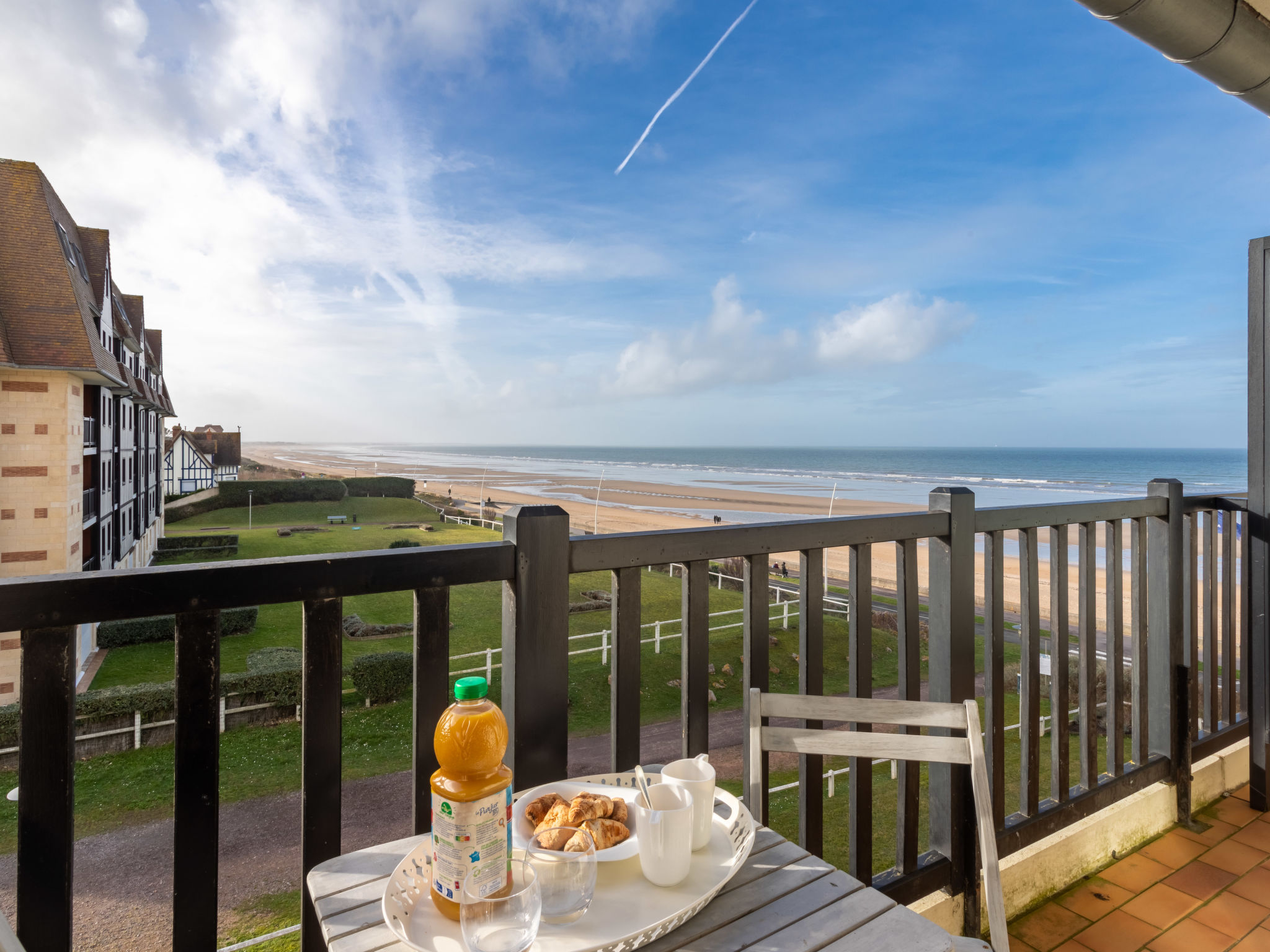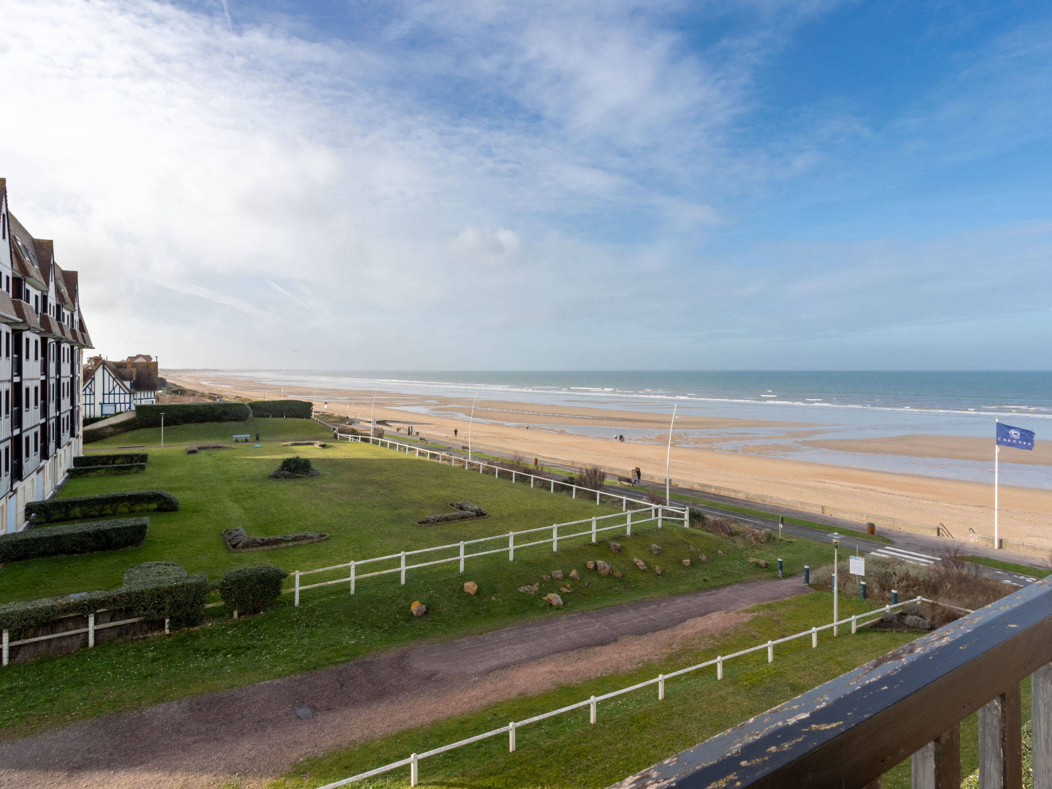 Residenz "Les Normandières", auf 5 Stockwerken. Im Ort, 2 km vom Zentrum von Cabourg, 50 m vom Meer, 50 m vom Strand, direkter Zugang zum Strand. Zur Mitbenutzung: Schwimmbad eckig beheizt, eingezäunt (12 x 6 m, 80 - 180 cm tief, saisonale Verfügbarkeit: 15.Jun.-15.Sep. Öffnungszeiten Schwimmbad: 09:00-20:00) mit Innentreppe. Aussendusche, Tennis (1 x Hartbelag). In der Anlage: Fahrstuhl. Parkplatz (beschränkte Anzahl) auf dem Grundstück, öffentliche Parkplätze auf der Strasse. Einkaufsgeschäft 1 km, Supermarkt 800 m, Restaurant 500 m, Thermalbad "thalassotérapie" 800 m. Golfplatz (18 Loch) 1.2 km. Bitte beachten: In diesem Haus sind weitere Ferienwohnungen mietbar.