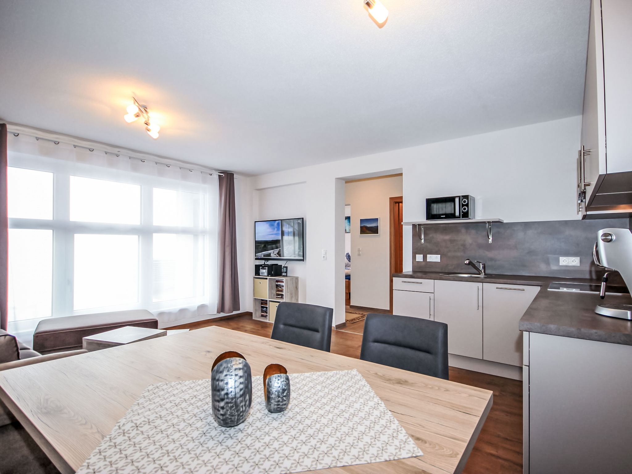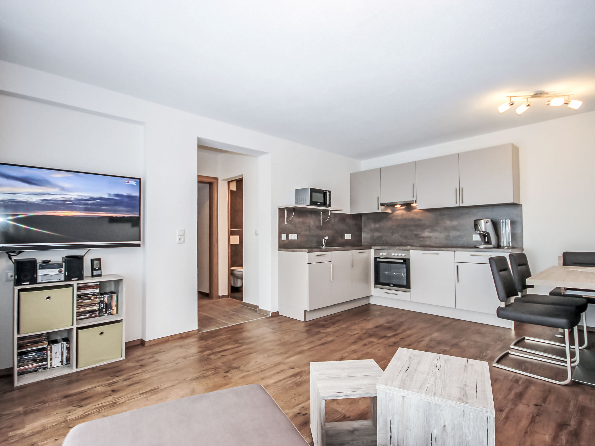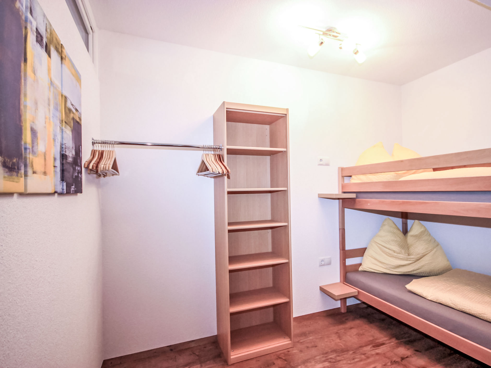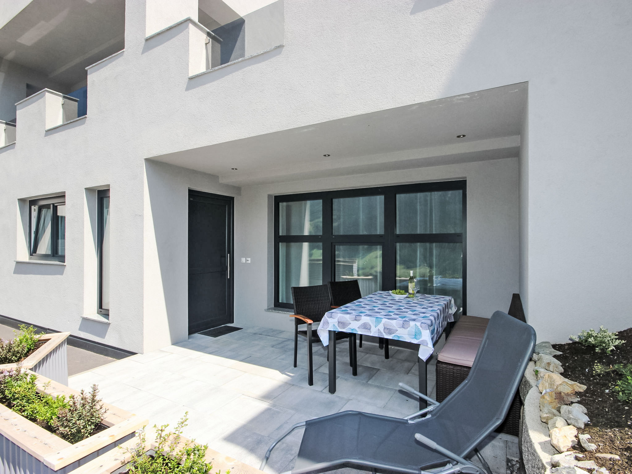 3-Zimmer-Wohnung 50 m2, im Erdgeschoss. Objekt geeignet für 2 Erwachsene + 2 Kinder. Modern und gemütlich eingerichtet: Eingang. 1 Doppelzimmer. 1 Zimmer mit 1 x 2 Etagenbetten. Grosses Wohn-/Schlafzimmer mit Essecke und Sat-TV (Flachbildschirm), Radio, CD, DVD und DVD Sammlung vorhanden. Offene Küche (Backofen, Geschirrspüler, 4 Glaskeramikherd Platten, Mikrowelle, elektrische Kaffeemaschine, Kapseln für die Kaffeemaschine (Cafissimo Tchibo)) mit 1 Doppeldiwanbett. Dusche/WC. Kleine Terrasse 12 m2. Terrassenmöbel, Gartengrill, Sitzplatz. Schöne Sicht auf die Berge. Zur Verfügung: Kinderhochstuhl, Babybett. Internet (Wireless LAN, gratis). Garage (1 Auto) beim Haus. Bitte beachten: geeignet für Familien. Nichtraucher-Unterkunft.