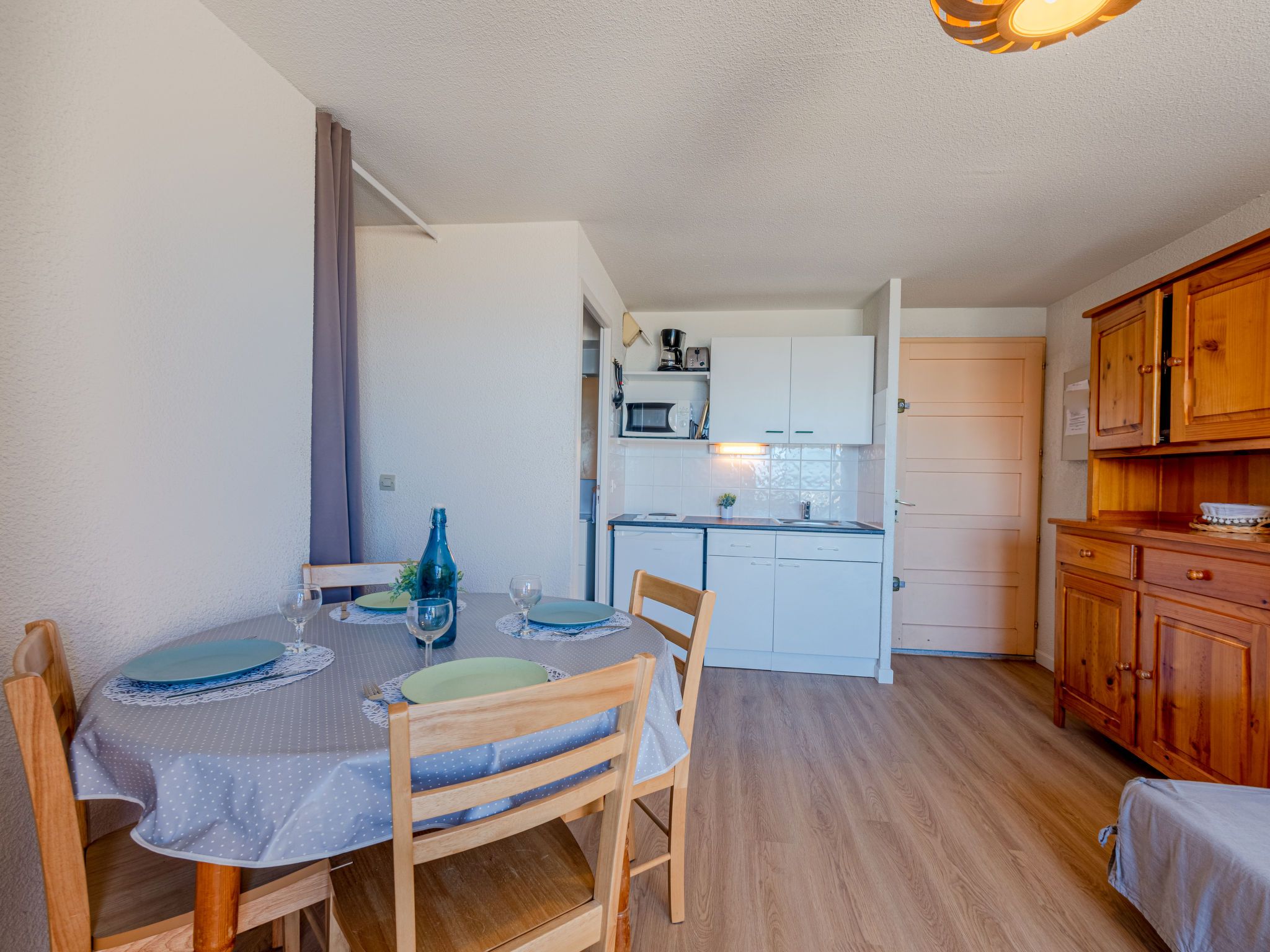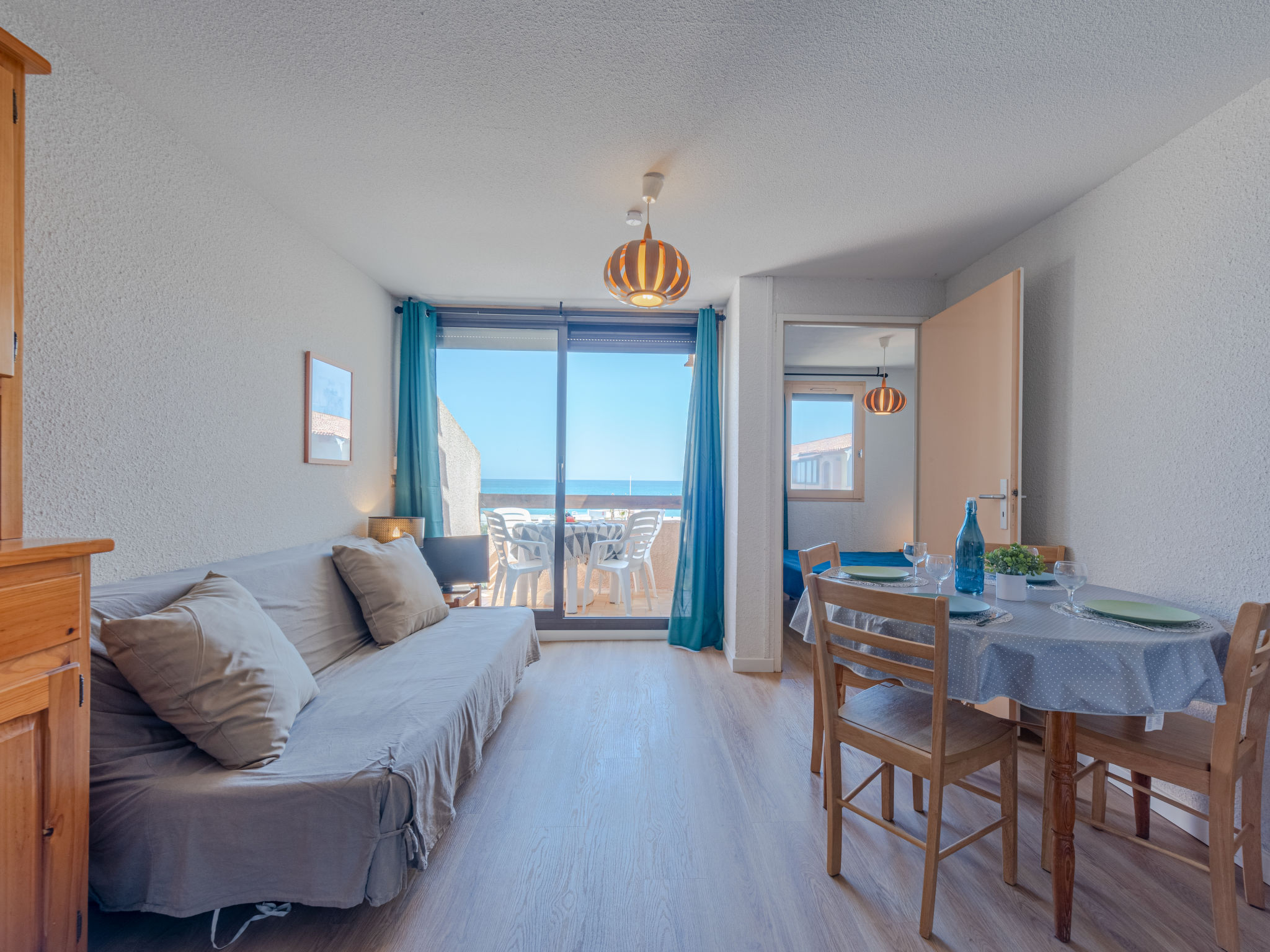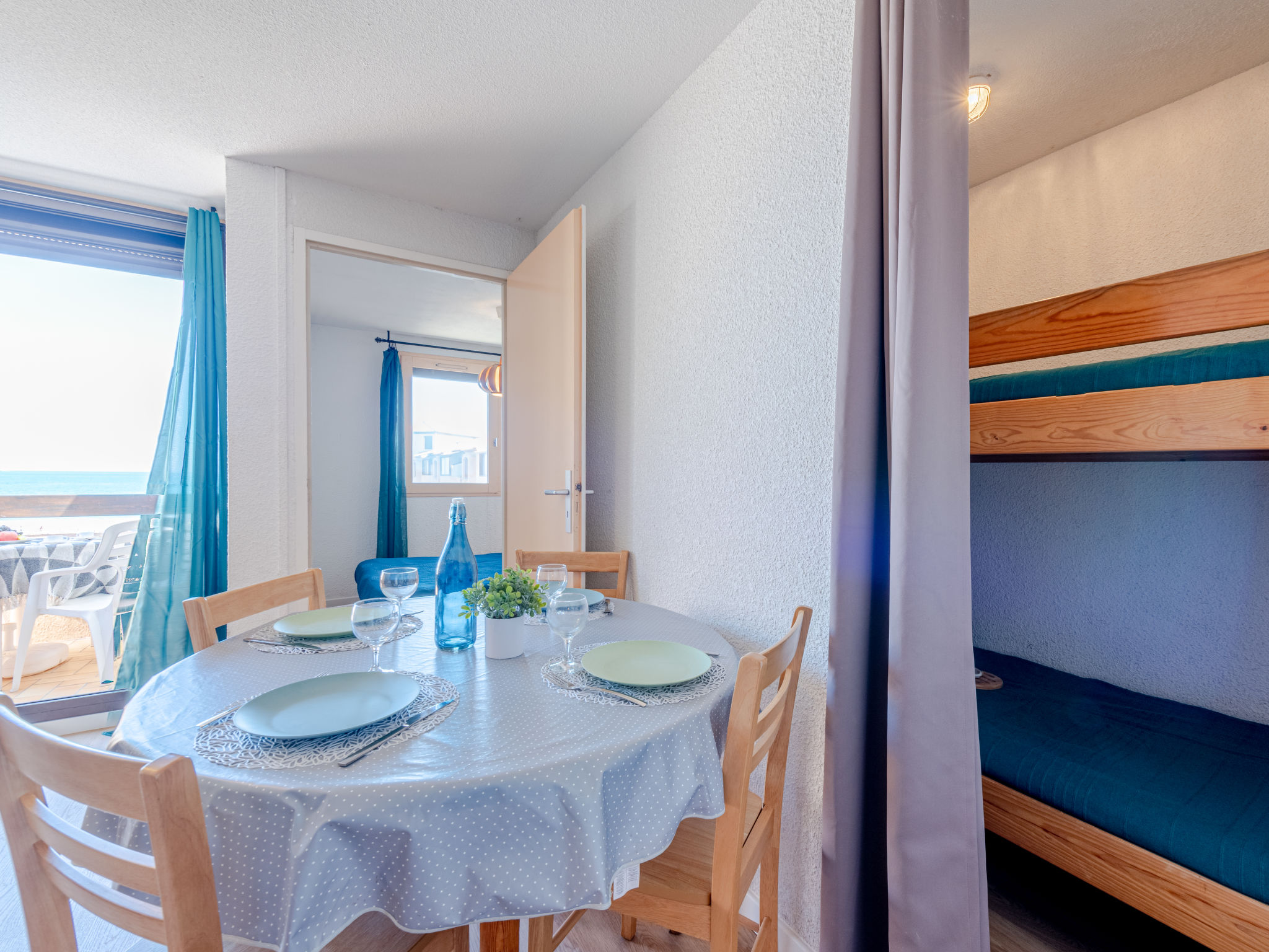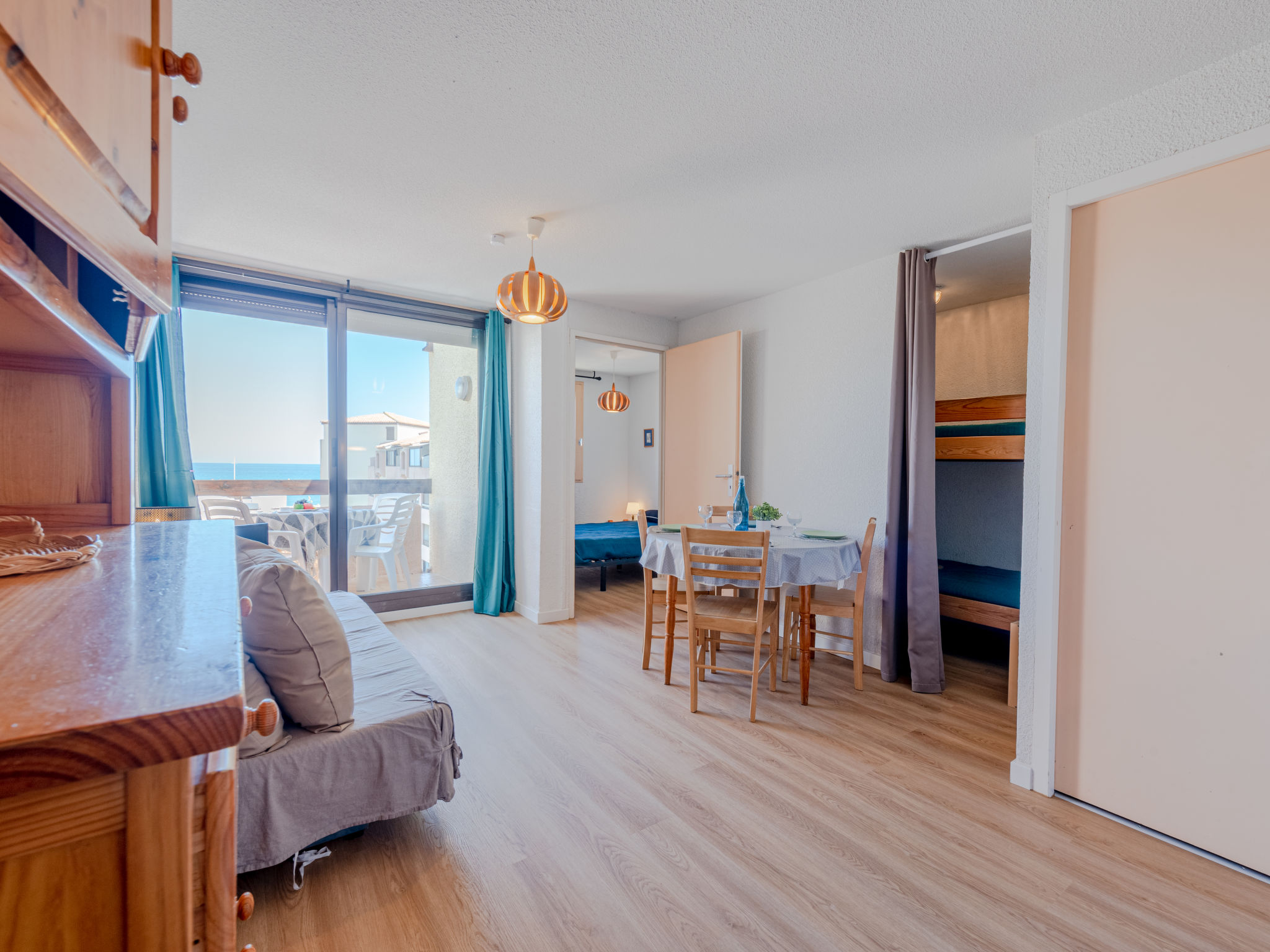 Residenz "Front de Mer", auf 3 Stockwerken. Im Ortsteil Grande Plage, belebte Lage, 50 m vom Meer, 50 m vom Strand. In der Anlage: Parkplatz. Einkaufsgeschäft, Einkaufszentrum, Restaurant 50 m. Nahe gelegene Sehenswürdigkeiten: Aqualand Port Leucate 7 km, Réserve Africaine de Sigean 41 km, site des dosses 4 m, téléski nautique 5 m. Bekannte Seen in der Umgebung sind gut erreichbar: Etang de Leucate ou salses 11 km, Lac de Villeneuve de la Raho 28 km. Wandergebiete: Sentier du guetteur 8 km, la forteresse de salses 15 km, Sentier du littoral Collioure 40 km. Bitte beachten: In diesem Haus sind weitere Ferienwohnungen mietbar.