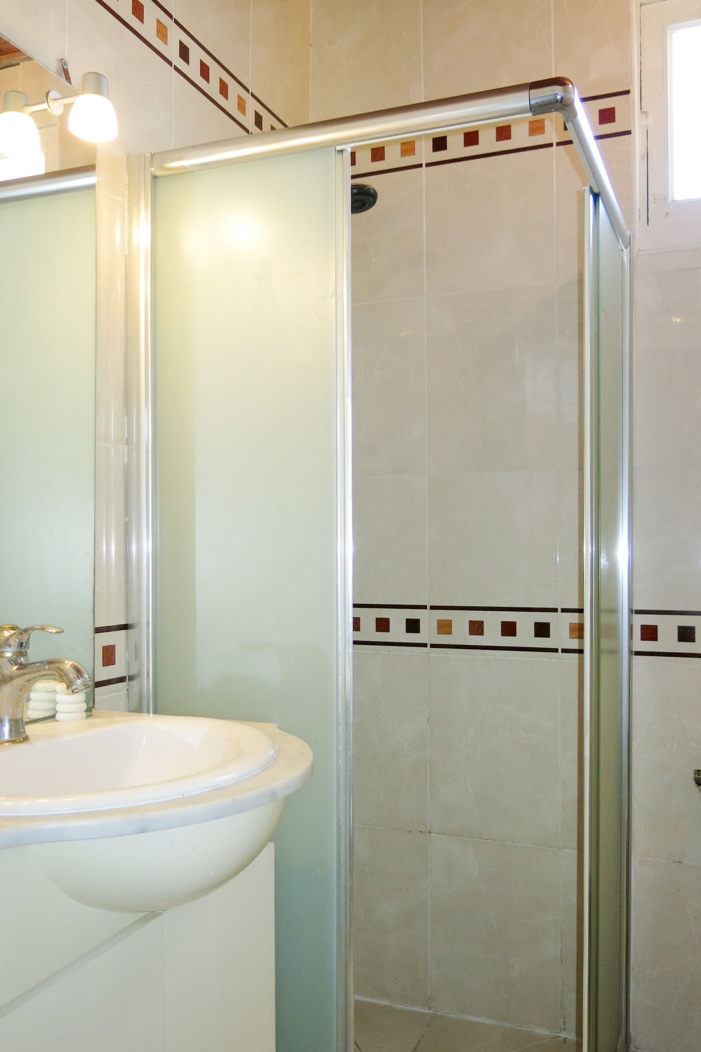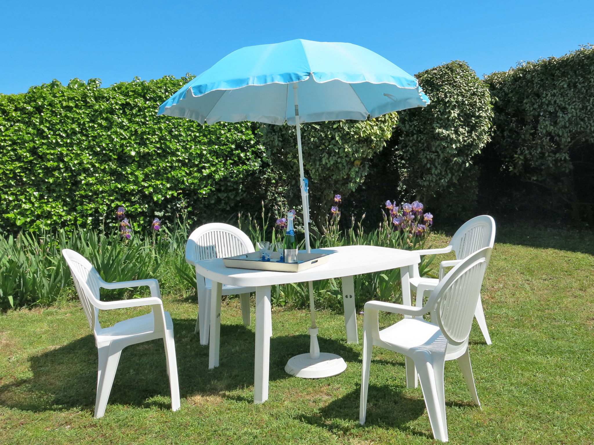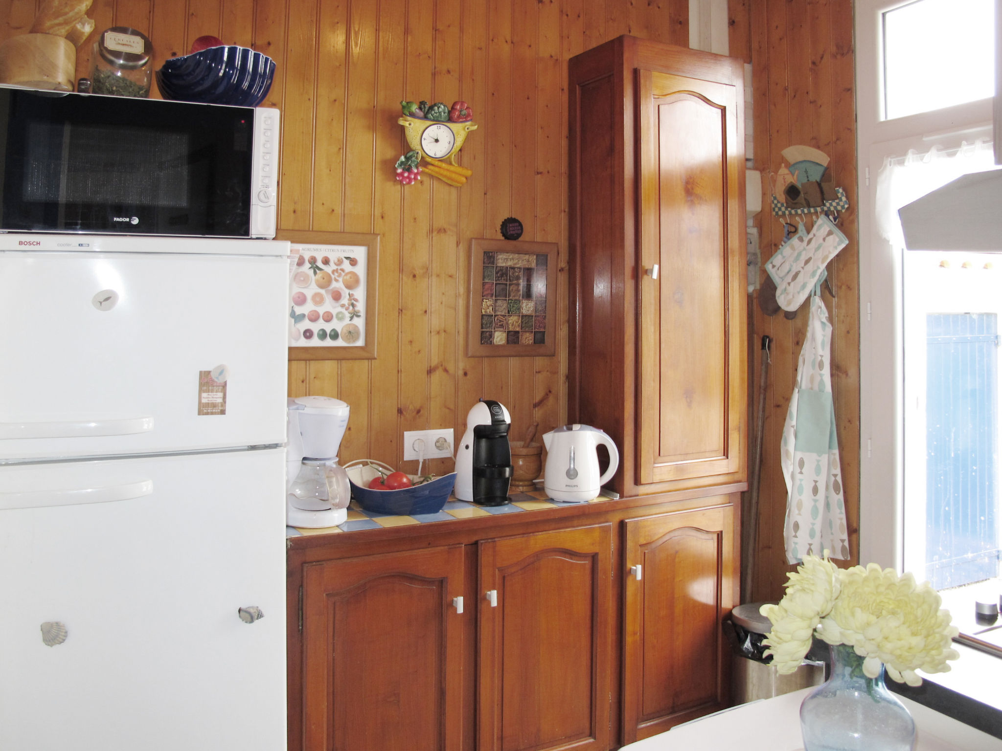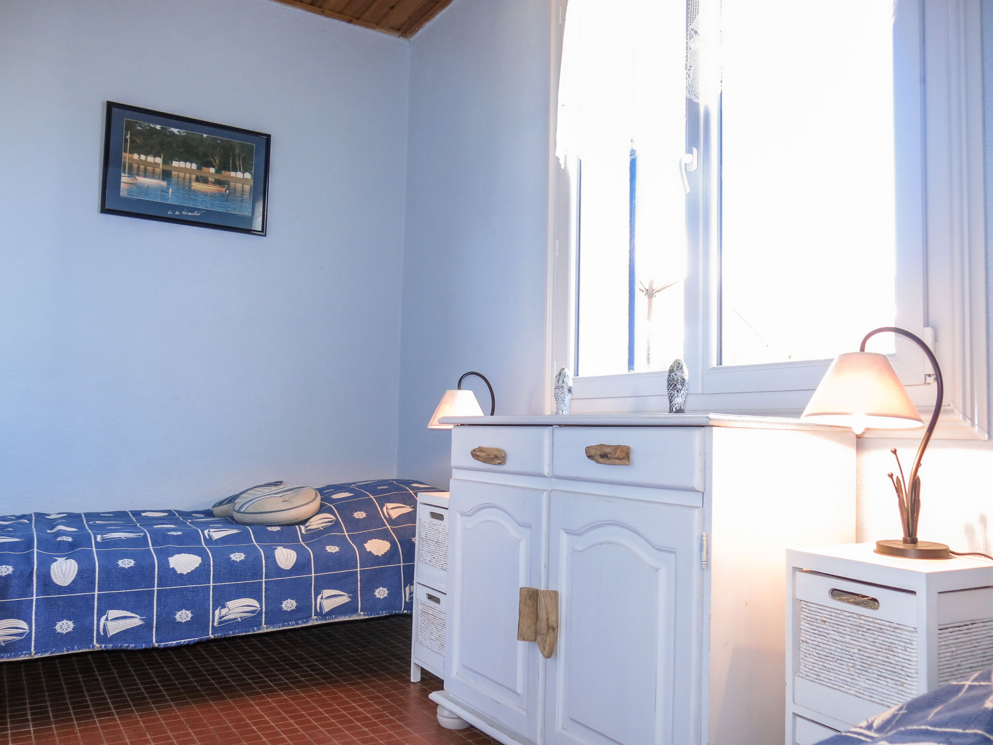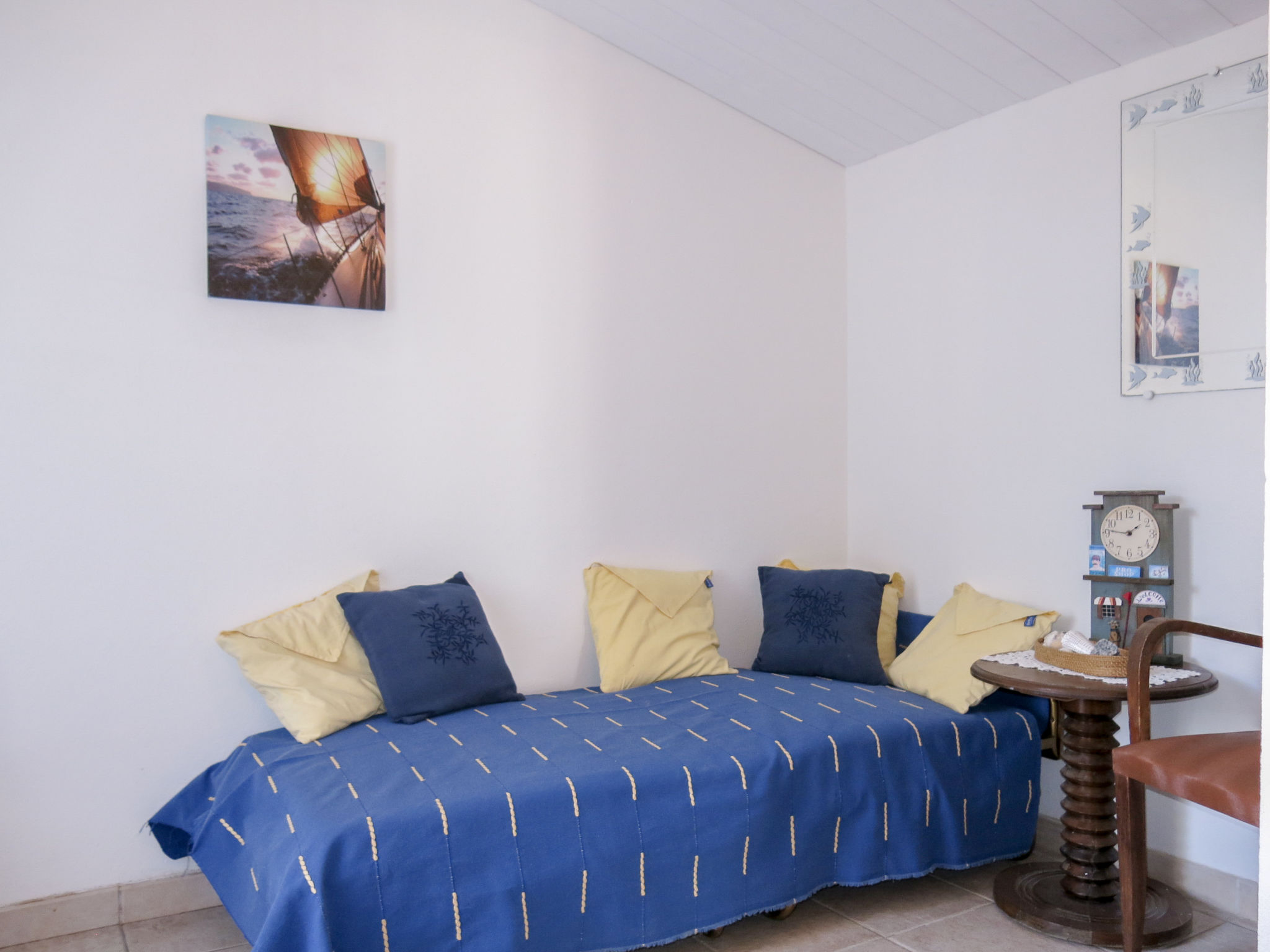 5-Zimmer-Haus, ca. 70 m². Wohnraum mit Sitzgruppe, Gartenausgang. Kleines Einzelzimmer, Terrassenausgang. Zwei Stufen höher: Esszimmer mit Terrassenausgang. Kleine Küche (2 Platten, Backofen, Mikrowelle, Kühlschrank, kleiner Gefrierschrank, Kaffeemaschine, Wasserkocher), Terrassenausgang. Doppelzimmer (Bett 1,60 m breit). Kleines Zweibettzimmer. Dusche/WC. Inserat einer Privatperson nach Artikel 155, IV, CGI.