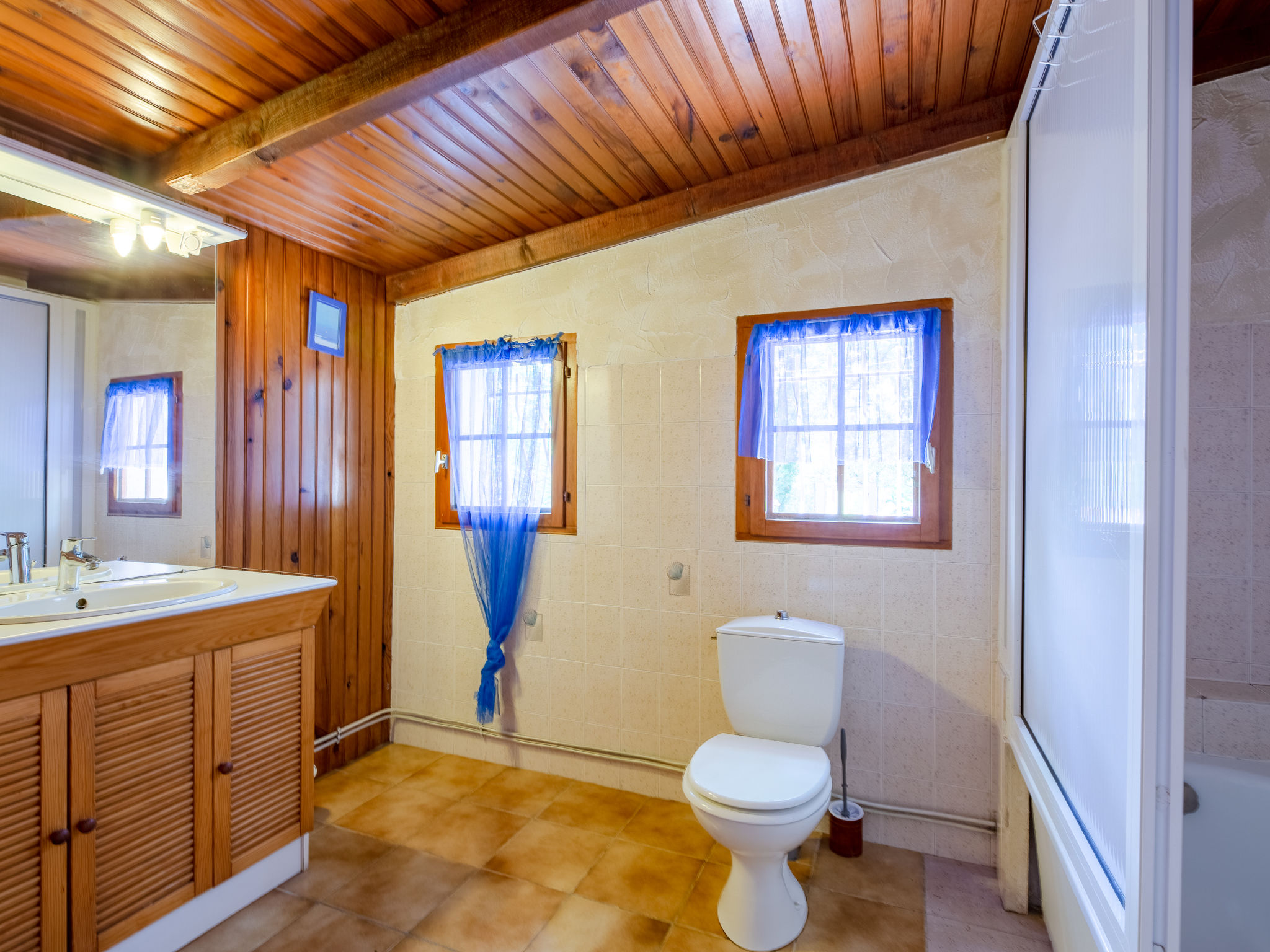 "Les Campaou (BSV100)", 2-Zimmer-Haus 50 m2. Renoviert im Jahre 2006, rustikal eingerichtet: Wohn-/Schlafzimmer mit 1 Doppeldiwanbett und offenem Kamin (nur Deko), Esstisch und Sat-TV. Ausgang zur Terrasse. 1 Zimmer mit 1 franz. Bett. Schlafnische mit 1 x 2 Etagenbetten. Offene Küche (4 Flammen, Mikrowelle, Tiefkühler). Bad/WC. Solarstrom Keine Heizmöglichkeit. Gartensitzplatz. Terrassenmöbel, Liegestühle. Zur Verfügung: Waschmaschine, Kinderhochstuhl, Babybett. Bitte beachten: Maximal 2 Haustiere/Hunde erlaubt. Rauchmelder. Inserat eines gewerblichen Vermieters nach Artikel 155, IV, CGI
