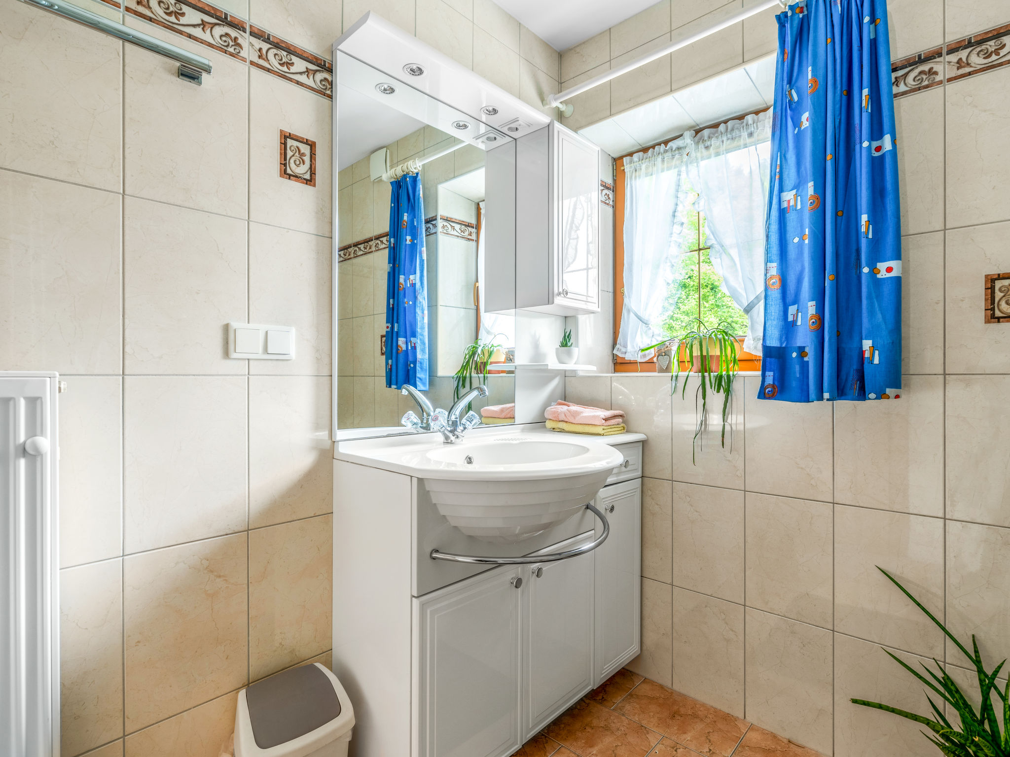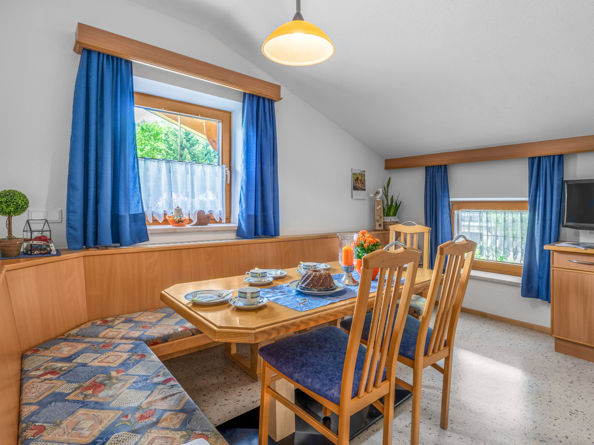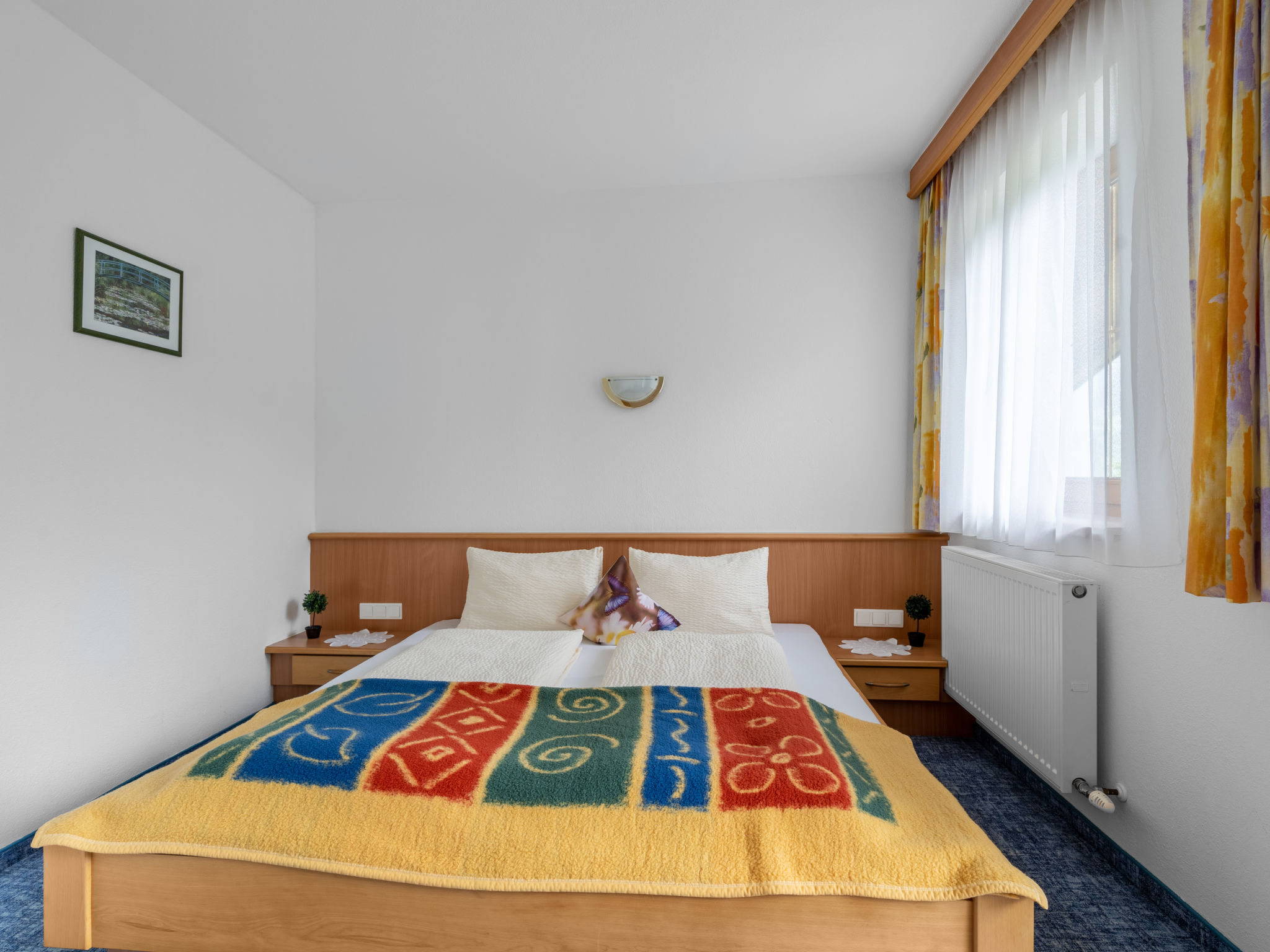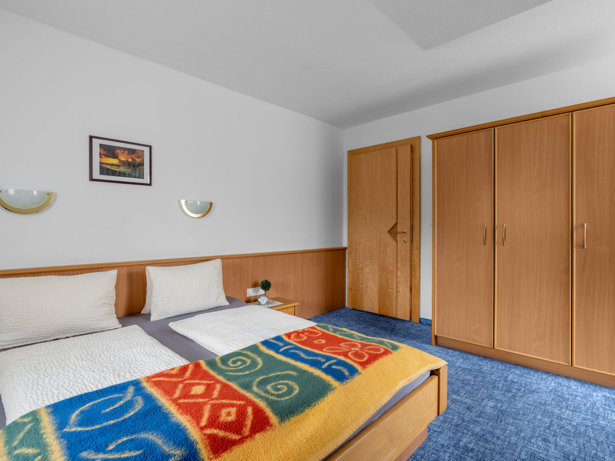 4-Zimmer-Wohnung, 1. Etage, ca. 90 m². Wohnküche (4 Ceranfelder, Backofen, Geschirrspüler, Kühlschrank, Kaffeemaschine, Wasserkocher, Toaster) mit Essplatz. Schlafzimmer mit Doppelbett und Einzelbett. Doppelzimmer. Zweibettzimmer. Alle Schlafzimmer mit Balkonausgang. Bad. Sep.WC. Bei Belegung mit weniger Personen als der maximalen Personenzahl stehen nicht alle Wohneinheiten zur Verfügung.