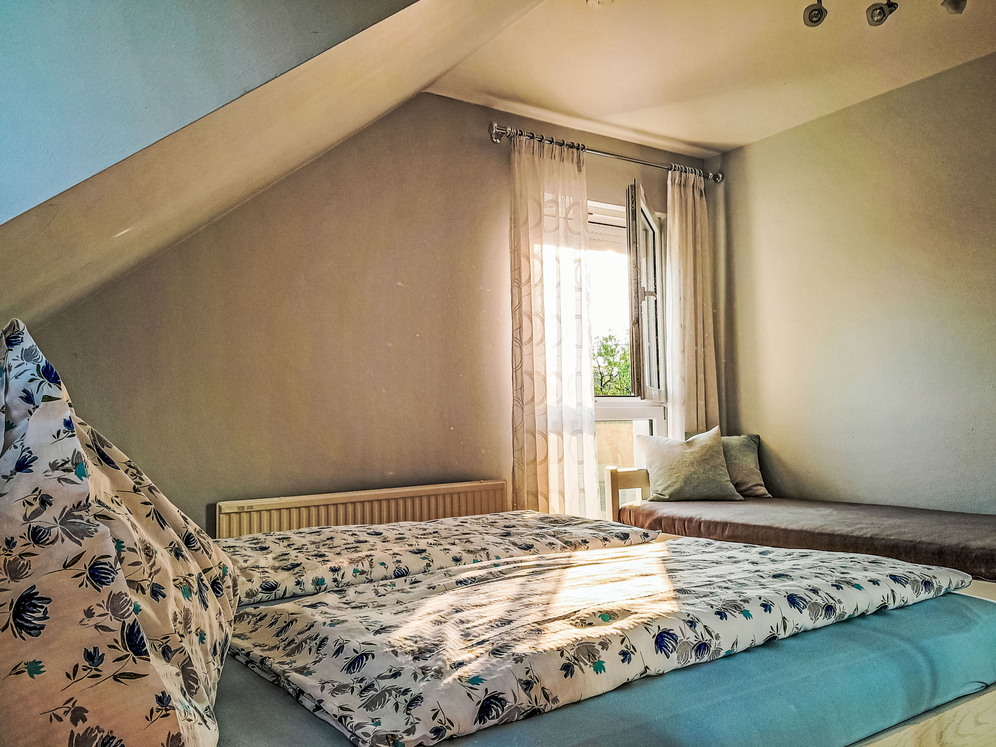 3-Zimmer-Haus 86 m2 auf 2 Stockwerken. Objekt geeignet für 6 Erwachsene + 2 Kinder. Hell, modern und gemütlich eingerichtet: Eingang. Wohn-/Esszimmer mit 1 Doppeldiwanbett, Schwedenofen, Esstisch und Sat-TV (Flachbildschirm), elektrischem Rollladen. Ausgang zur Terrasse. Offene Küche (Backofen, Geschirrspüler, 4 Glaskeramikherd Platten, Mikrowelle, Tiefkühler, elektrische Kaffeemaschine). Dusche/WC. Dachgeschoss: abgeschrägt 2 Zimmer, jedes Zimmer mit 1 Bett und 1 Doppelbett. Bad, sep. WC. Terrassenmöbel, Liegestühle (4), Loggia, Abstellkammer. Zur Verfügung: Waschmaschine, Kinderhochstuhl, Babybett bis 2 Jahre, Haartrockner. Internet (Wireless LAN). Bitte beachten: geeignet für Familien. Nichtraucher-Haus. Nespressomaschine vorhanden. Im Garten befindet sich noch ein kleines Badehäuschen zum Umziehen. Inkludiert ist die Mitbenutzung des privaten Badeareals (1200 qm) der Anrainer mit 25 Meter Seeuferlänge. 1 Standup paddel ist kostenlos nutzbar. Bei Belegung mit weniger Personen als der maximalen Personenzahl stehen nicht alle Wohneinheiten zur Verfügung.