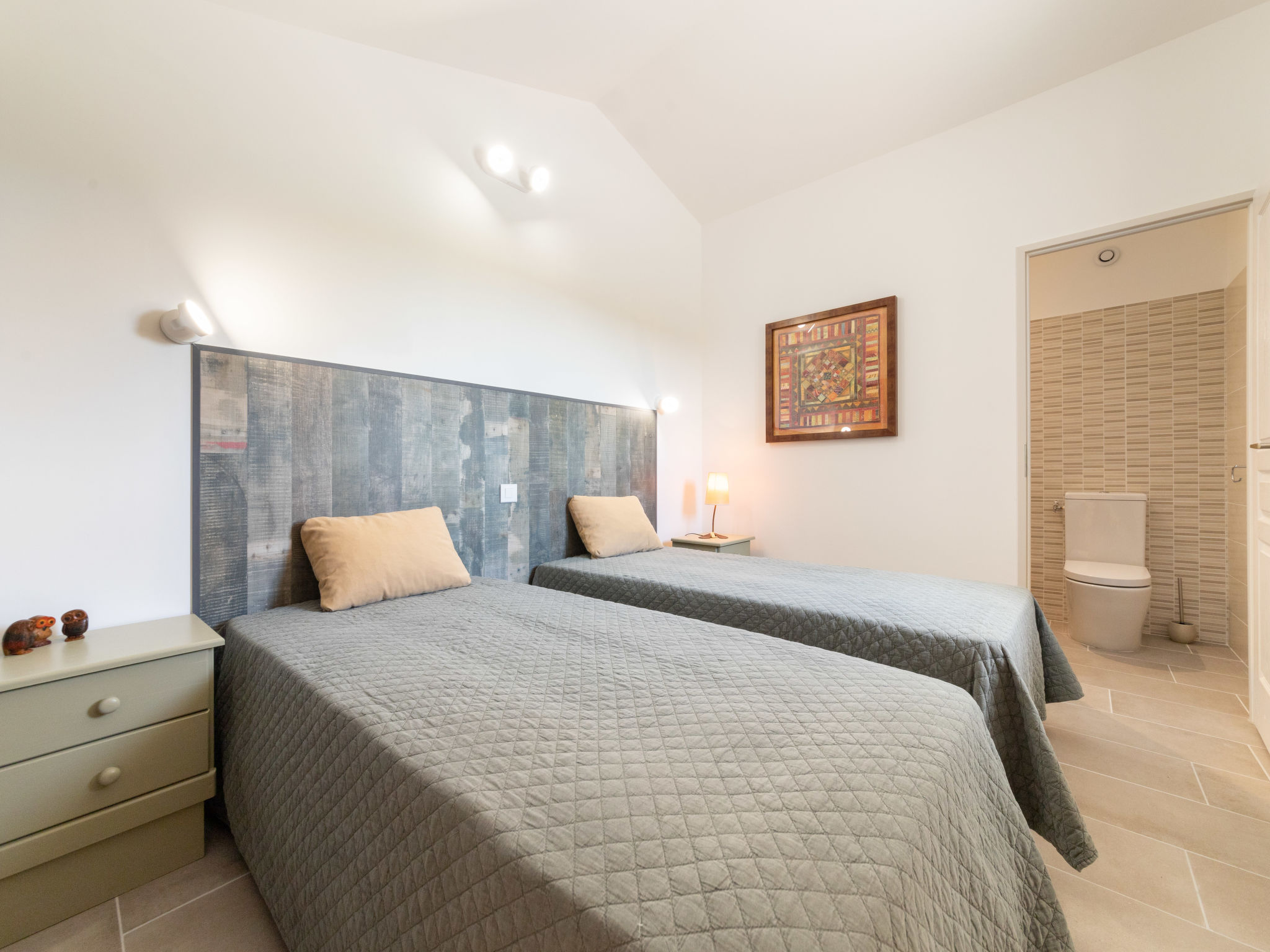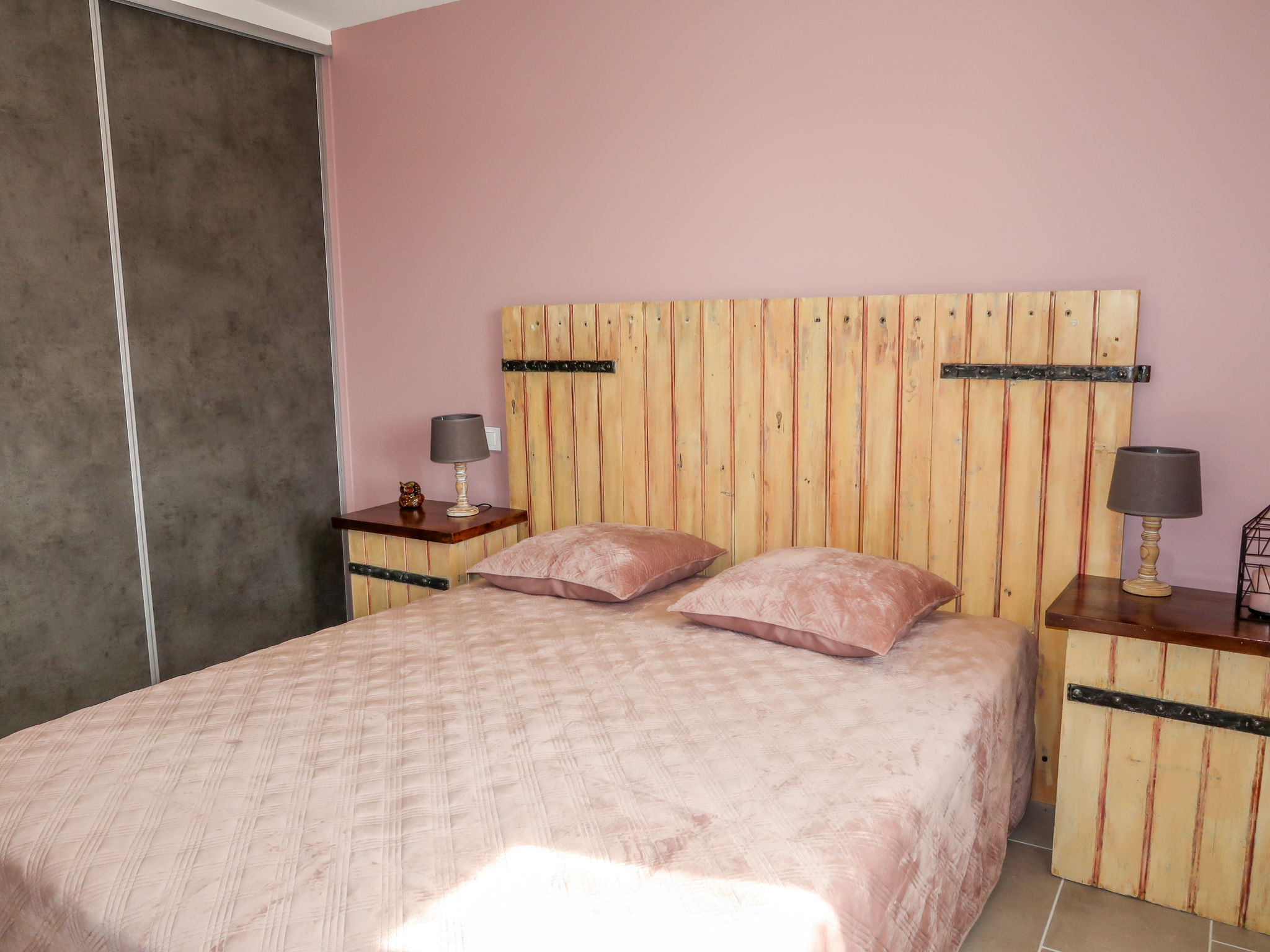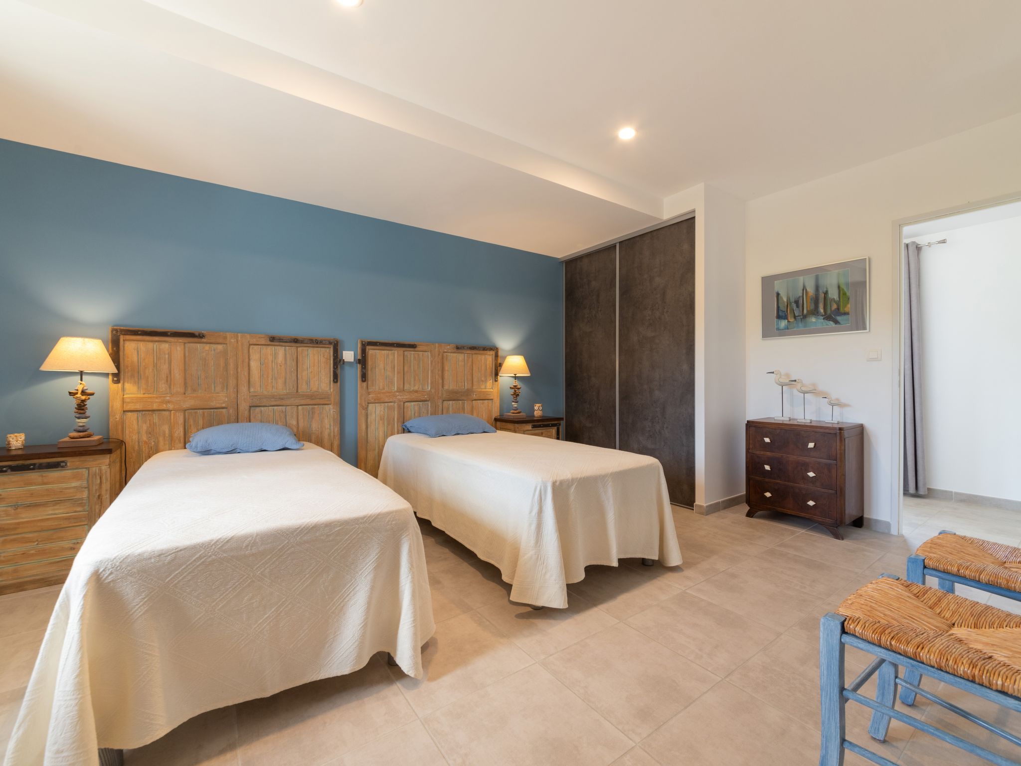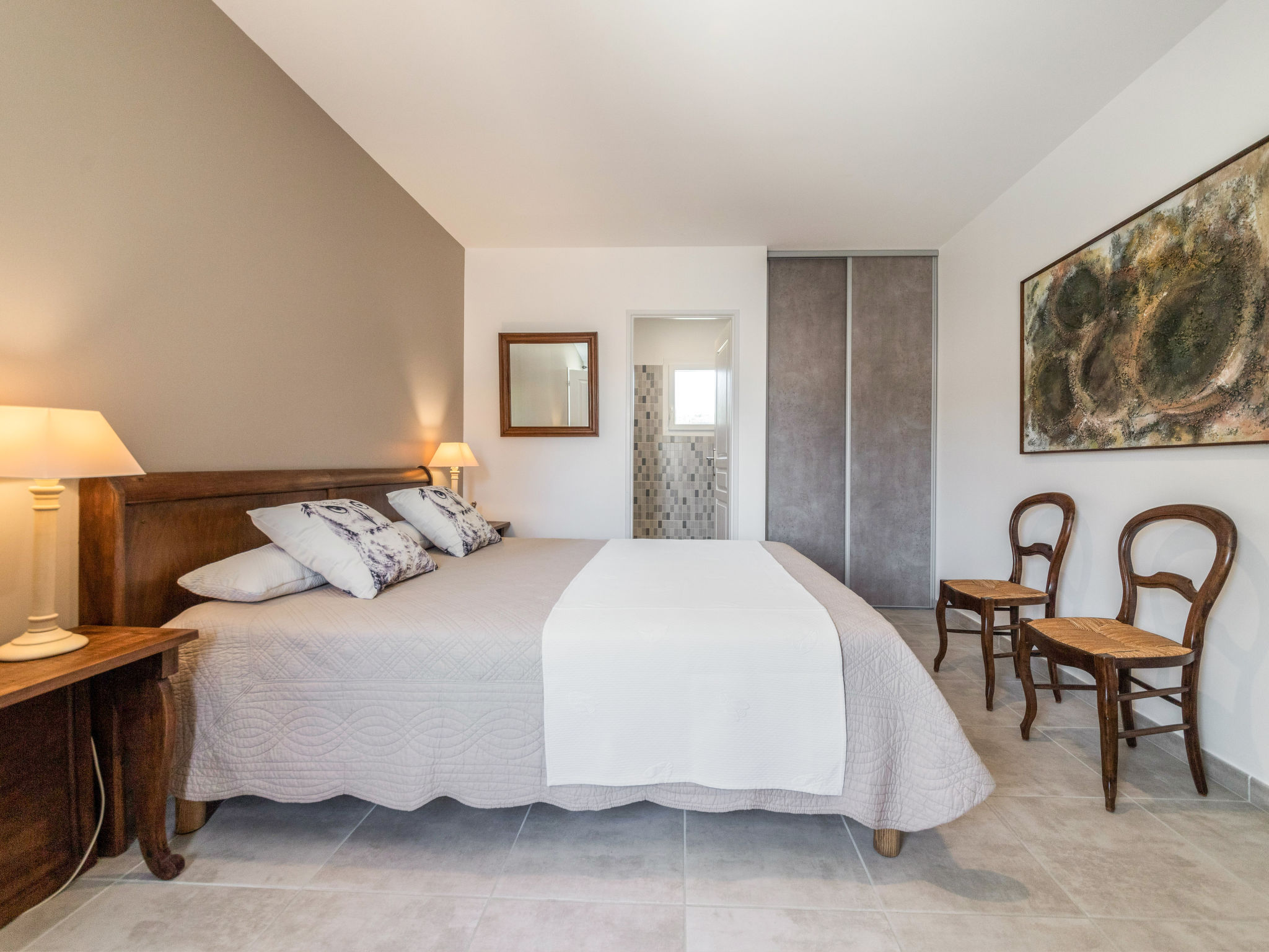 9-Zimmer-Haus, 2 Etagen, ca. 270 m². Über einige Stufen zum Eingang. Hauptgebäude: Erdgeschoss: Großer Wohnraum mit Sitzgruppe, Terrassenausgang. Großes Esszimmer, Terrassenausgang. Zum Wohnraum und Esszimmer offene Küche (5 Ceranfelder, Backofen, Mikrowelle, Geschirrspüler, Kühlschrank, Gefrierschrank, Kaffeemaschine, Wasserkocher, Toaster, weiterer Kühlschrank in angrenzendem Abstellraum). Schlafzimmer mit franz. Bett (1,60 m breit) und Dusche/WC. Sep.WC. Vom Wohnraum Treppe (kein Geländer, nur Handlauf) ins Obergeschoss: Weiterer Wohnraum mit Sitzgruppe. Schlafzimmer mit franz. Bett (1,60 m breit) und Dusche/WC. 2 Zweibettzimmer. Dusche/Doppelwaschbecken/WC (zugänglich von beiden Zweibettzimmern). Über separaten Treppenaufgang vom Esszimmer ins Obergeschoss: Schlafzimmer mit franz. Bett (1,60 m breit), kleinem Ankleideraum und Bad/WC. Zweibettzimmer mit Dusche/WC. Hinweis: Bei Buchung zum Preis für 8 Personen stehen die beiden letztgenannten Schlafzimmer nicht zur Verfügung. Nebenhaus 4 Personen : Separater Eingang ins Nebengebäude: Wohnraum mit Sitzcouch, Essplatz, Kochnische (2 Platten) und Terrassenausgang. 2 Schlafzimmer, jeweils mit franz. Bett. 2x Dusche. 2x WC. Im Falle einer Reservierung für 4 Personen bleibt das Haupthaus geschlossen. Bei Belegung mit weniger Personen als der maximalen Personenzahl stehen nicht alle Wohneinheiten zur Verfügung. Bei Belegung mit weniger Personen als der maximalen Personenzahl stehen nicht alle Schlafzimmer zur Verfügung. Inserat einer Privatperson nach Artikel 155, IV, CGI.