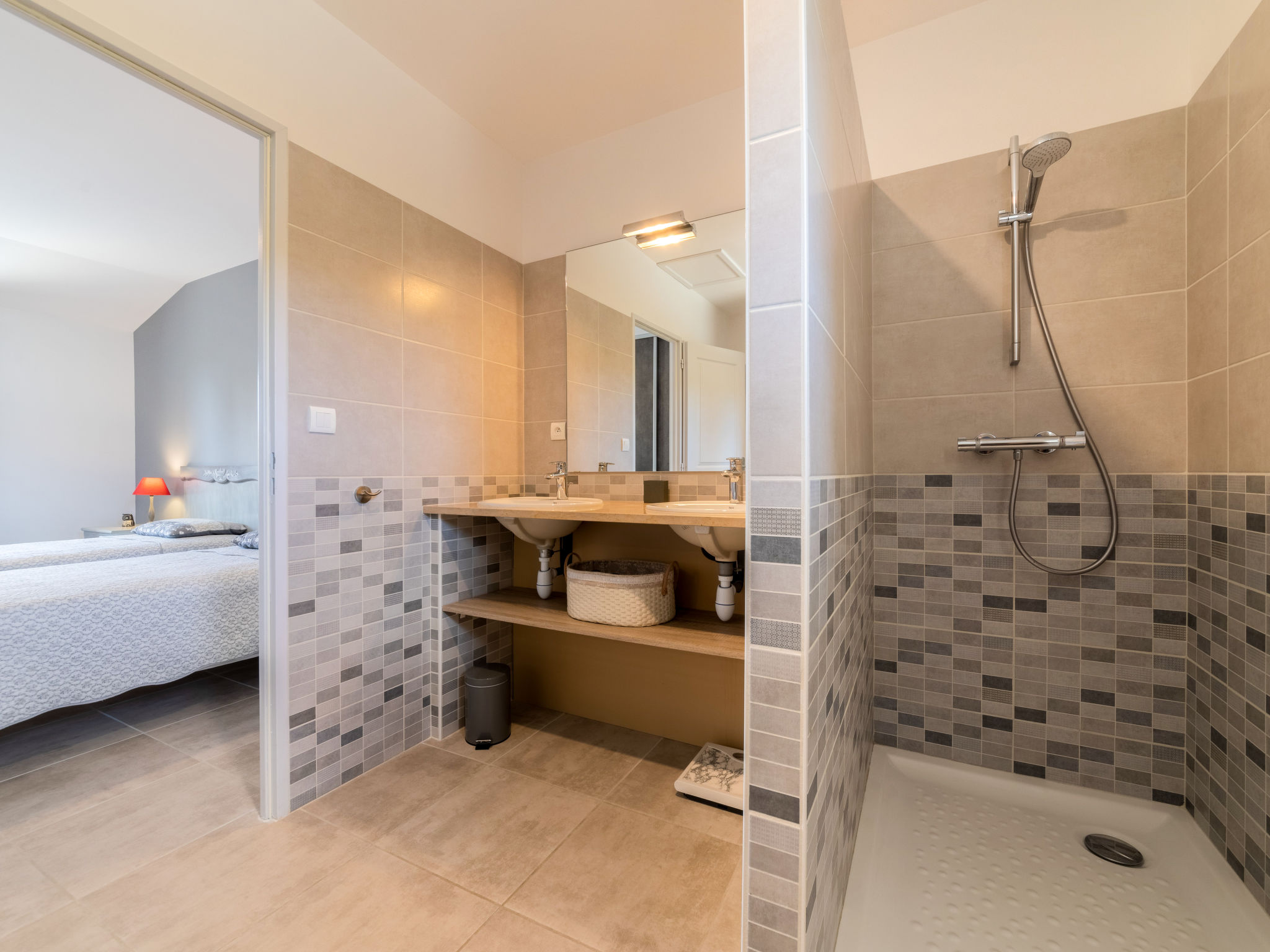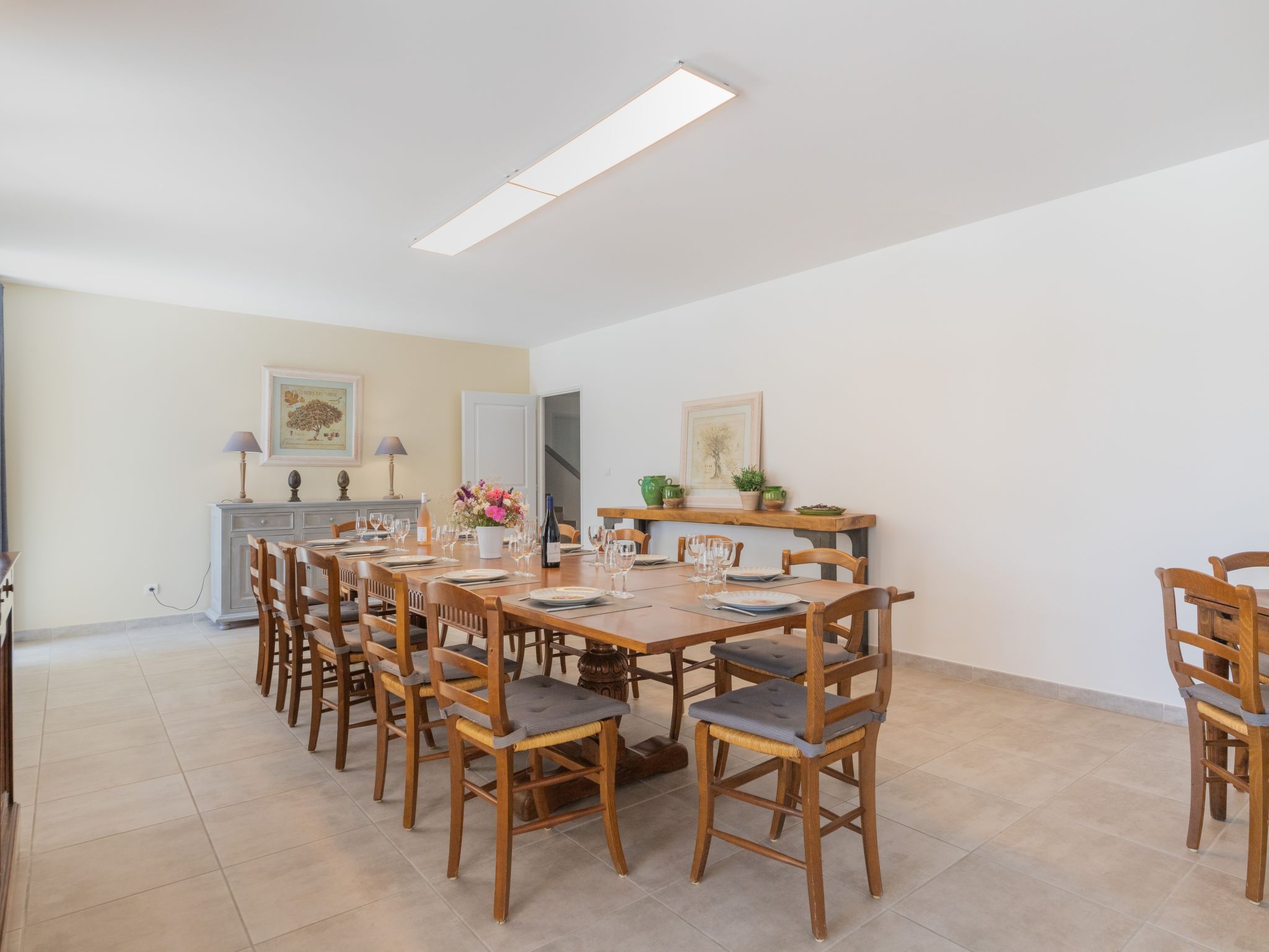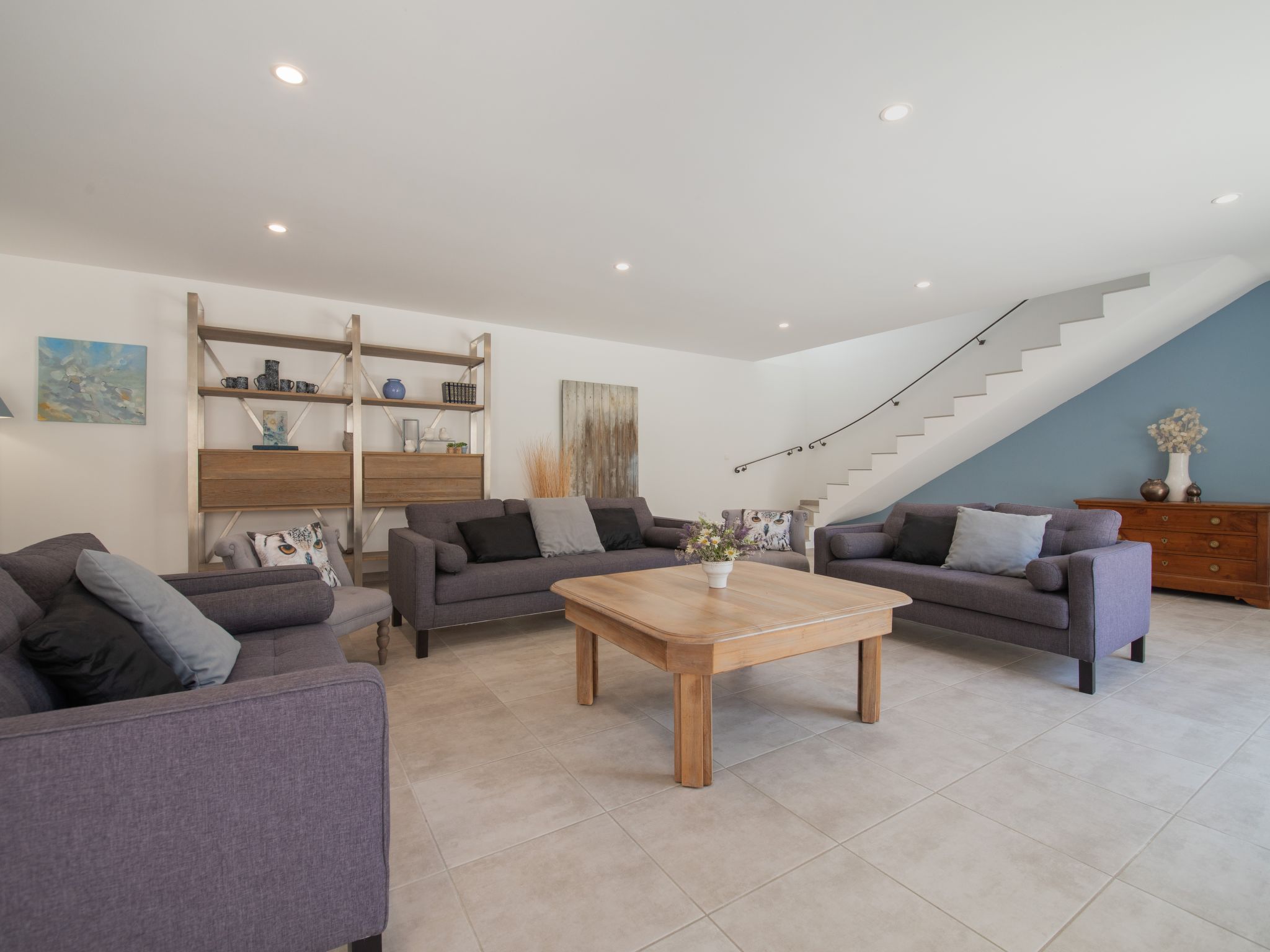9-Zimmer-Haus, 2 Etagen, ca. 270 m². Über einige Stufen zum Eingang. Hauptgebäude: Erdgeschoss: Großer Wohnraum mit Sitzgruppe, Terrassenausgang. Großes Esszimmer, Terrassenausgang. Zum Wohnraum und Esszimmer offene Küche (5 Ceranfelder, Backofen, Mikrowelle, Geschirrspüler, Kühlschrank, Gefrierschrank, Kaffeemaschine, Wasserkocher, Toaster, weiterer Kühlschrank in angrenzendem Abstellraum). Schlafzimmer mit franz. Bett (1,60 m breit) und Dusche/WC. Sep.WC. Vom Wohnraum Treppe (kein Geländer, nur Handlauf) ins Obergeschoss: Weiterer Wohnraum mit Sitzgruppe. Schlafzimmer mit franz. Bett (1,60 m breit) und Dusche/WC. 2 Zweibettzimmer. Dusche/Doppelwaschbecken/WC (zugänglich von beiden Zweibettzimmern). Über separaten Treppenaufgang vom Esszimmer ins Obergeschoss: Schlafzimmer mit franz. Bett (1,60 m breit), kleinem Ankleideraum und Bad/WC. Zweibettzimmer mit Dusche/WC. Hinweis: Bei Buchung zum Preis für 8 Personen stehen die beiden letztgenannten Schlafzimmer nicht zur Verfügung. Nebenhaus 4 Personen : Separater Eingang ins Nebengebäude: Wohnraum mit Sitzcouch, Essplatz, Kochnische (2 Platten) und Terrassenausgang. 2 Schlafzimmer, jeweils mit franz. Bett. 2x Dusche. 2x WC. Im Falle einer Reservierung für 4 Personen bleibt das Haupthaus geschlossen. Bei Belegung mit weniger Personen als der maximalen Personenzahl stehen nicht alle Wohneinheiten zur Verfügung. Bei Belegung mit weniger Personen als der maximalen Personenzahl stehen nicht alle Schlafzimmer zur Verfügung. Inserat einer Privatperson nach Artikel 155, IV, CGI.