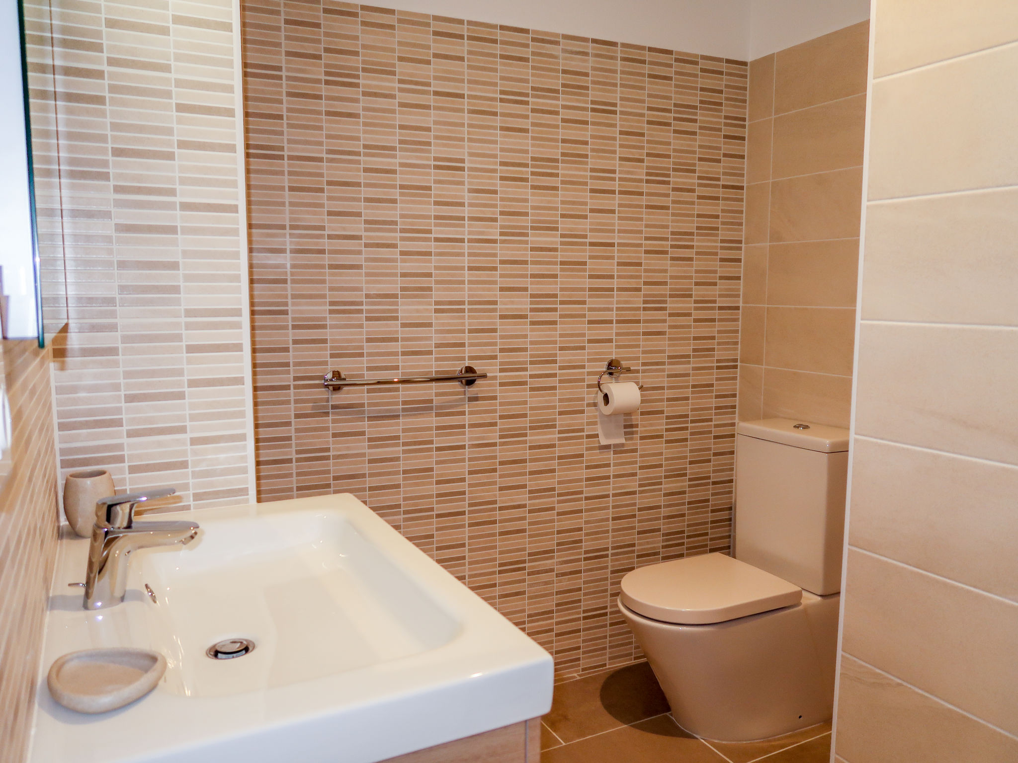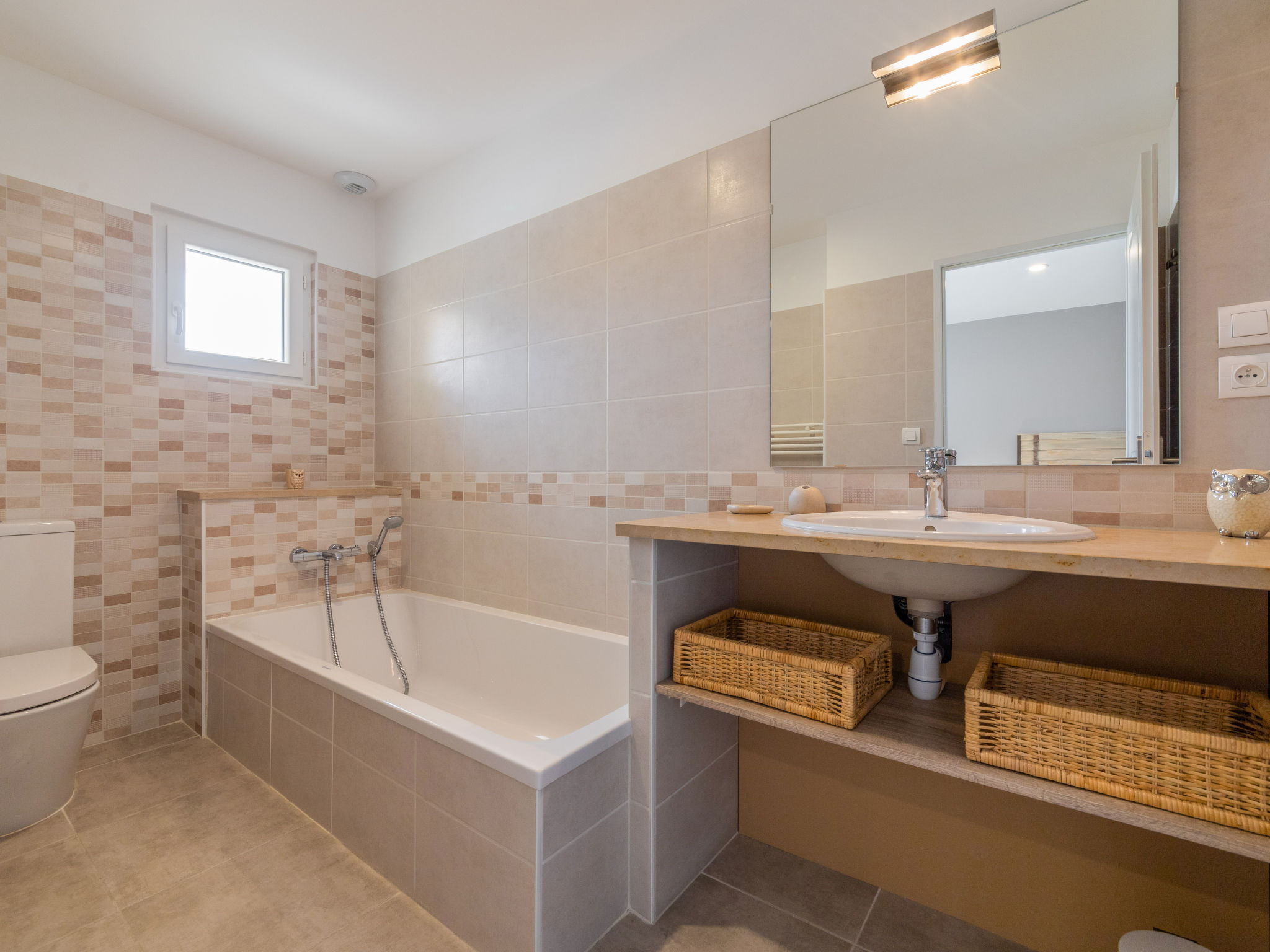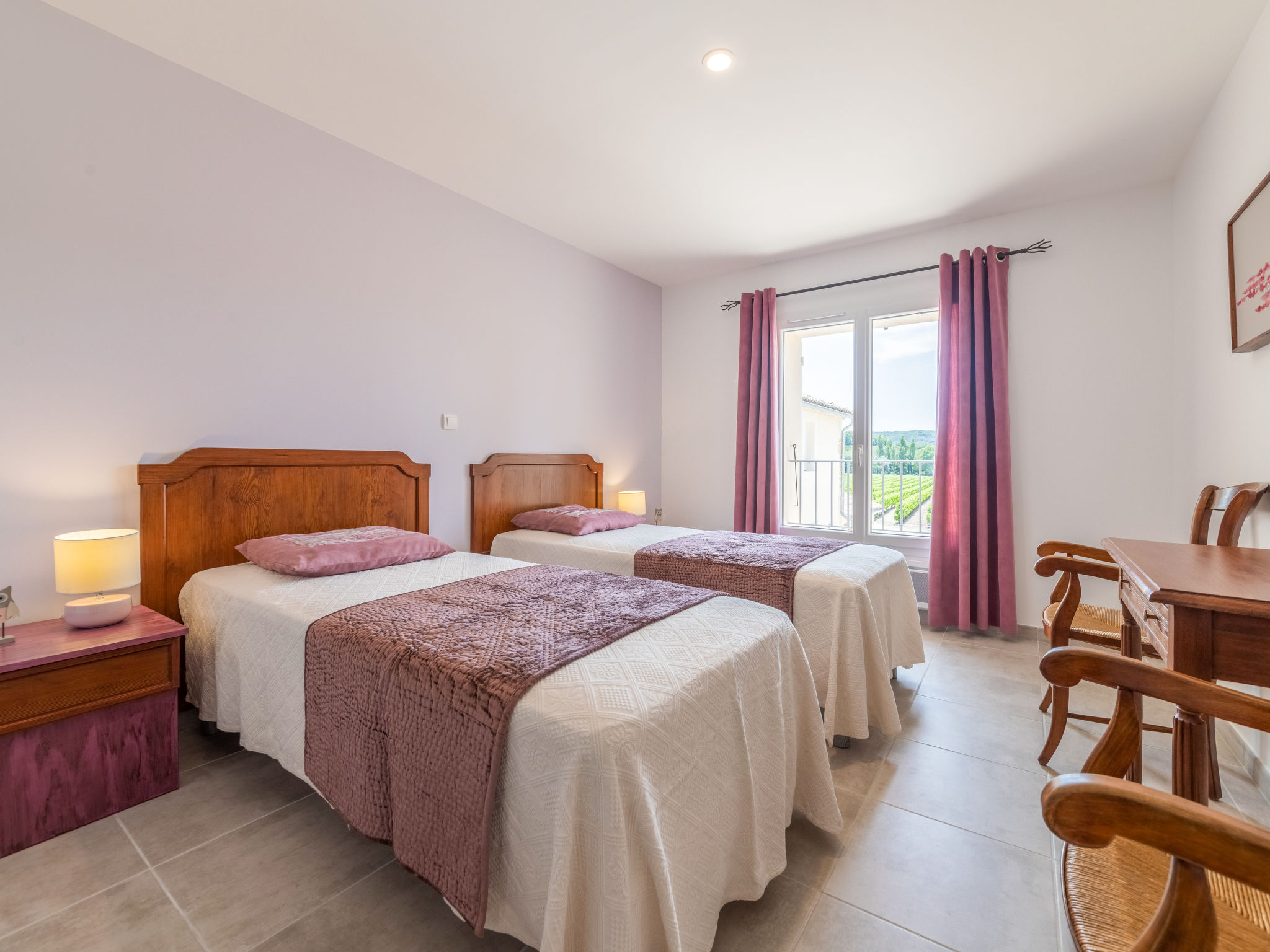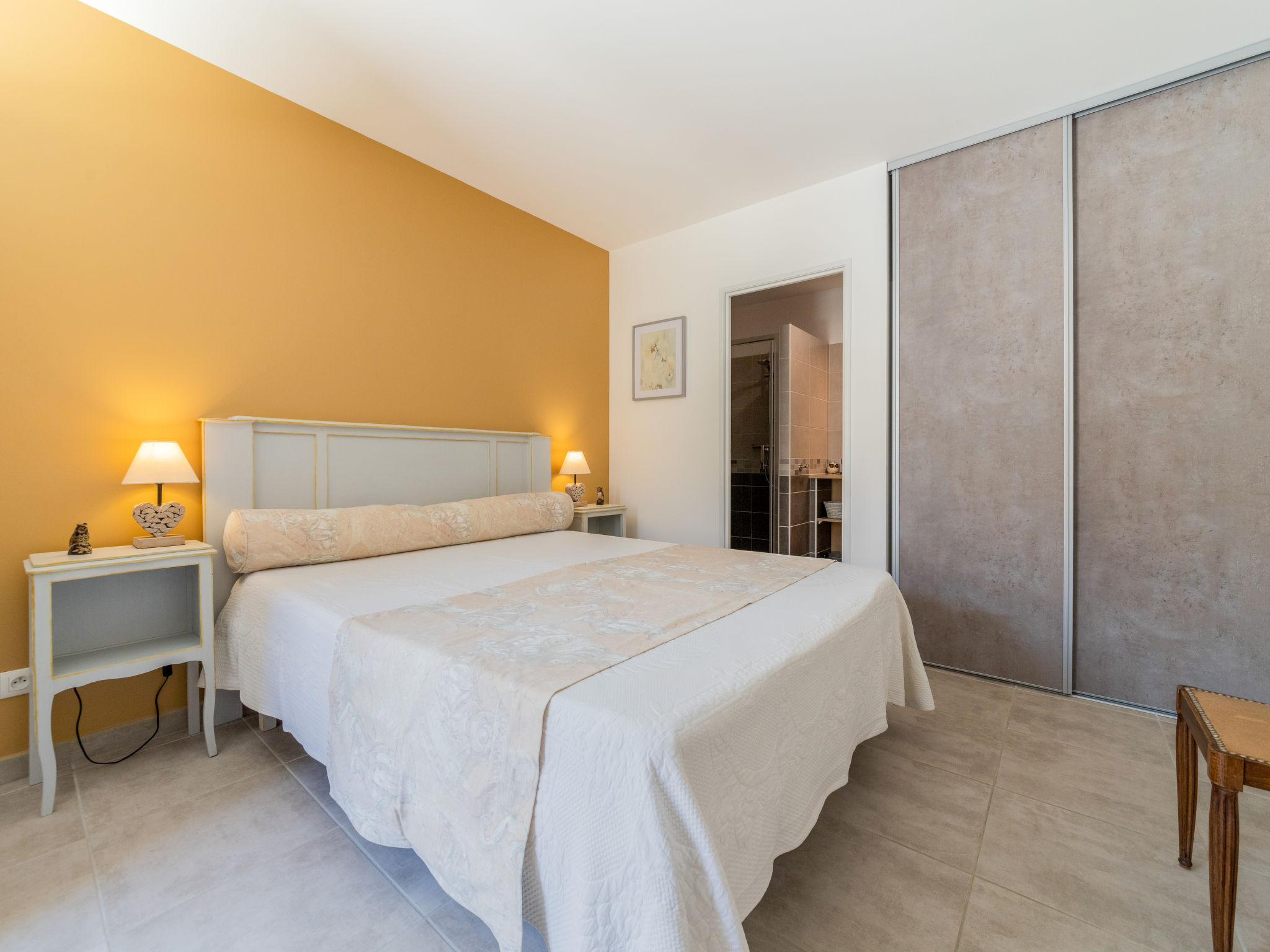 9-Zimmer-Haus, 2 Etagen, ca. 270 m². Über einige Stufen zum Eingang. Hauptgebäude: Erdgeschoss: Großer Wohnraum mit Sitzgruppe, Terrassenausgang. Großes Esszimmer, Terrassenausgang. Zum Wohnraum und Esszimmer offene Küche (5 Ceranfelder, Backofen, Mikrowelle, Geschirrspüler, Kühlschrank, Gefrierschrank, Kaffeemaschine, Wasserkocher, Toaster, weiterer Kühlschrank in angrenzendem Abstellraum). Schlafzimmer mit franz. Bett (1,60 m breit) und Dusche/WC. Sep.WC. Vom Wohnraum Treppe (kein Geländer, nur Handlauf) ins Obergeschoss: Weiterer Wohnraum mit Sitzgruppe. Schlafzimmer mit franz. Bett (1,60 m breit) und Dusche/WC. 2 Zweibettzimmer. Dusche/Doppelwaschbecken/WC (zugänglich von beiden Zweibettzimmern). Über separaten Treppenaufgang vom Esszimmer ins Obergeschoss: Schlafzimmer mit franz. Bett (1,60 m breit), kleinem Ankleideraum und Bad/WC. Zweibettzimmer mit Dusche/WC. Hinweis: Bei Buchung zum Preis für 8 Personen stehen die beiden letztgenannten Schlafzimmer nicht zur Verfügung. Nebenhaus 4 Personen : Separater Eingang ins Nebengebäude: Wohnraum mit Sitzcouch, Essplatz, Kochnische (2 Platten) und Terrassenausgang. 2 Schlafzimmer, jeweils mit franz. Bett. 2x Dusche. 2x WC. Im Falle einer Reservierung für 4 Personen bleibt das Haupthaus geschlossen. Bei Belegung mit weniger Personen als der maximalen Personenzahl stehen nicht alle Wohneinheiten zur Verfügung. Bei Belegung mit weniger Personen als der maximalen Personenzahl stehen nicht alle Schlafzimmer zur Verfügung. Inserat einer Privatperson nach Artikel 155, IV, CGI.