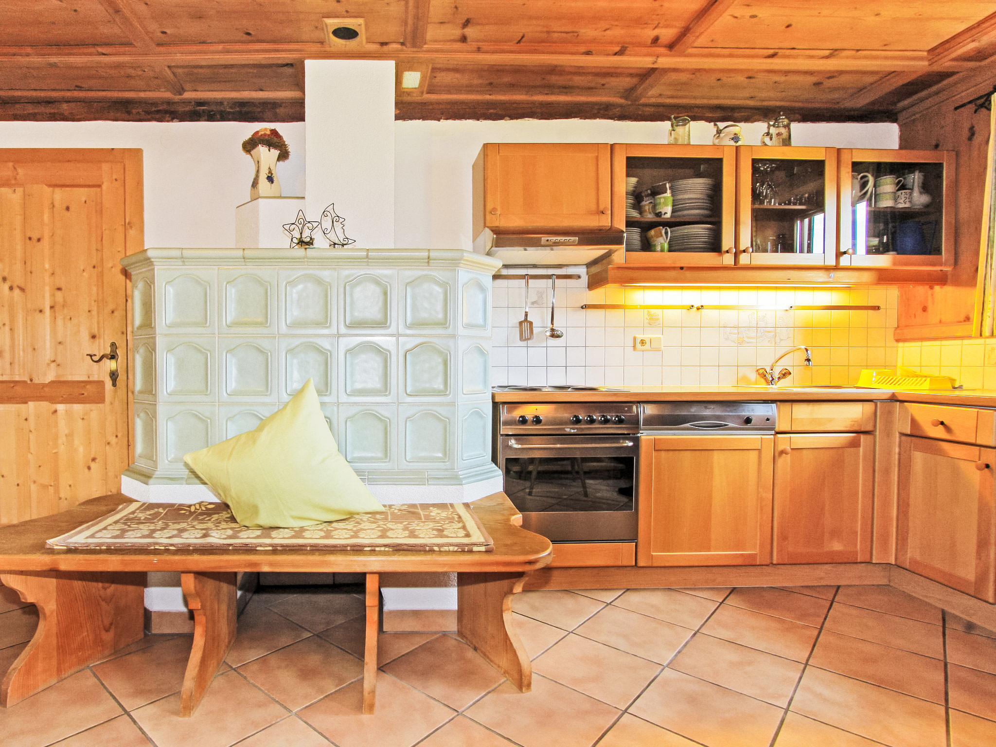 4-Zimmer-Haus 75 m2 auf 2 Stockwerken. Gemütlich und mit viel Holz eingerichtet: Eingang. Wohnküche (Backofen, Geschirrspüler, 4 Glaskeramikherd Platten, Mikrowelle, Grill, elektrische Kaffeemaschine) mit Essecke, Sat-TV, Radio und Kachelofen. Ausgang zum Garten. Dusche, sep. WC, Doppelwaschbecken. Obergeschoss: 1 Doppelzimmer. 1 Zimmer mit 2 Betten. 1 Zimmer mit 1 x 2 Etagenbetten. Parkettböden. Terrasse. Liegestühle (4). Herrliche Panoramasicht auf die Berge und das Tal. Zur Verfügung: Waschmaschine, Haartrockner. Parkplatz (überdacht, 2 Autos). Saeco Espressomaschine verfügbar.