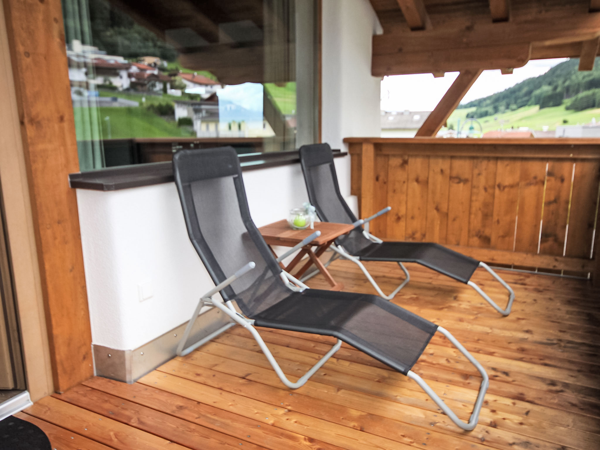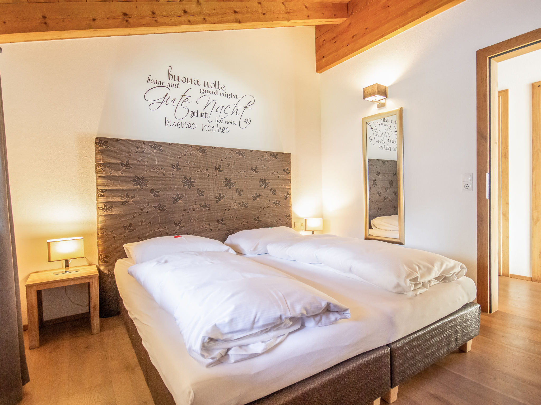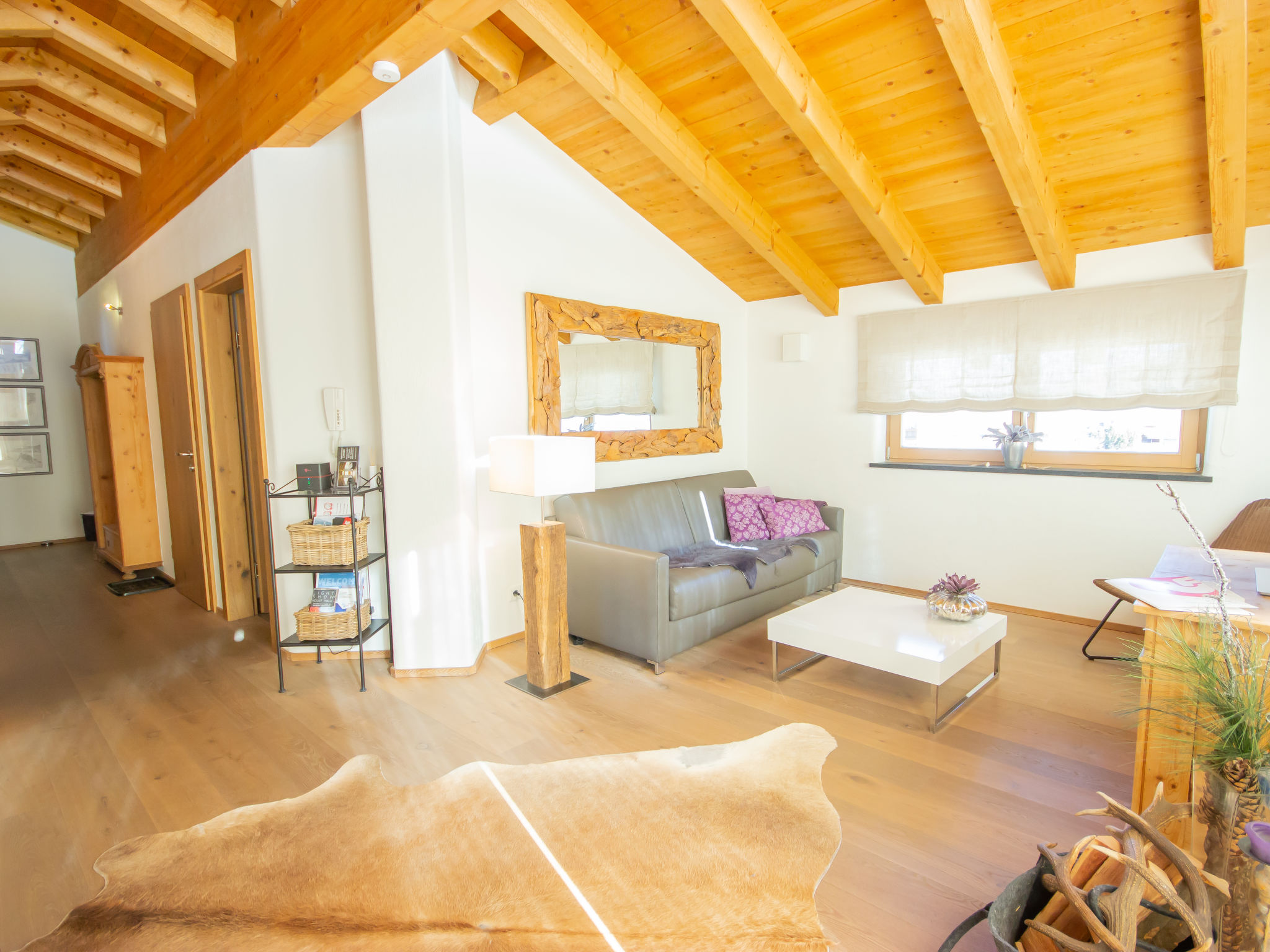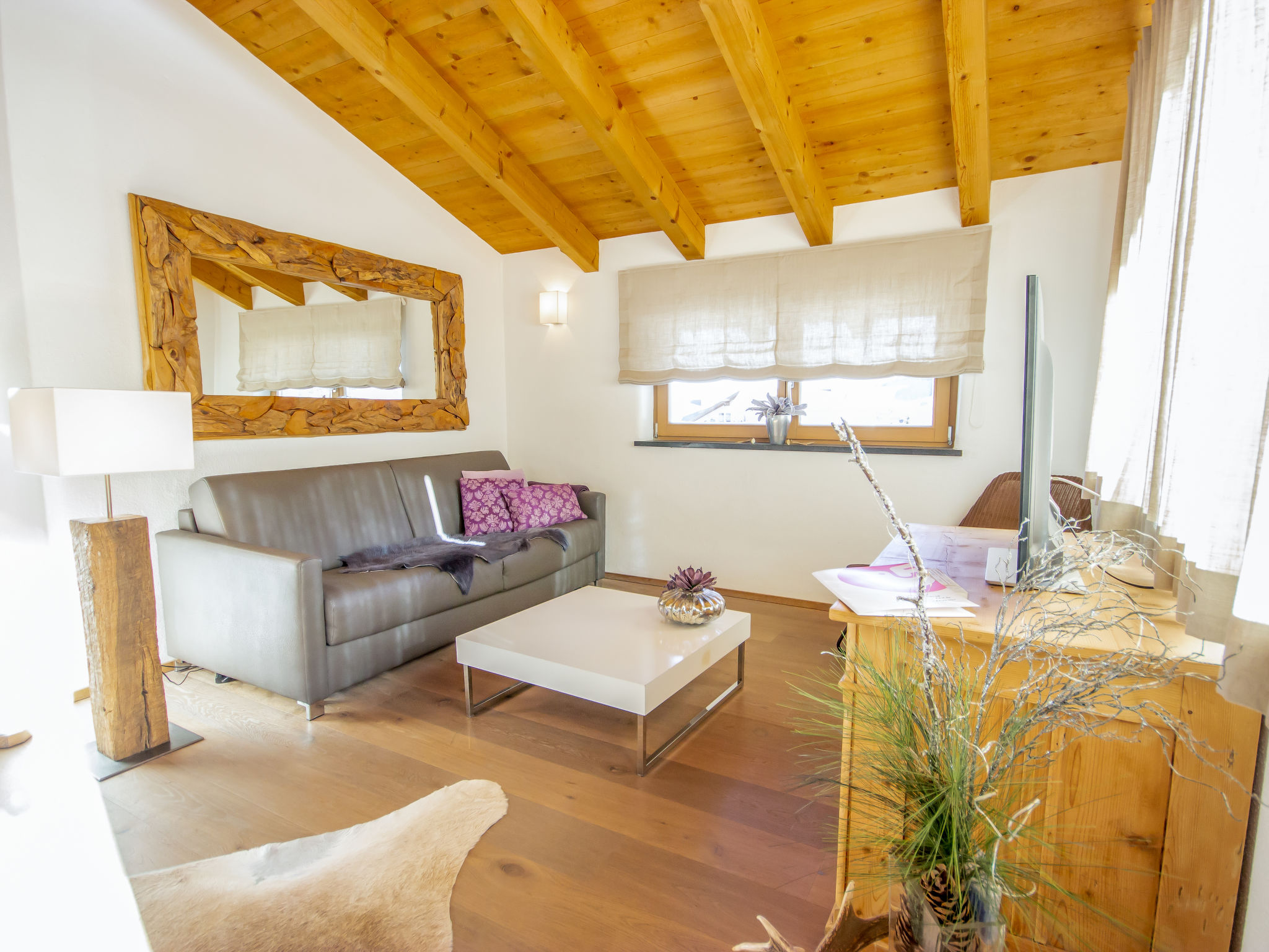 3-Zimmer-Wohnung 65 m2 im 1. Stock. Luxuriös und geschmackvoll eingerichtet: abgeschrägter Eingang, Deckenhöhe 380 cm mit Panoramafenster Richtung Süden. Wohn-/Esszimmer mit 1 Ausziehbett (2 Pers.), Esstisch und Sat-TV (Flachbildschirm). Ausgang zum Balkon. 2 Doppelzimmer. Offene Küche (Backofen, Geschirrspüler, 4 Glaskeramikherd Platten, Tiefkühler, elektrische Kaffeemaschine). Bad/Dusche/WC. Fussbodenheizung. Grosser Balkon 14 m2. Balkonmöbel. Schöne Panoramasicht auf die Berge. Zur Verfügung: Internet (Wireless LAN, gratis). Bitte beachten: Nichtraucher-Unterkunft. 1 Haustier/Hund erlaubt.