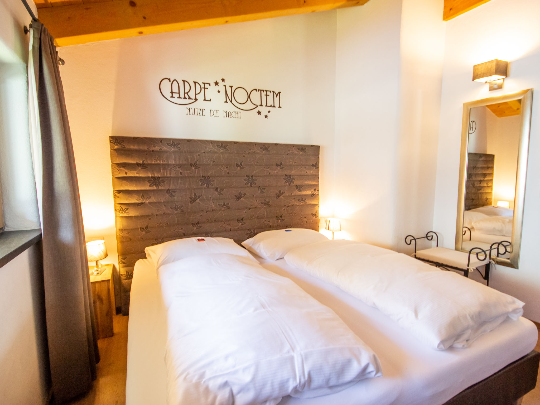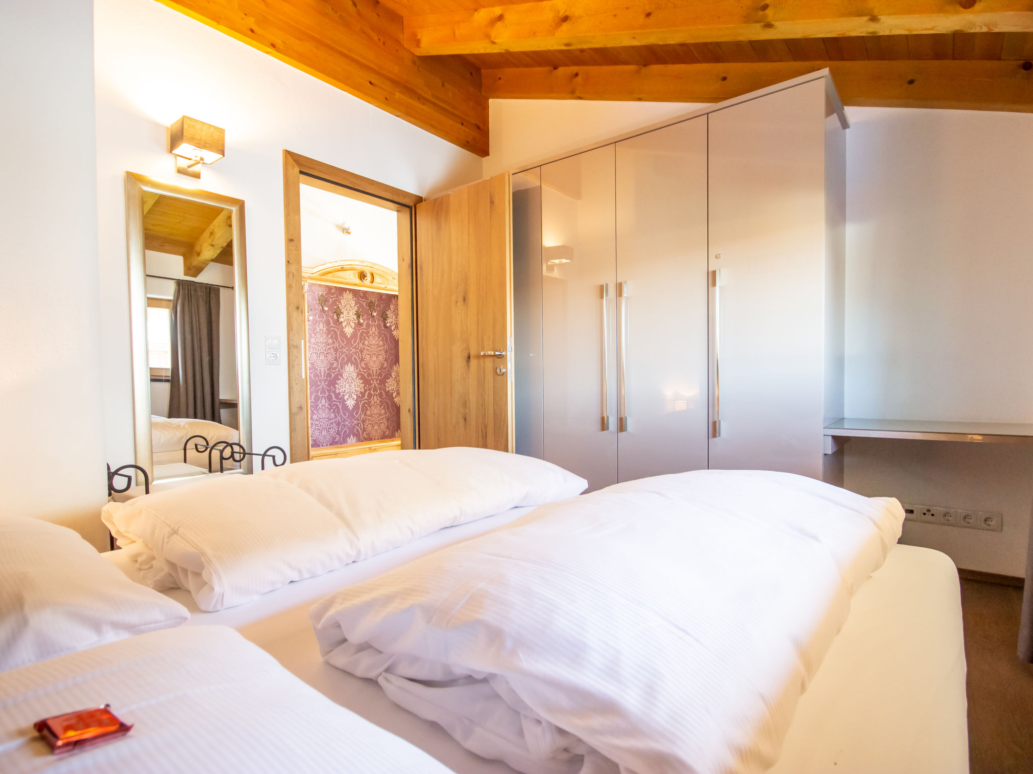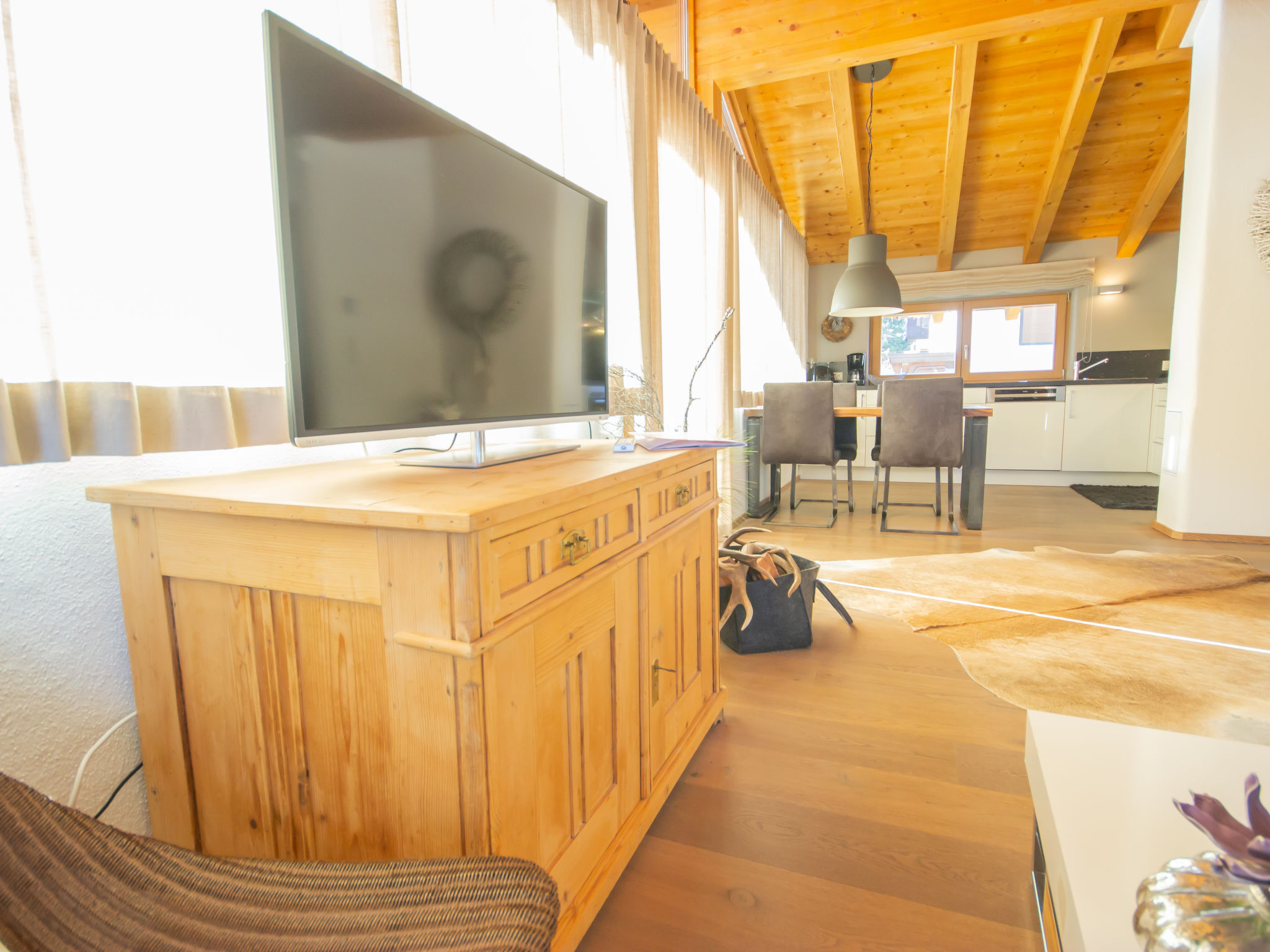 3-Zimmer-Wohnung 65 m2 im 1. Stock. Luxuriös und geschmackvoll eingerichtet: abgeschrägter Eingang, Deckenhöhe 380 cm mit Panoramafenster Richtung Süden. Wohn-/Esszimmer mit 1 Ausziehbett (2 Pers.), Esstisch und Sat-TV (Flachbildschirm). Ausgang zum Balkon. 2 Doppelzimmer. Offene Küche (Backofen, Geschirrspüler, 4 Glaskeramikherd Platten, Tiefkühler, elektrische Kaffeemaschine). Bad/Dusche/WC. Fussbodenheizung. Grosser Balkon 14 m2. Balkonmöbel. Schöne Panoramasicht auf die Berge. Zur Verfügung: Internet (Wireless LAN, gratis). Bitte beachten: Nichtraucher-Unterkunft. 1 Haustier/Hund erlaubt.