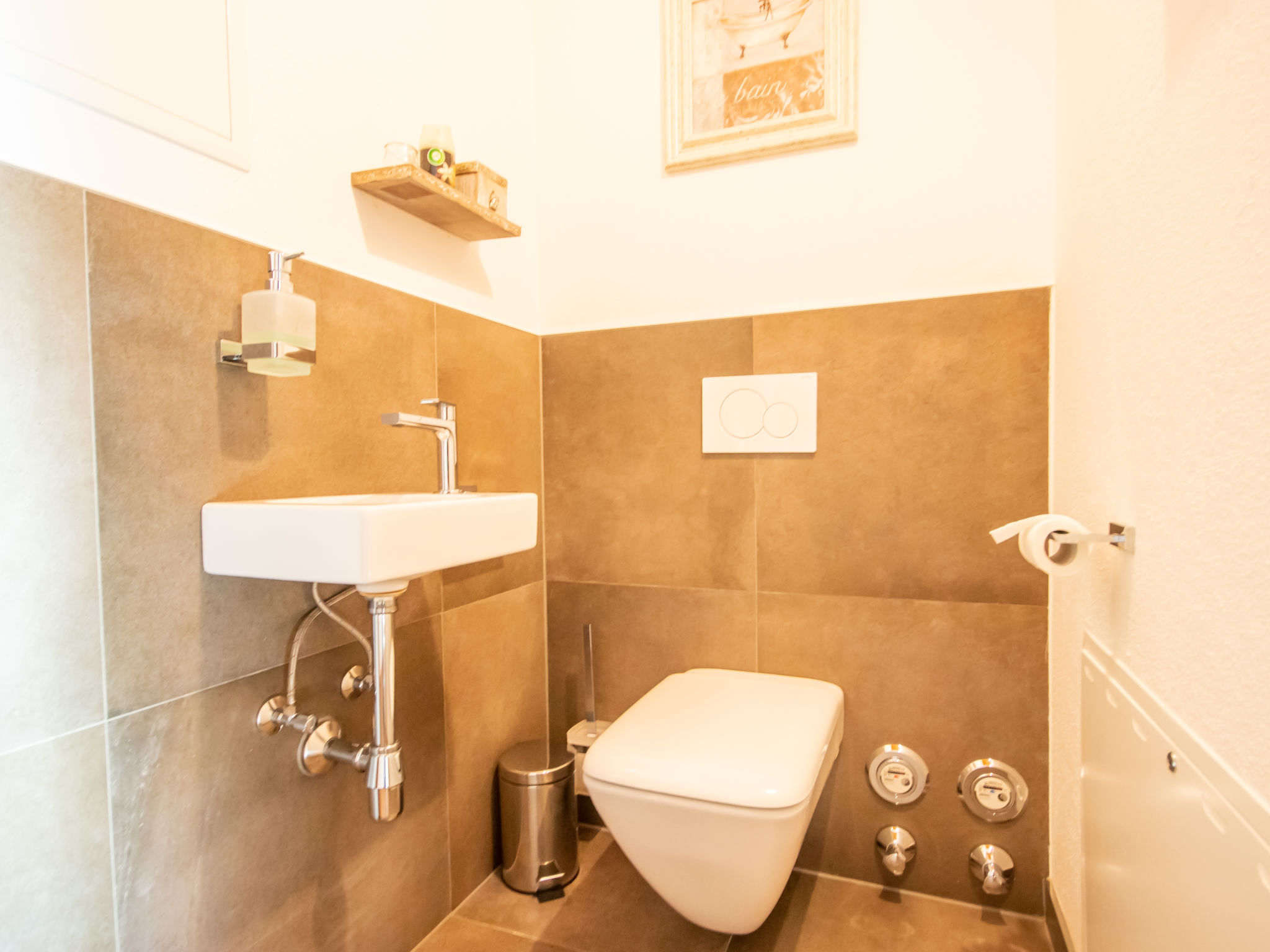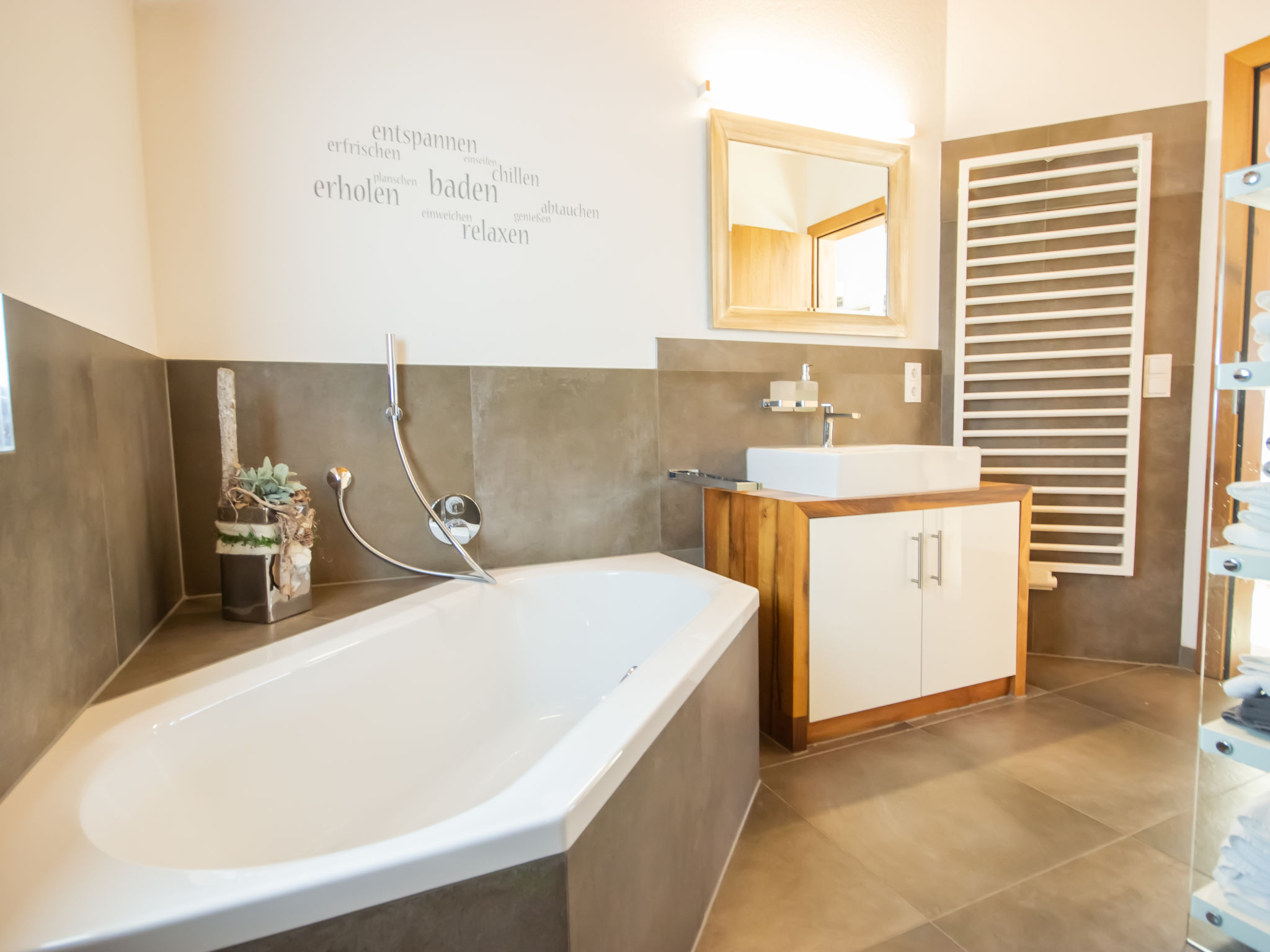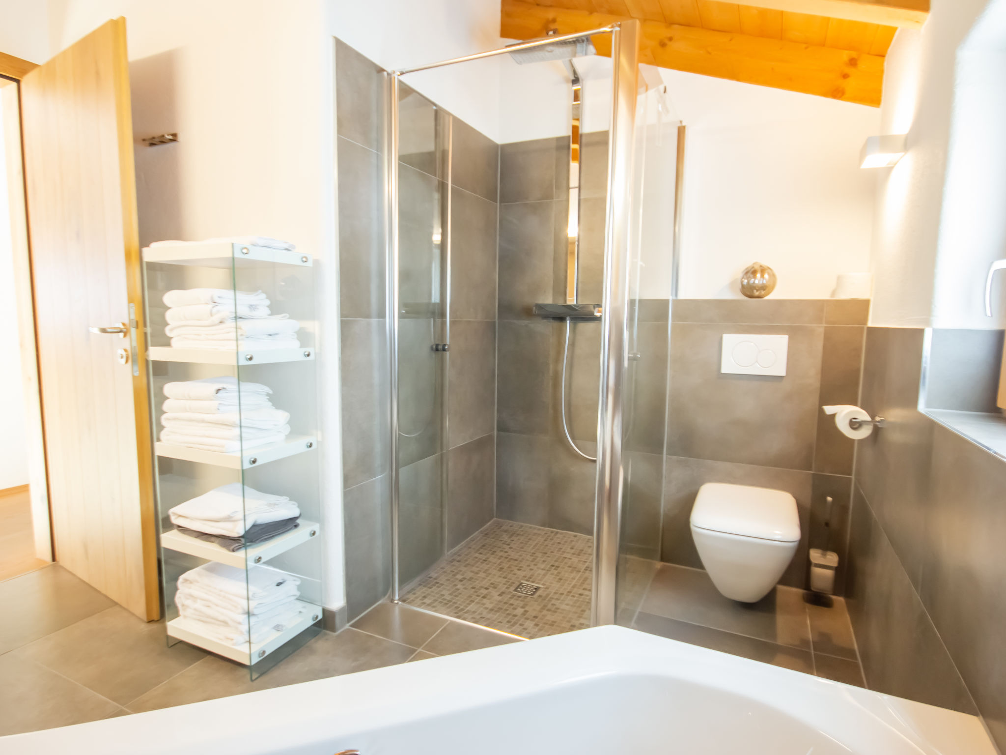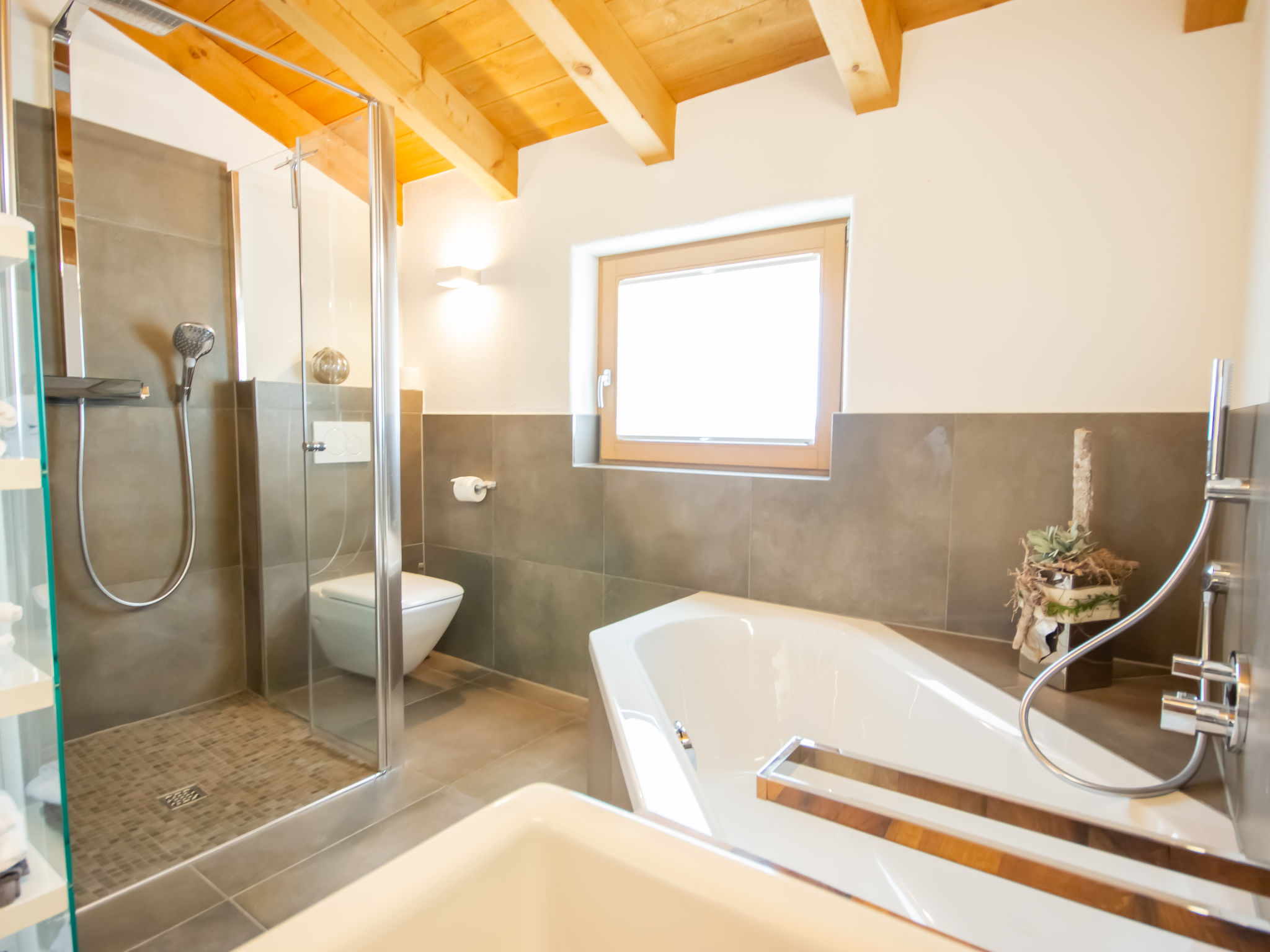 3-Zimmer-Wohnung 65 m2 im 1. Stock. Luxuriös und geschmackvoll eingerichtet: abgeschrägter Eingang, Deckenhöhe 380 cm mit Panoramafenster Richtung Süden. Wohn-/Esszimmer mit 1 Ausziehbett (2 Pers.), Esstisch und Sat-TV (Flachbildschirm). Ausgang zum Balkon. 2 Doppelzimmer. Offene Küche (Backofen, Geschirrspüler, 4 Glaskeramikherd Platten, Tiefkühler, elektrische Kaffeemaschine). Bad/Dusche/WC. Fussbodenheizung. Grosser Balkon 14 m2. Balkonmöbel. Schöne Panoramasicht auf die Berge. Zur Verfügung: Internet (Wireless LAN, gratis). Bitte beachten: Nichtraucher-Unterkunft. 1 Haustier/Hund erlaubt.