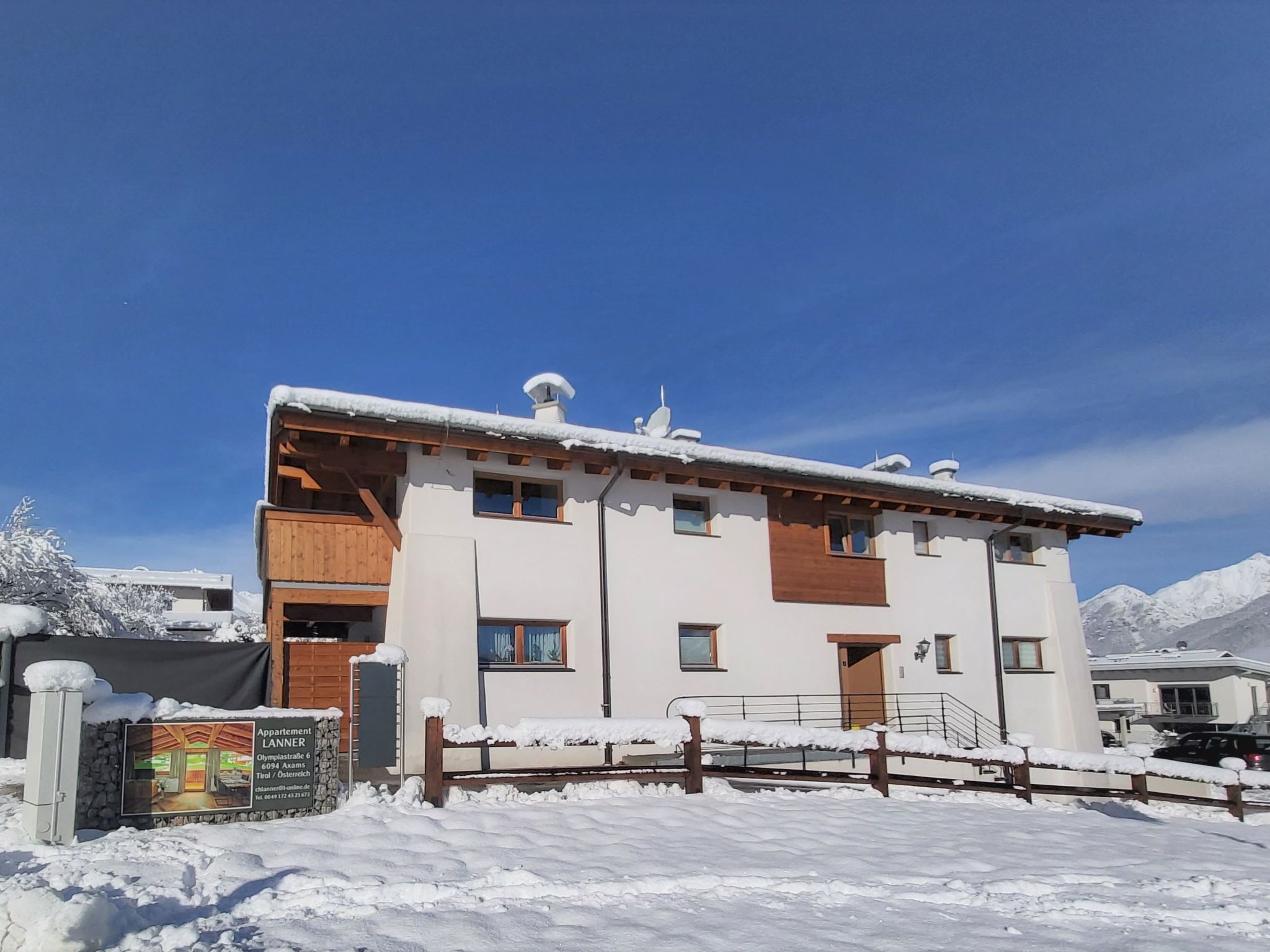 Exklusives modernes Dreifamilienhaus "Lanner", auf 2 Stockwerken, Baujahr 2013. Am Ortsrand, 500 m vom Zentrum von Axams, sonnige Lage, 3.5 km vom Skigebiet. Zufahrt bis zum Haus. Parkplatz beim Haus. Einkaufsgeschäft 500 m, Lebensmittelgeschäft, Supermarkt, Café 450 m, Freibad, Hallenbad 850 m, Badesee "Natterer See" 6 km. Reitstall 700 m, Wanderwege ab Haus 1 m, Bergbahn 8 km, Gondelbahn 3.5 km, Skisportanlagen 3.5 km, Skipisten 3.5 km, Skiverleih 500 m, Skibushaltestelle 350 m, Skischule 8 km, Schlittelbahn 350 m, Eisfeld 850 m. Nahe gelegene Sehenswürdigkeiten: Stadt Innsbruck 10 km, Stadt Hall 20 km. Bekannte Skigebiete sind gut erreichbar: Axamer Lizum 8 km, Mutterer Alm/Götzner Bahn 3.5 km. Bekannte Seen in der Umgebung sind gut erreichbar: Natterer See. Wandergebiete: ab Haus. Die Nachbarschaft ist sehr lärmempfindlich. Ruhe und gutes Benehmen wird erwartet. 4 große Golfplätze befinden sich im Umkreis von 30 Km. Reisen und Sparen: WELCOME CARD inklusive, Info unter: www.innsbruck.info/welcome!!! Gratis Eintritt: Freizeitzentrum Axams!