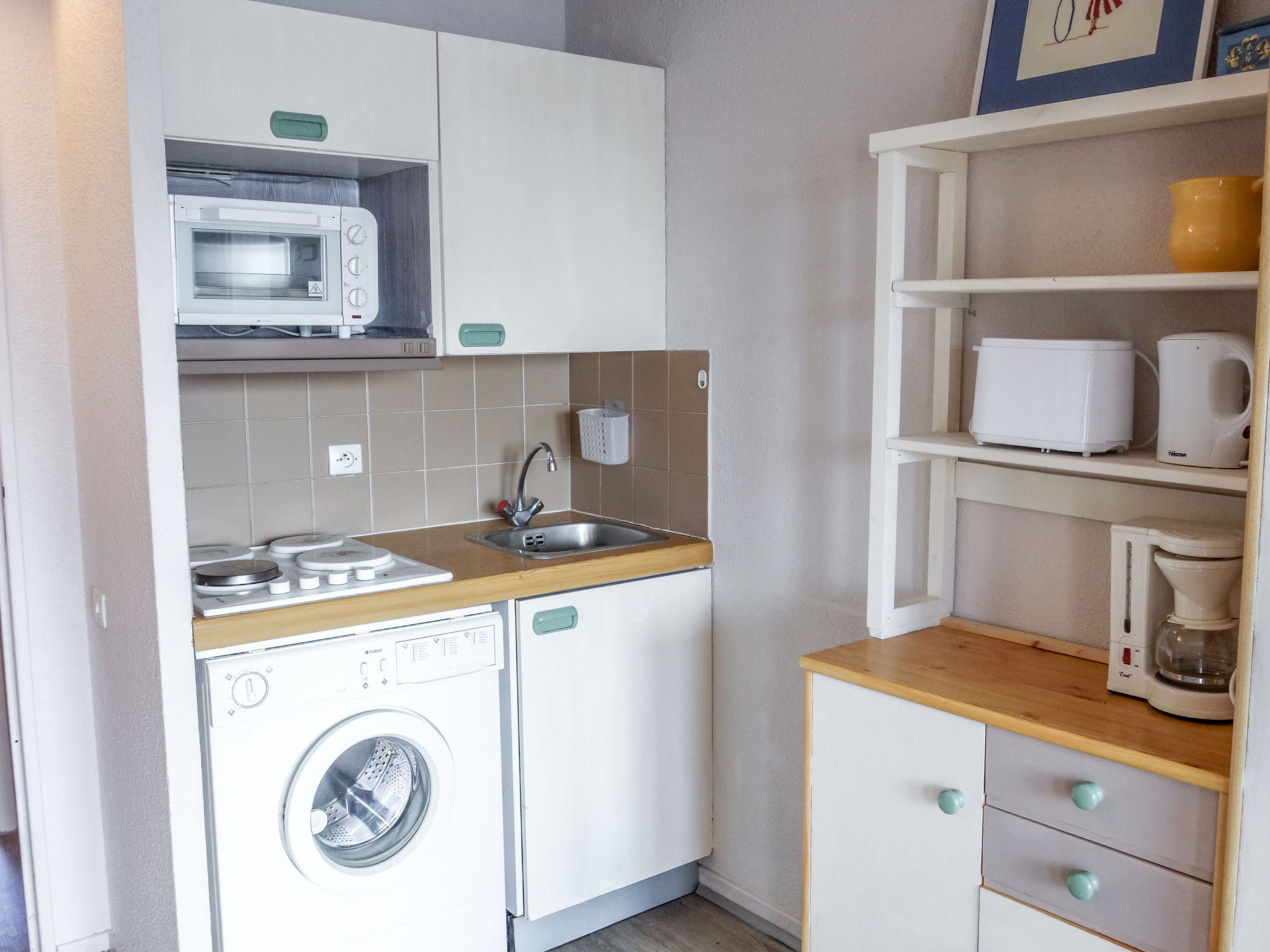 2-Zimmer-Wohnung 30 m2 im 1. Stock. Wohn-/Esszimmer mit 1 Doppeldiwanbett (140 cm, Länge 200 cm), TV (Flachbildschirm). Ausgang zur Loggia. 1 kleines Zimmer mit 1 x 2 Etagenbetten (90 cm, Länge 190 cm). Kochnische (4 Kochplatten, Mini-Backofen, Mikrowelle, Tiefkühler, elektrische Kaffeemaschine). Sitzbad, sep. WC. Loggia. Sicht auf die Lagune. Zur Verfügung: Waschmaschine. Internet (Wireless LAN, extra). Bitte beachten: Rauchmelder. Inserat einer Privatperson nach Artikel 155, IV, CGI.