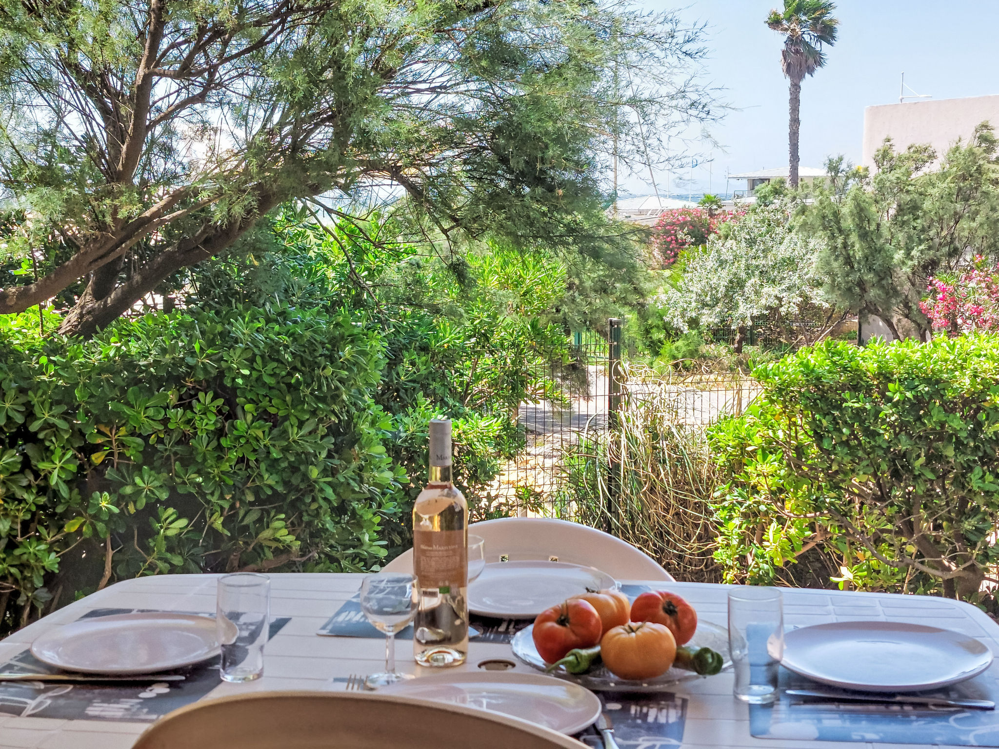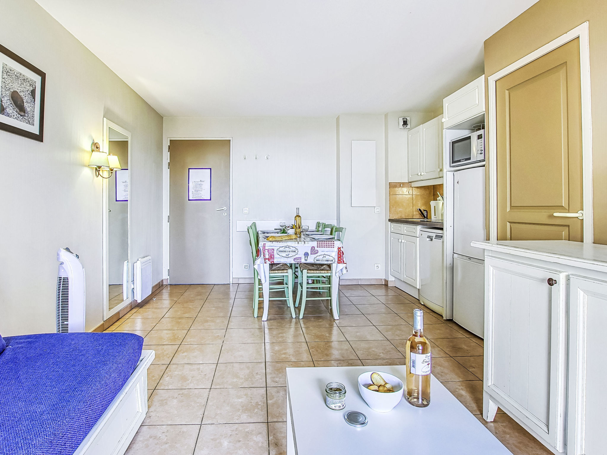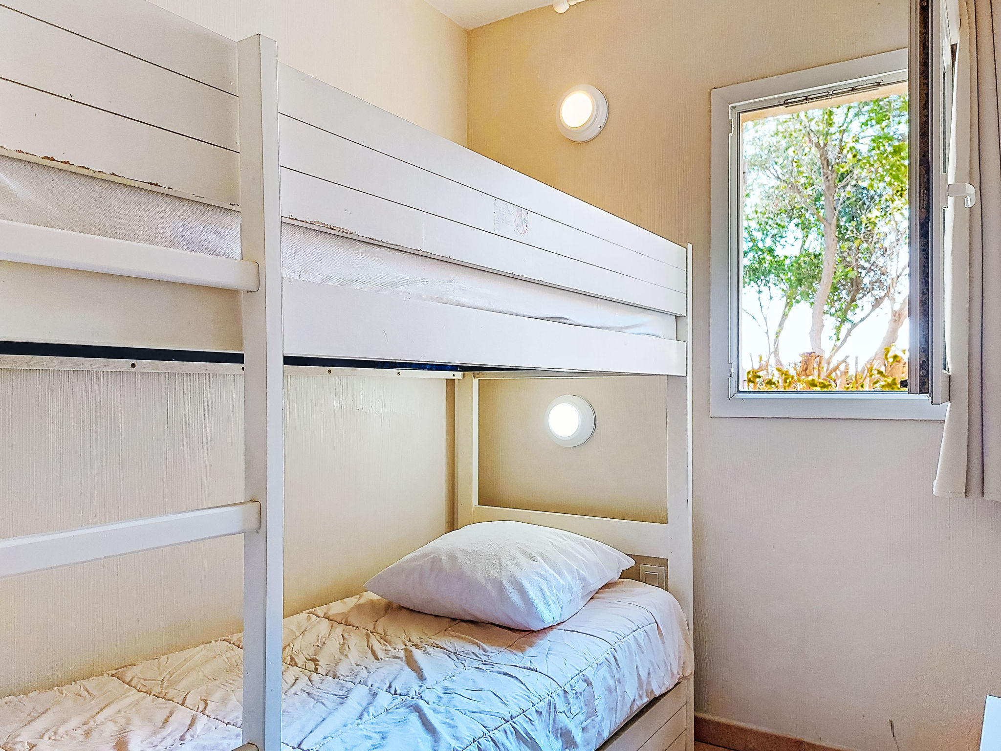 3-Zimmer-Wohnung 45 m2, im Erdgeschoss. Zweckmässig und schön eingerichtet: Wohn-/Esszimmer mit 1 Bett (80 cm, Länge 190 cm), TV (Flachbildschirm). Ausgang zur Terrasse. Kabine mit 1 x 2 Etagenbetten (80 cm, Länge 190 cm). 1 Zimmer mit 1 franz. Bett (140 cm, Länge 190 cm). Kochnische (Geschirrspüler, 4 Glaskeramikherd Platten, Mikrowelle, Tiefkühler, elektrische Kaffeemaschine). Bad, Dusche/WC. E-Heizung. Terrasse 7 m2, überdacht, Westlage, kleiner Gartensitzplatz 3 m2, Westlage. Terrassenmöbel. Fernsicht auf das Meer. Zur Verfügung: Internet (Wireless LAN, extra). Parkplatz Nr. 401 (Niveau 1) (überdacht), Höhe 190 cm, Breite 230 cm. Bitte beachten: Maximal 1 Haustier/Hund erlaubt. TV nur FR. Rauchmelder. Der Garten ist nicht eingezäunt. Inserat einer Privatperson nach Artikel 155, IV, CGI.