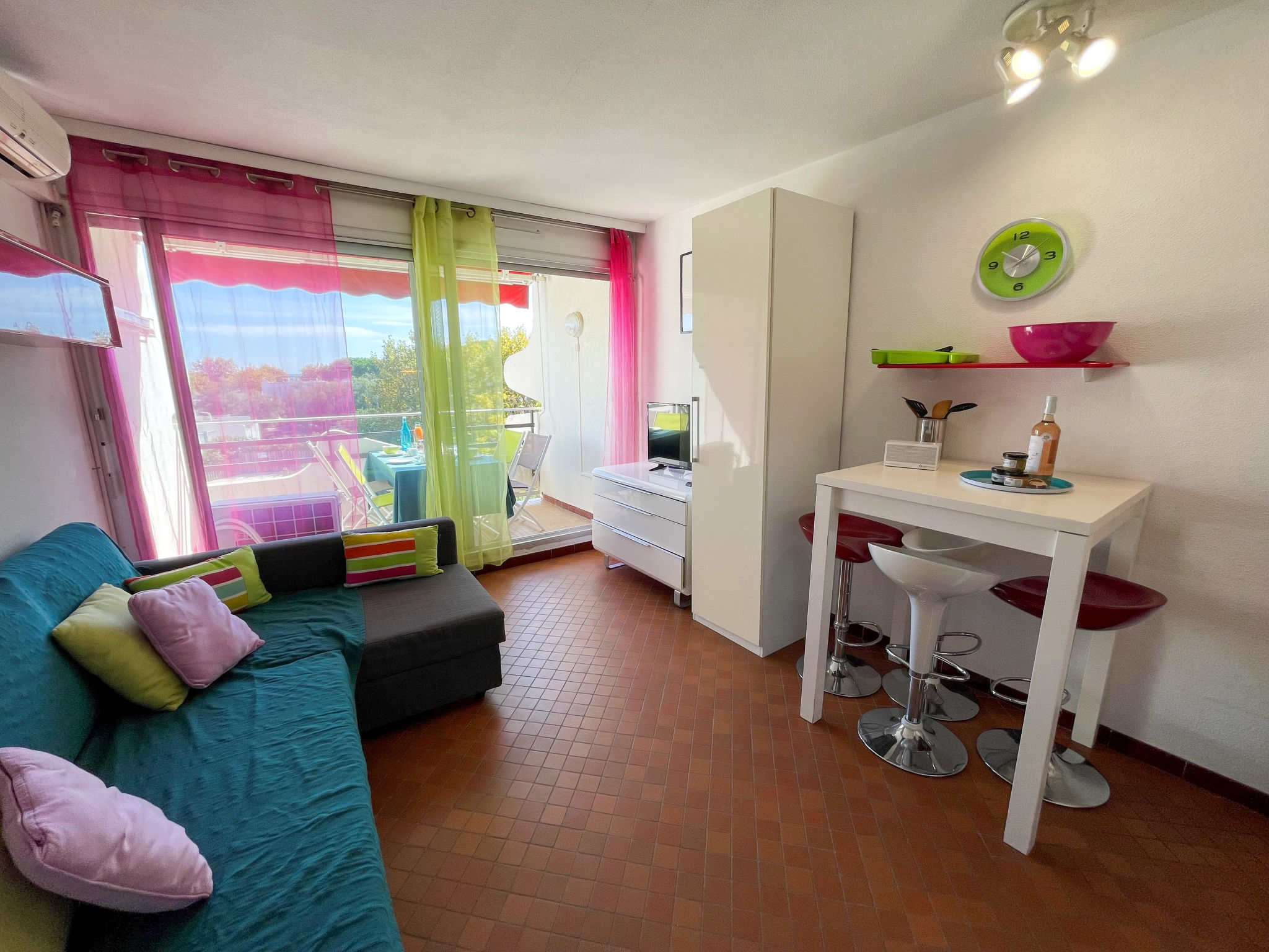1-Zimmer-Wohnung 21 m2 im 2. Stock. Renoviert im Jahre 2012, schön eingerichtet: Wohn-/Esszimmer mit 1 Doppeldiwanbett (140 cm, Länge 190 cm), TV (Flachbildschirm). Eingang mit 1 x 2 Etagenbetten (80 cm, Länge 190 cm). Kochnische (2 Kochplatten, Mini-Backofen, Toaster, Wasserkocher, Mikrowelle, Tiefkühler, elektrische Kaffeemaschine). Sitzbad/WC. Klimaanlage. Terrasse 8 m2, Südlage. Terrassenmöbel. Sicht auf das Schwimmbad und den Garten. Zur Verfügung: Waschmaschine. Internet (Wireless LAN, extra). Bitte beachten: kein Parkplatz. 1 Haustier/Hund erlaubt. Rauchmelder. Inserat einer Privatperson nach Artikel 155, IV, CGI.