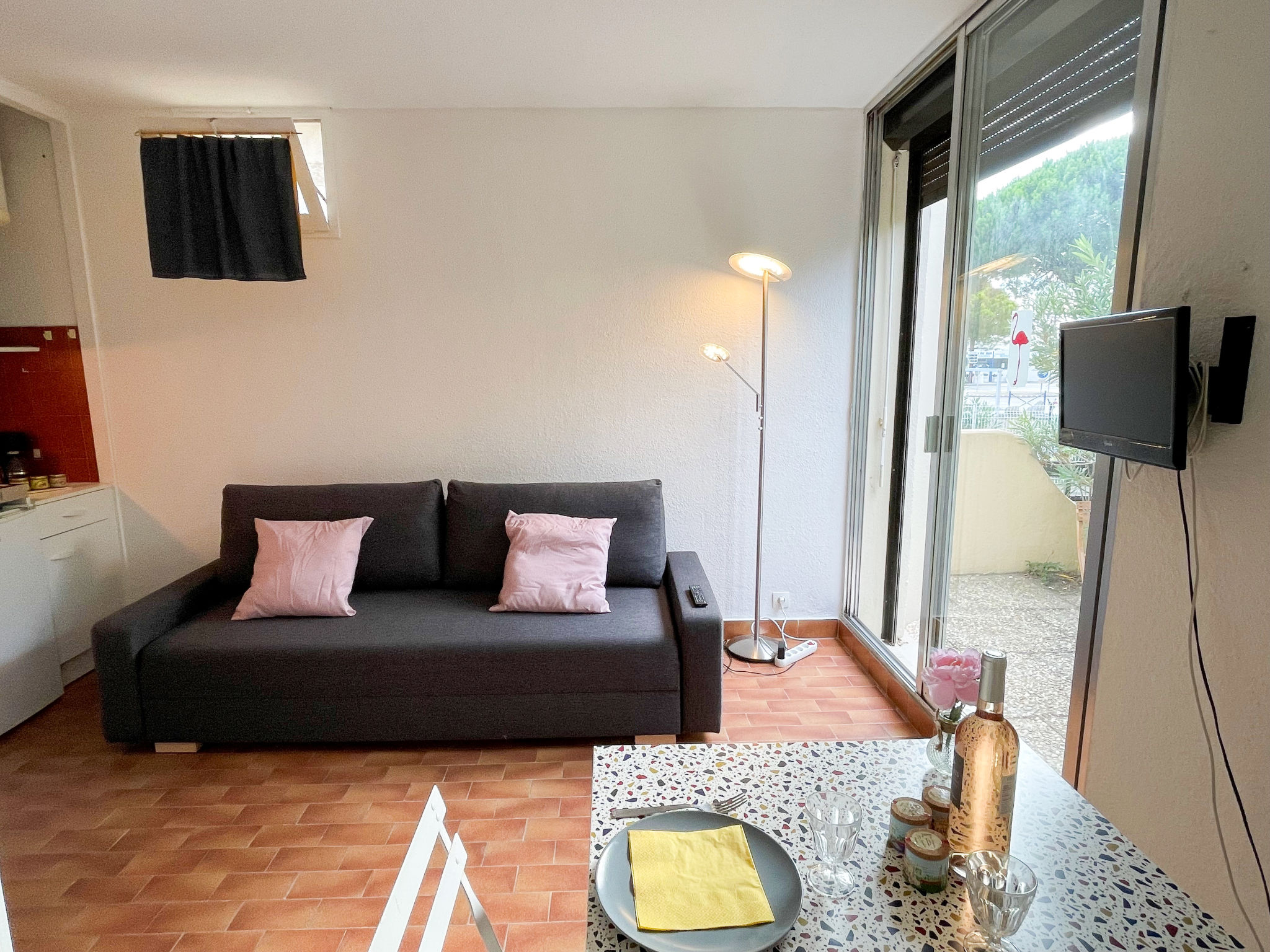 1-Zimmer-Studio 18 m2, im Erdgeschoss. Wohn-/Esszimmer mit 1 Doppeldiwanbett (140 cm, Länge 180 cm), TV. Kochnische (2 Kochplatten, Mikrowelle). Dusche/WC. E-Heizung. Terrasse 15 m2, Südlage und Westlage. Terrassenmöbel. Parkplatz. Bitte beachten: Rauchmelder. Inserat einer Privatperson nach Artikel 155, IV, CGI.