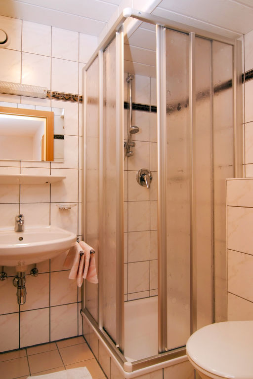 3-Zimmer-Wohnung, 1. Etage, ca. 55 m². Wohnraum mit Sitzcouch, Essplatz und Balkonausgang. Kleine Küche (4 Platten, Mikrowelle, Geschirrspüler, Kühlschrank, Kaffeemaschine). Schlafzimmer mit Doppelbett und Bettcouch. Schlafzimmer mit kleinem Vorraum, Doppelbett, Bettcouch, Dusche/WC. Dusche/WC.