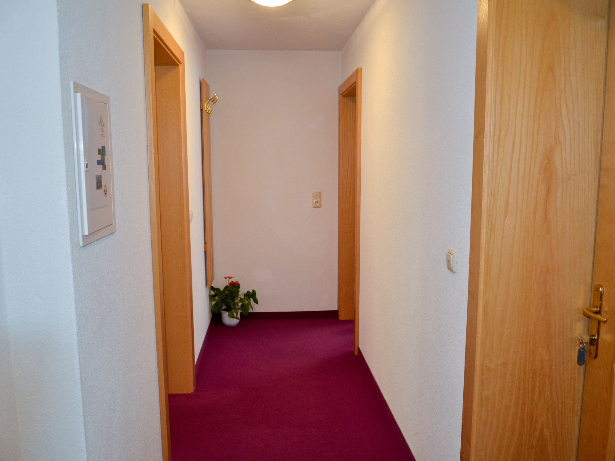 3-Zimmer-Wohnung, 1. Etage, ca. 55 m². Wohnraum mit Sitzcouch, Essplatz und Balkonausgang. Kleine Küche (4 Platten, Mikrowelle, Geschirrspüler, Kühlschrank, Kaffeemaschine). Schlafzimmer mit Doppelbett und Bettcouch. Schlafzimmer mit kleinem Vorraum, Doppelbett, Bettcouch, Dusche/WC. Dusche/WC.