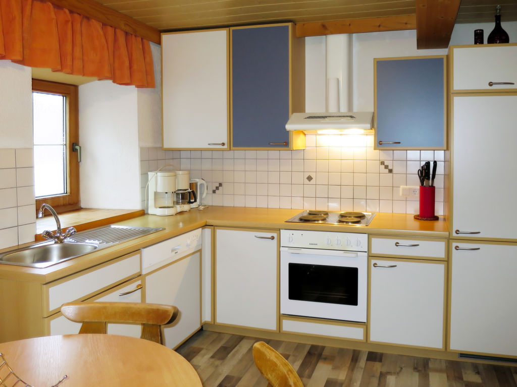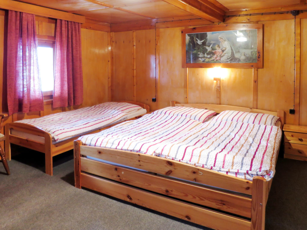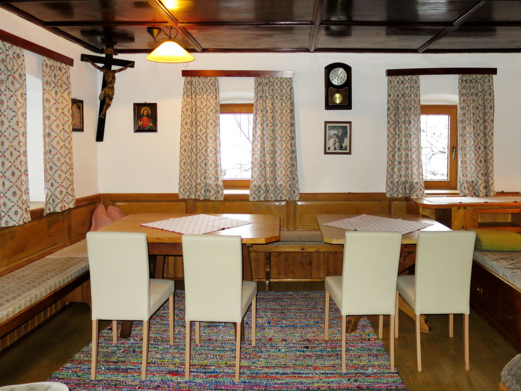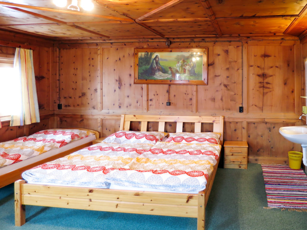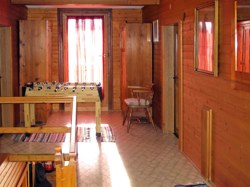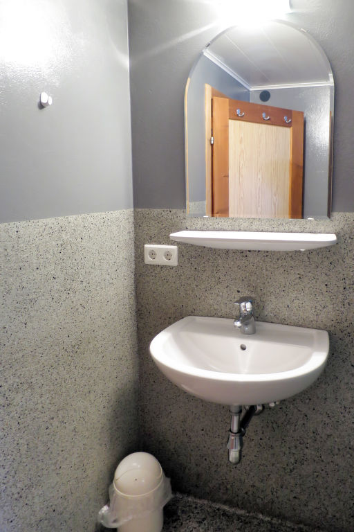4-Zimmer-Wohnung, 2 Etagen, ca. 120 m². Erdgeschoss: Flur. Wohnküche (4 Platten, Backofen, Geschirrspüler, Kühlschrank, Kaffeemaschine, Wasserkocher) mit Essplatz. Bauernstube mit Kachelofen, Eck- und Ofenbank und Tischen. 1. Etage: Flur mit Tischfußball und Balkonausgang. 3 Schlafzimmer, jeweils mit Doppelbett, 2 Einzelbetten und Waschbecken. Badezimmer mit 2x Dusche/WC. Sep.WC.