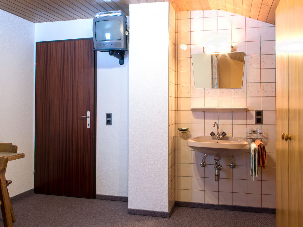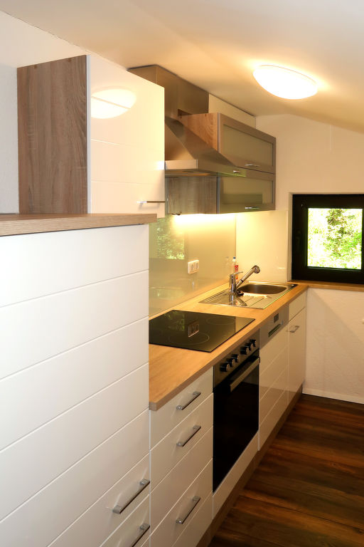 2-Zimmer-Wohnung, 3. Etage (Dachschräge), ca. 40 m². Wohn-/Schlafraum mit Einzelbett, Essplatz, Waschbecken und Balkonausgang. Küche (4 Ceranfelder, Backofen, Geschirrspüler, Kühlschrank, Kaffeemaschine, Wasserkocher, Toaster). Doppelzimmer mit Waschbecken und Balkonausgang. Dusche/WC.