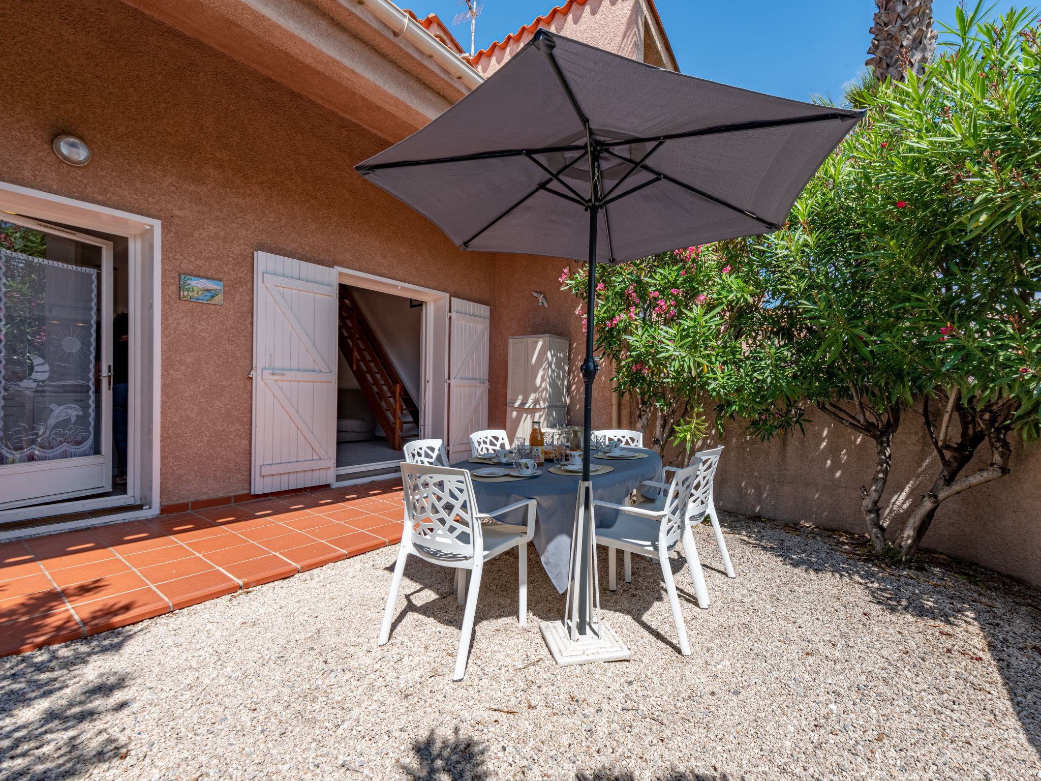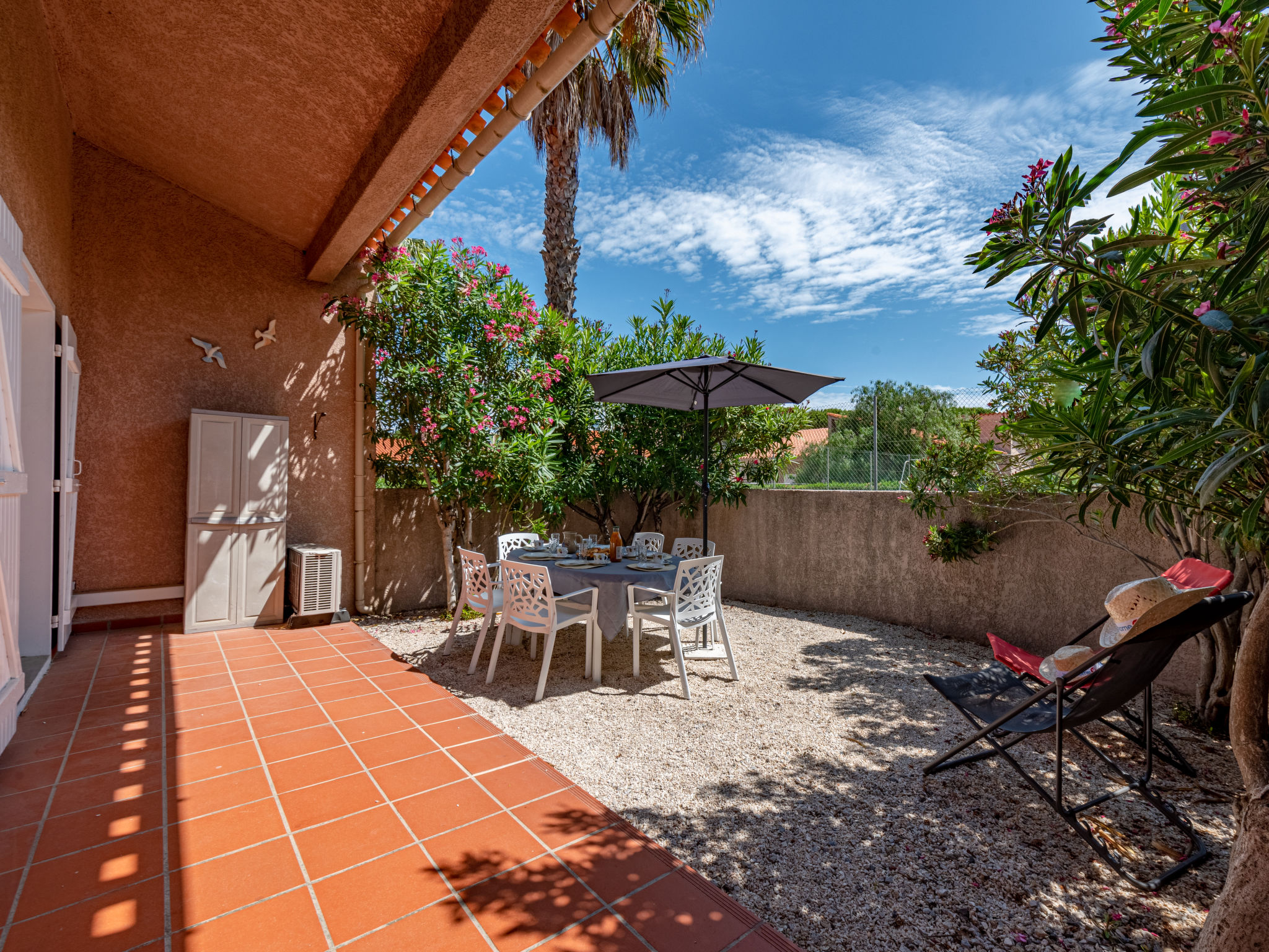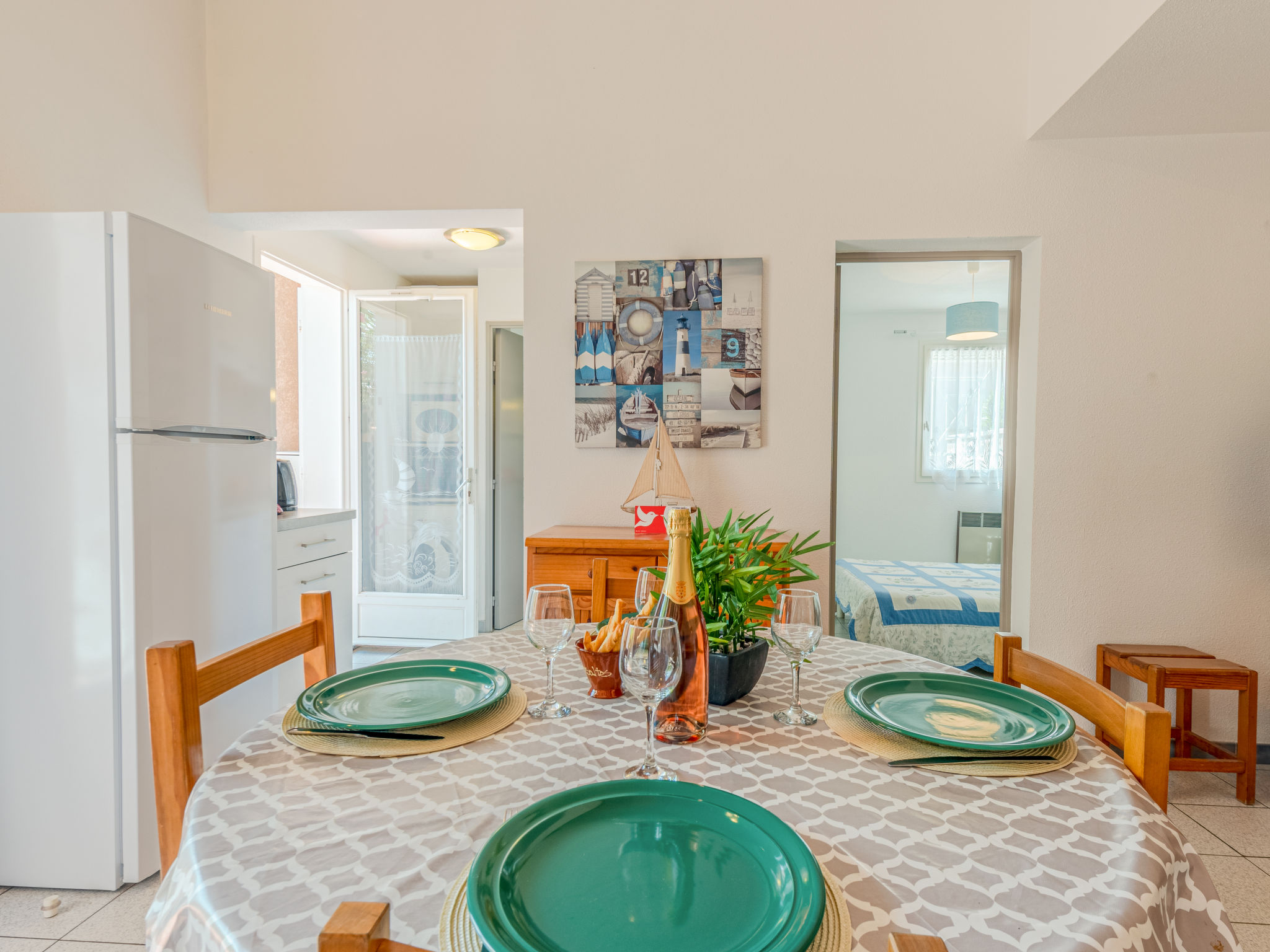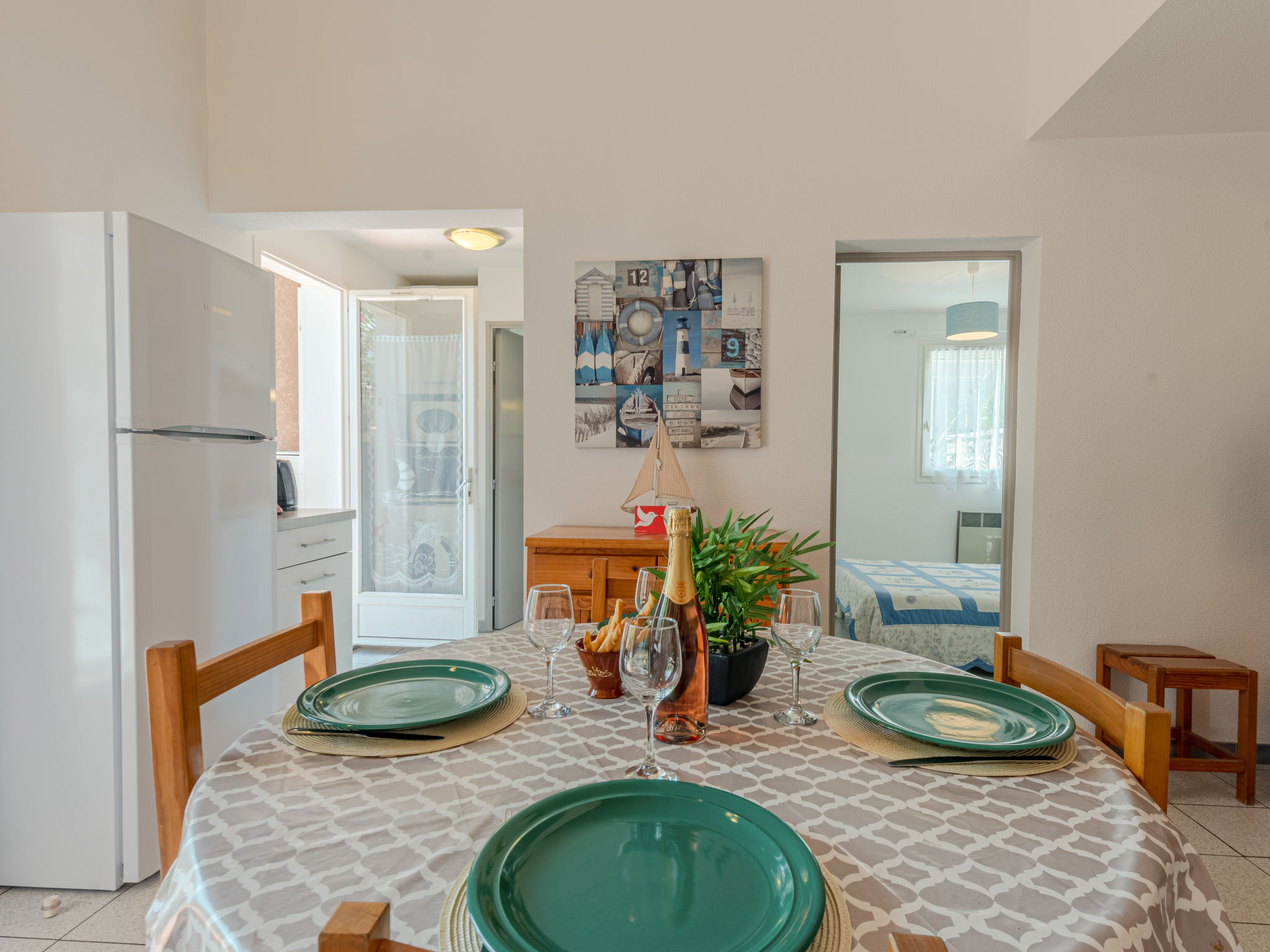 3-Zimmer-Reihenhaus 50 m2 auf 2 Stockwerken. Wohn-/Esszimmer mit 1 Doppeldiwanbett und TV. Ausgang zum Garten, zur Terrasse. 1 Zimmer mit 1 franz. Bett (140 cm, Länge 190 cm), Ventilator. Kochnische (3 Kochplatten, Backofen, Geschirrspüler, Mikrowelle, Tiefkühler). Dusche/WC. Obergeschoss: 1 Zimmer mit 1 franz. Bett (140 cm, Länge 190 cm), Ventilator. Terrasse 12 m2, Gartensitzplatz 15 m2. Gartengrill. Zur Verfügung: Waschmaschine. Internet (Wireless LAN, extra). Parkplatz Nr. 83 extérieur. Bitte beachten: Rauchmelder. Inserat einer Privatperson nach Artikel 155, IV, CGI.