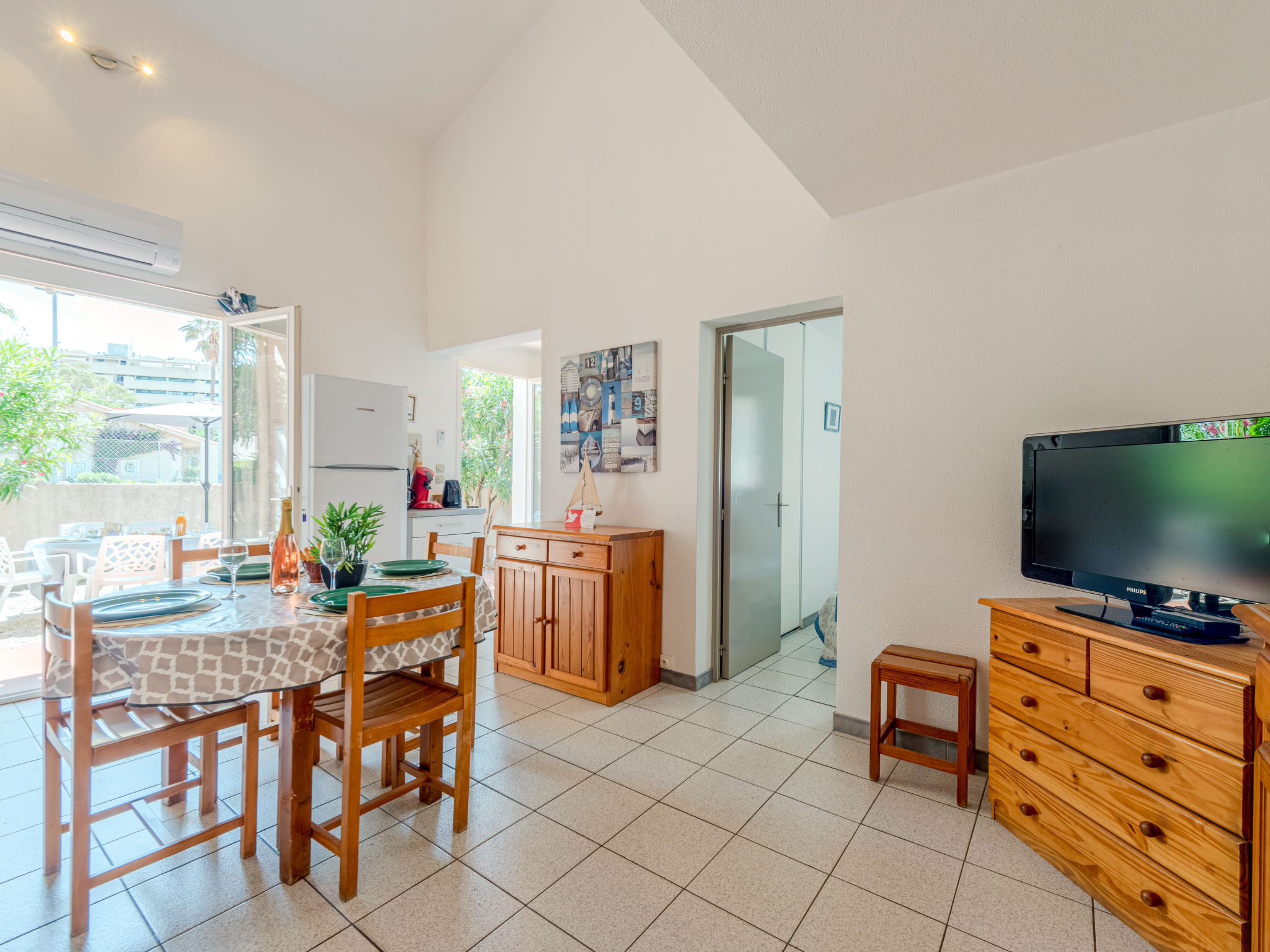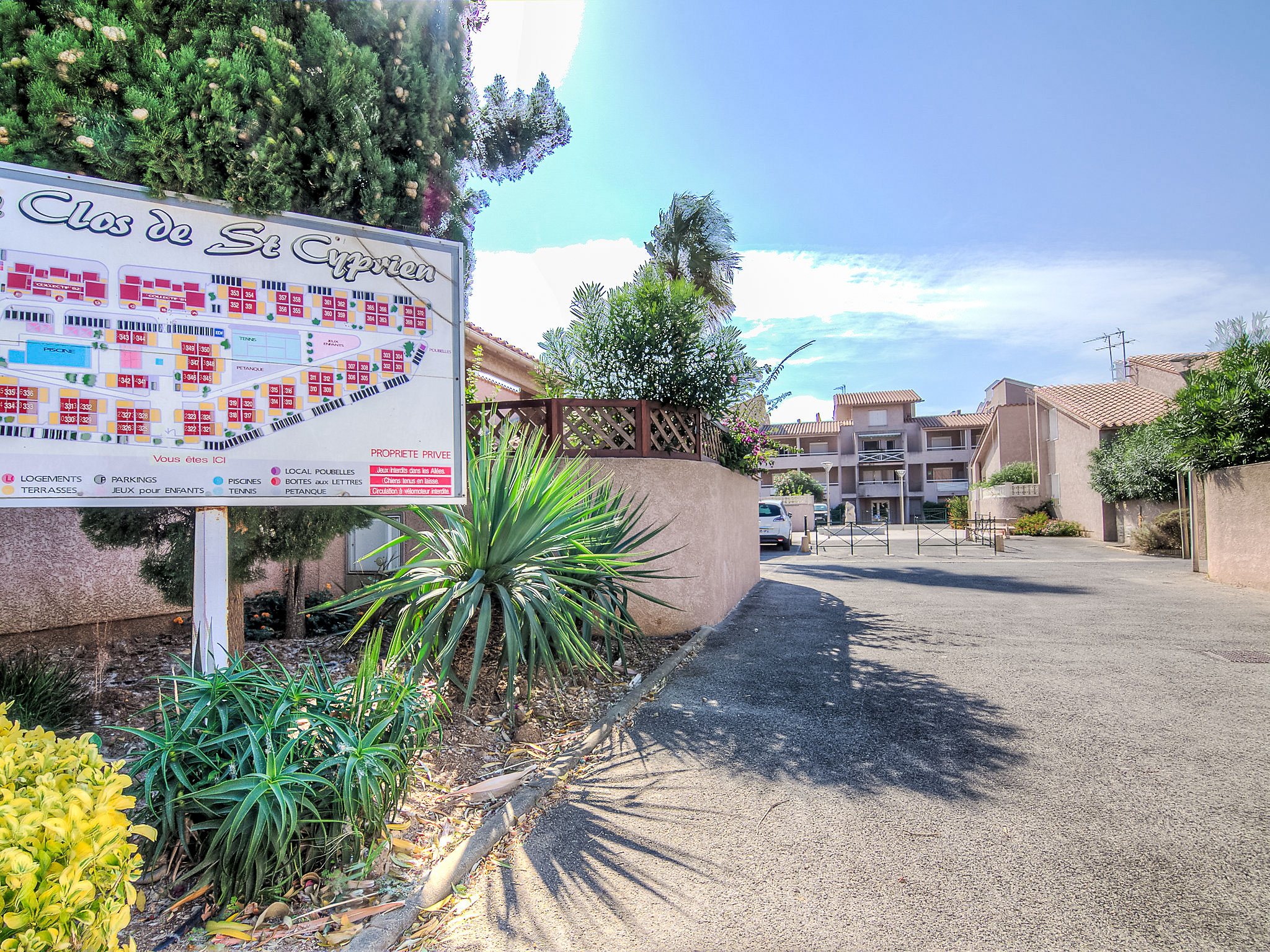 Residenz "Le Clos de St Cyprien". Im Ortszentrum von Saint Cyprien Port, zentrale, belebte Lage, 500 m vom Meer, 500 m vom Strand, an einer Hauptstrasse. Zur Mitbenutzung: Schwimmbad (saisonale Verfügbarkeit: 01.Jun.-15.Sep.). Kinderbecken, Tennis, Kinderspielplatz. Einkaufsgeschäft 400 m, Supermarkt 500 m, Restaurant 400 m, Bahnstation "Elne" 8.3 km, Sandstrand "Plage du Port" 500 m. Sporthafen 400 m, Golfplatz (27 Loch) 3.5 km, Segelschule 2 km, Minigolf 2.2 km, Reitstall 1.3 km, Sportzentrum 2.5 km. Nahe gelegene Sehenswürdigkeiten: Aqualand 4.4 km.