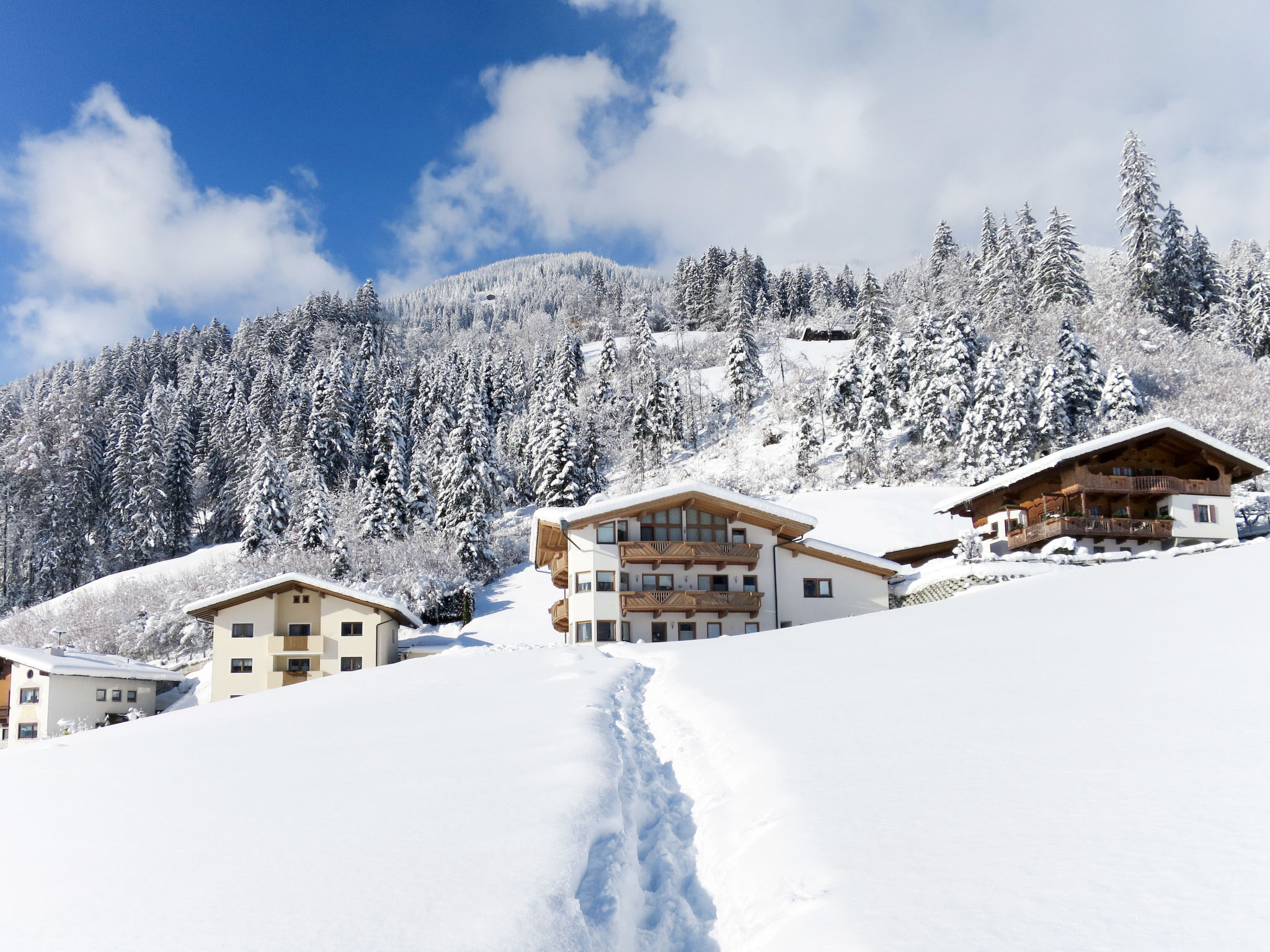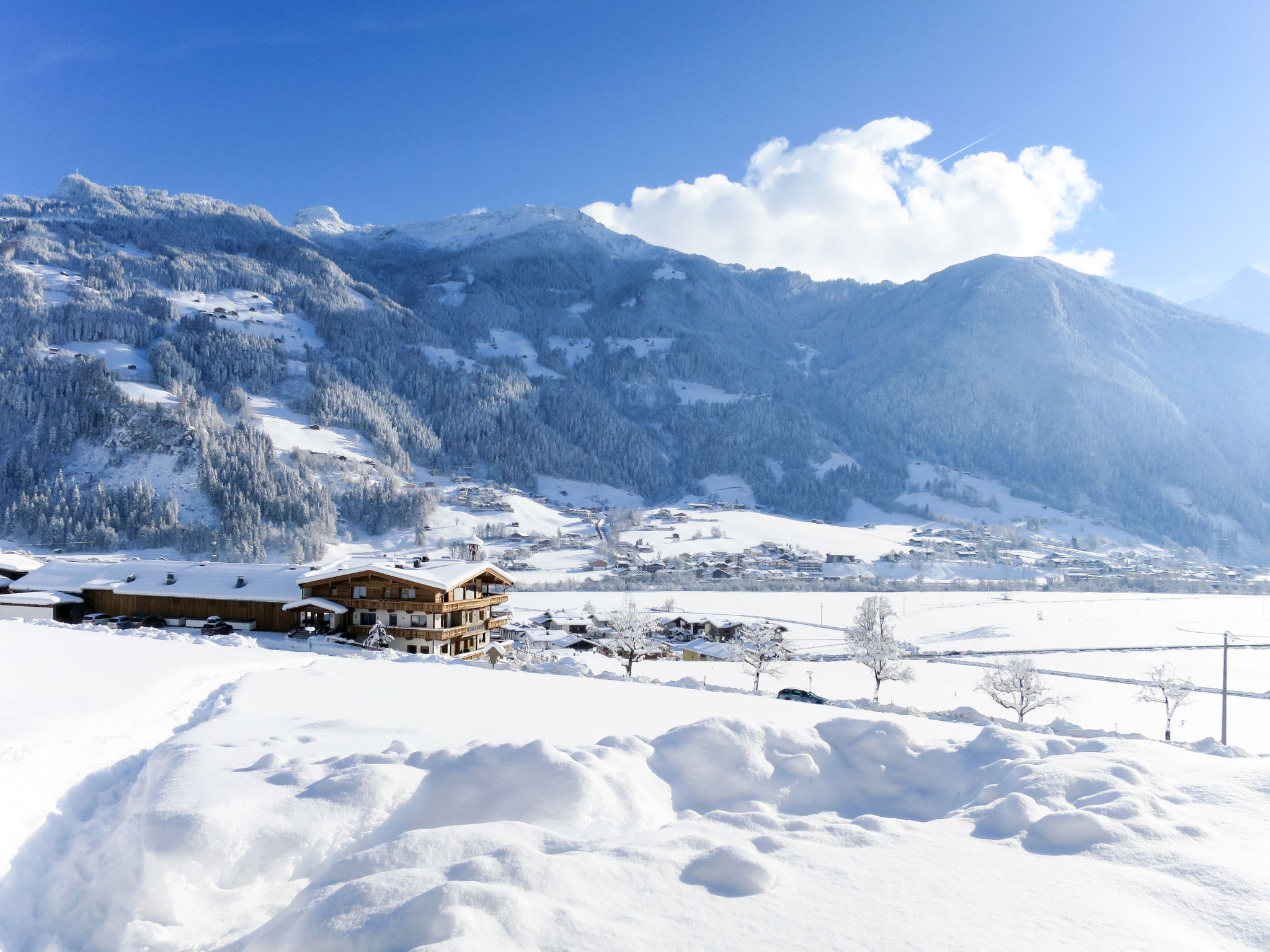 Das Zweifamilienhaus mit unserer Ferienwohnung und der Wohnung der Besitzer steht in sonniger Hanglage am Ortsrand von Schwendau. Schöner Blick auf die Zillertaler Bergwelt. Ortsmitte Hippach mit Einkaufsmöglichkeit ca. 500 m, Mayrhofen 5 km. Supermarkt in Ramsau, 1,5 km. Zur Ferienwohnung gehören ein ca. 300 m² großes, offenes Wiesengrundstück (leichte Hanglage) und eine teilüberdachte Terrasse (ca. 25 m²) mit Mobiliar. 2 reservierte PKW-Stellplätze. Gute, angenehme Einrichtung. Laminat- und Fliesenboden. 3x Sat-TV. Radio. Internetzugang (WLAN, inklusive). Fußbodenheizung. Hinweis: Rauchen ist in der Wohnung nicht gestattet. Winter-Infos: Skibushaltestelle ca. 100 m über Feldweg bzw. ca. 200 m entlang der Straße. Horbergbahn 1 km. Im Haus Skiraum mit Skischuhtrockner.