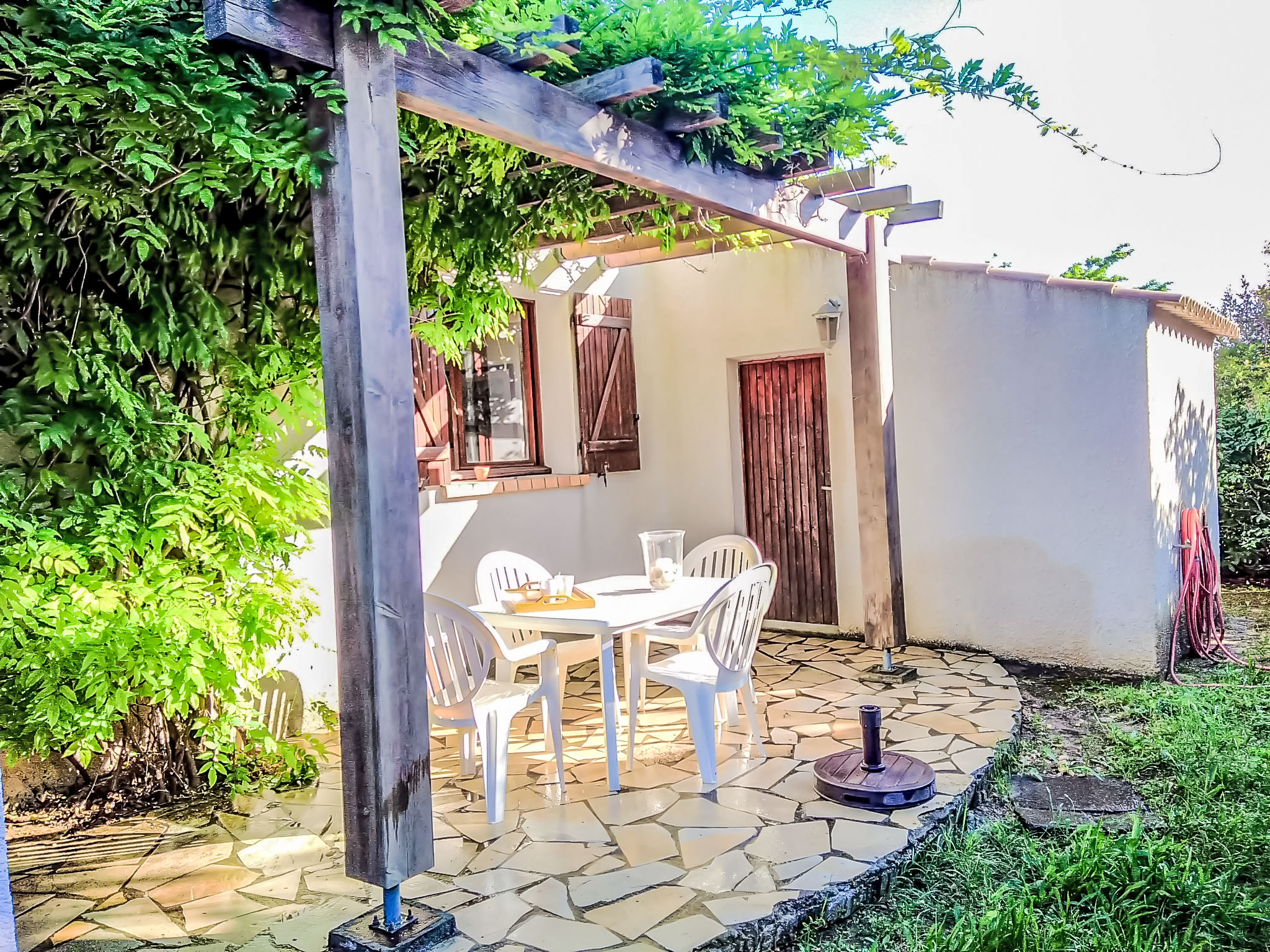 Einfamilienhaus "Les Hauts de Grimmal". Im Ortsteil Les Hauts de Grimal, 1 km vom Zentrum, 10 km vom Meer. Zur Alleinbenutzung: Naturgarten 400 m2 (eingezäunt). Terrasse, Gartenmöbel, Grill, Parkplatz beim Haus. Einkaufsgeschäft 1 km, Lebensmittelgeschäft 1 km, Supermarkt 2 km, Restaurant 2 km, Sandstrand 10 km, Freibad 2 km. Tennis 250 m. Bitte beachten: Fahrzeug empfohlen.