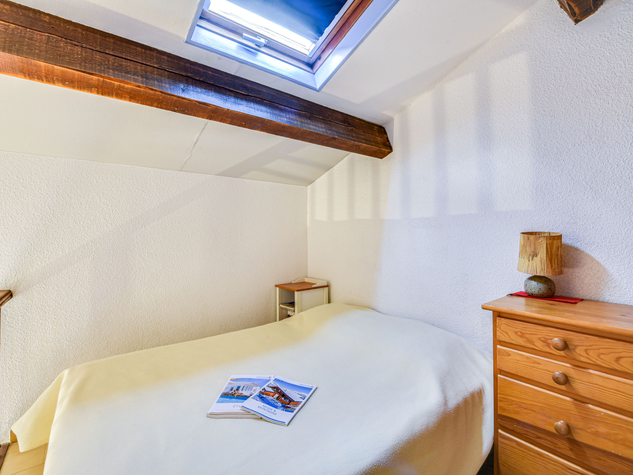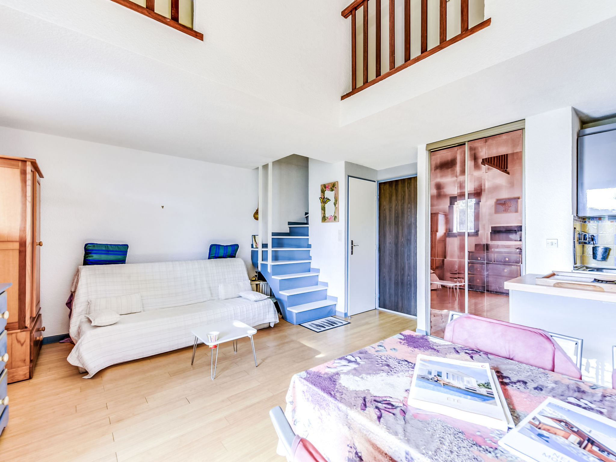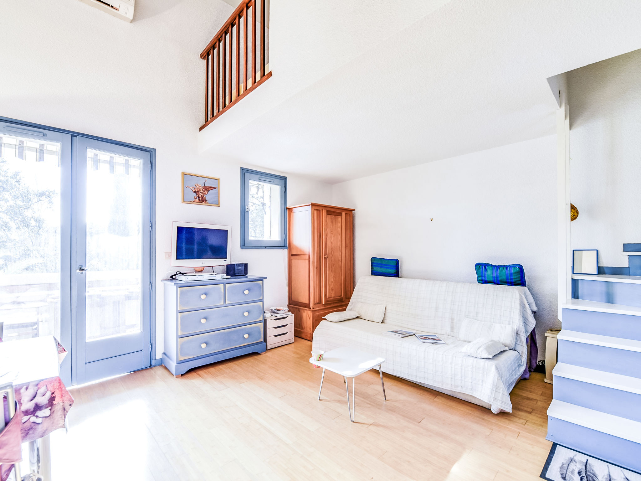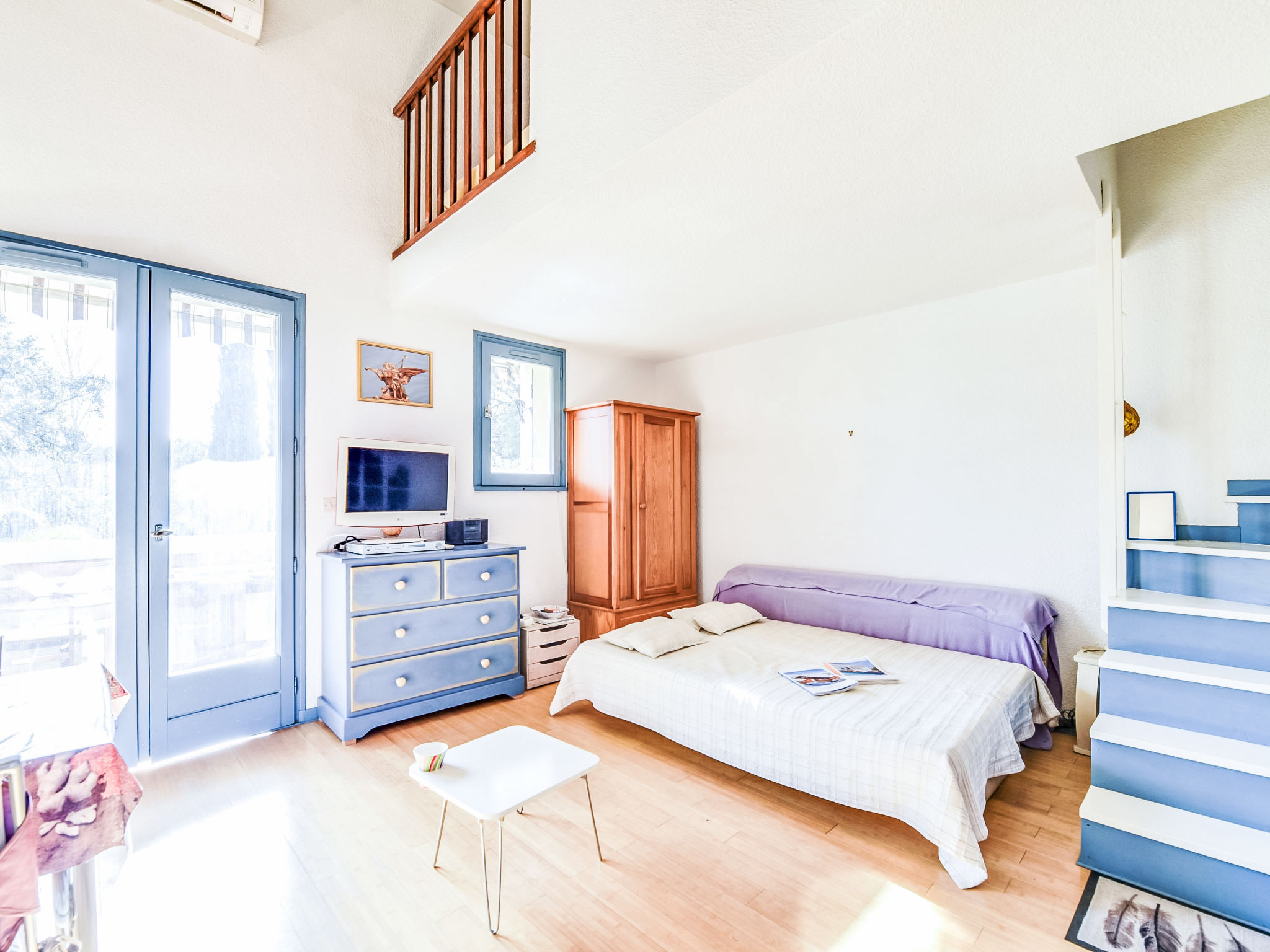 1-Zimmer-Studio 34 m2 auf 2 Stockwerken im 1. Stock. Zweckmässig und komfortabel eingerichtet: Wohn-/Esszimmer mit 1 Doppeldiwanbett (1 x 140 cm, Länge 190 cm), TV (Flachbildschirm), DVD. Ausgang zum Balkon. Offene Küche (Geschirrspüler, 2 Induktionskochplatten, Toaster, Wasserkocher, Mikrowelle, Tiefkühler, Grill, elektrische Kaffeemaschine). Sep. WC. Obergeschoss: 1 abgeschrägtes, offenes Zimmer mit 1 franz. Bett (1 x 140 cm, Länge 190 cm). Dusche. E-Heizung, Klimaanlage. Balkon 8 m2. Balkonmöbel, Liegestühle (2). Sicht auf den Garten. Zur Verfügung: Waschmaschine, Haartrockner. Parkplatz Nr. C-49. Bitte beachten: TV nur FR. Rauchmelder. Inserat einer Privatperson nach Artikel 155, IV, CGI.
