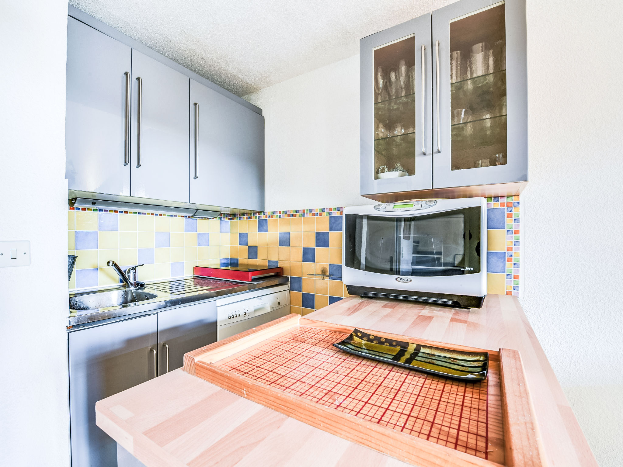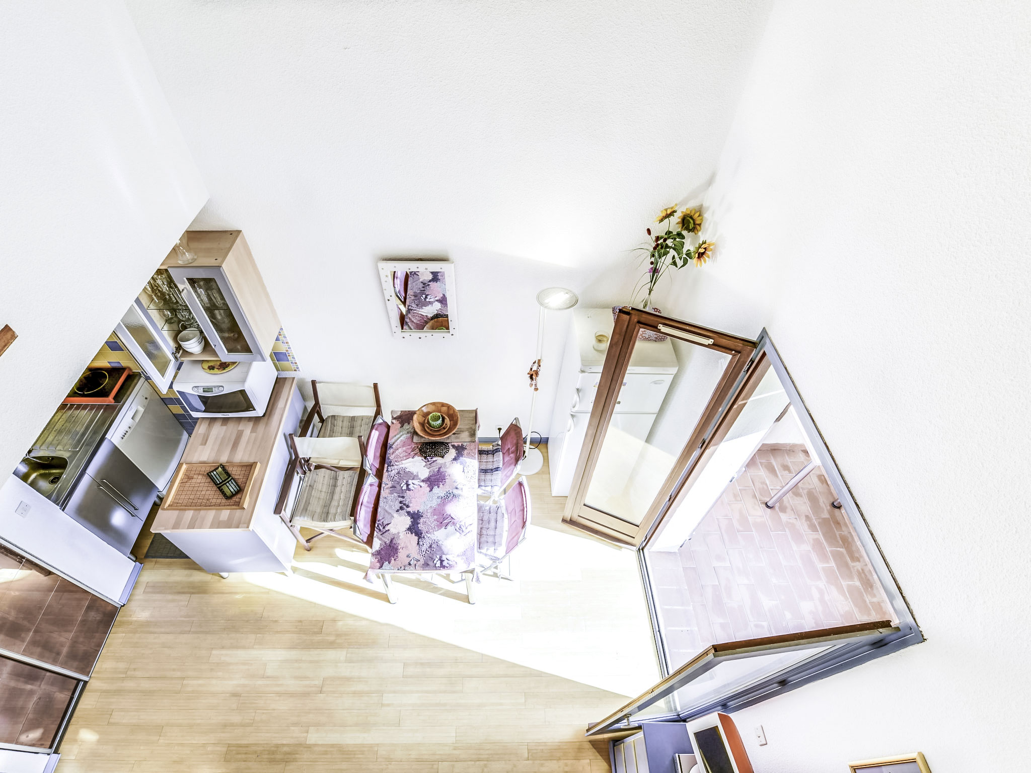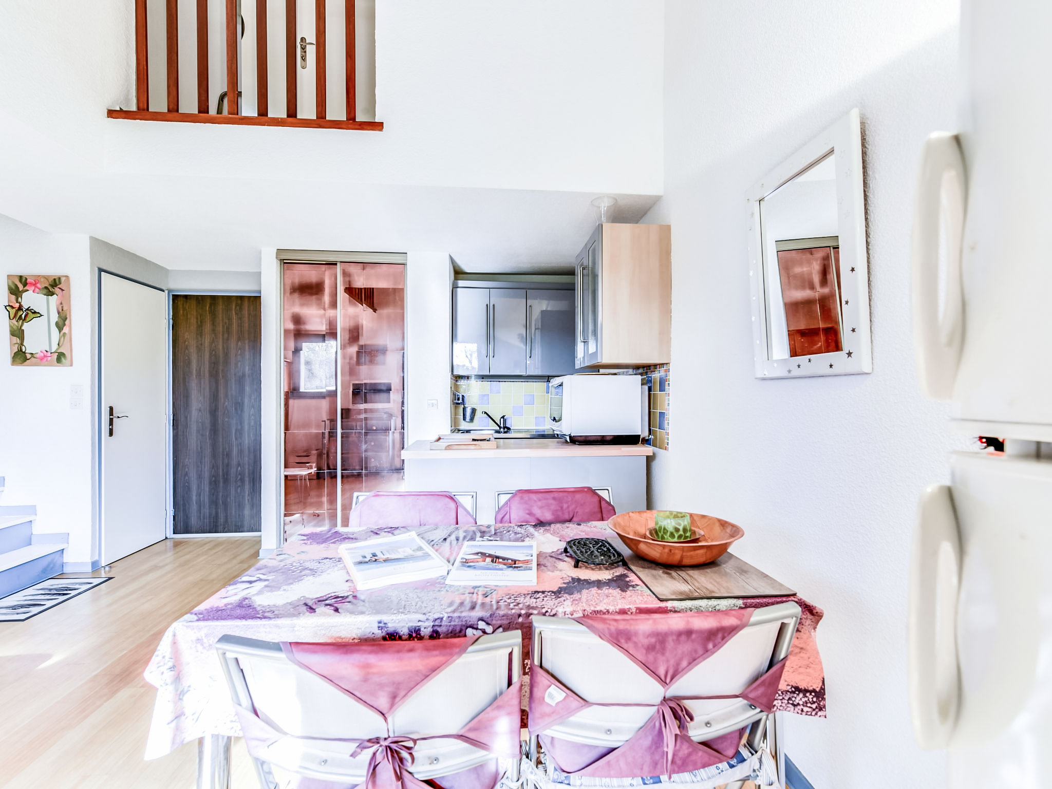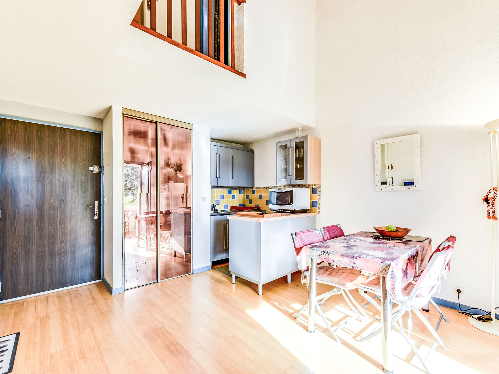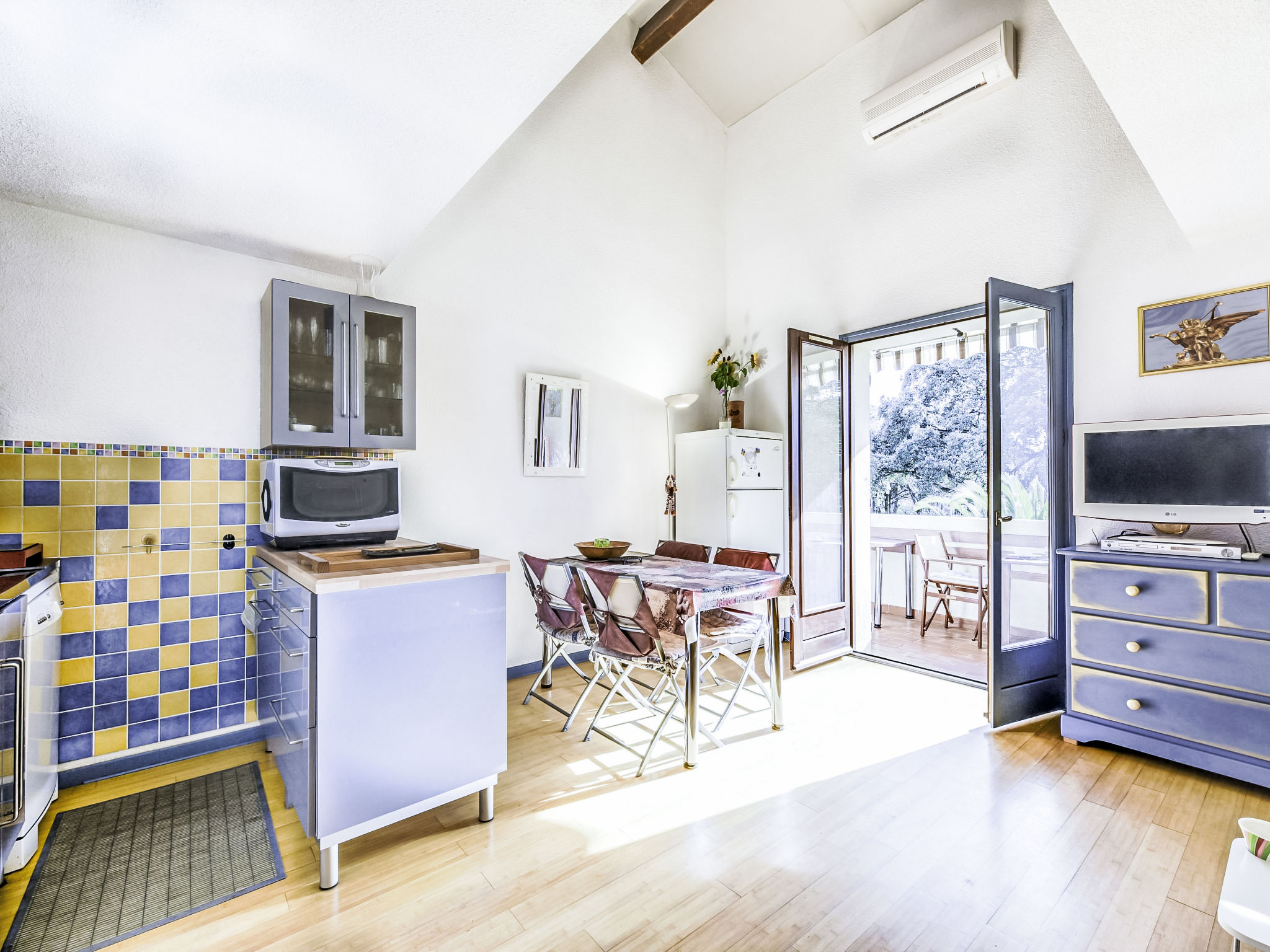 1-Zimmer-Studio 34 m2 auf 2 Stockwerken im 1. Stock. Zweckmässig und komfortabel eingerichtet: Wohn-/Esszimmer mit 1 Doppeldiwanbett (1 x 140 cm, Länge 190 cm), TV (Flachbildschirm), DVD. Ausgang zum Balkon. Offene Küche (Geschirrspüler, 2 Induktionskochplatten, Toaster, Wasserkocher, Mikrowelle, Tiefkühler, Grill, elektrische Kaffeemaschine). Sep. WC. Obergeschoss: 1 abgeschrägtes, offenes Zimmer mit 1 franz. Bett (1 x 140 cm, Länge 190 cm). Dusche. E-Heizung, Klimaanlage. Balkon 8 m2. Balkonmöbel, Liegestühle (2). Sicht auf den Garten. Zur Verfügung: Waschmaschine, Haartrockner. Parkplatz Nr. C-49. Bitte beachten: TV nur FR. Rauchmelder. Inserat einer Privatperson nach Artikel 155, IV, CGI.