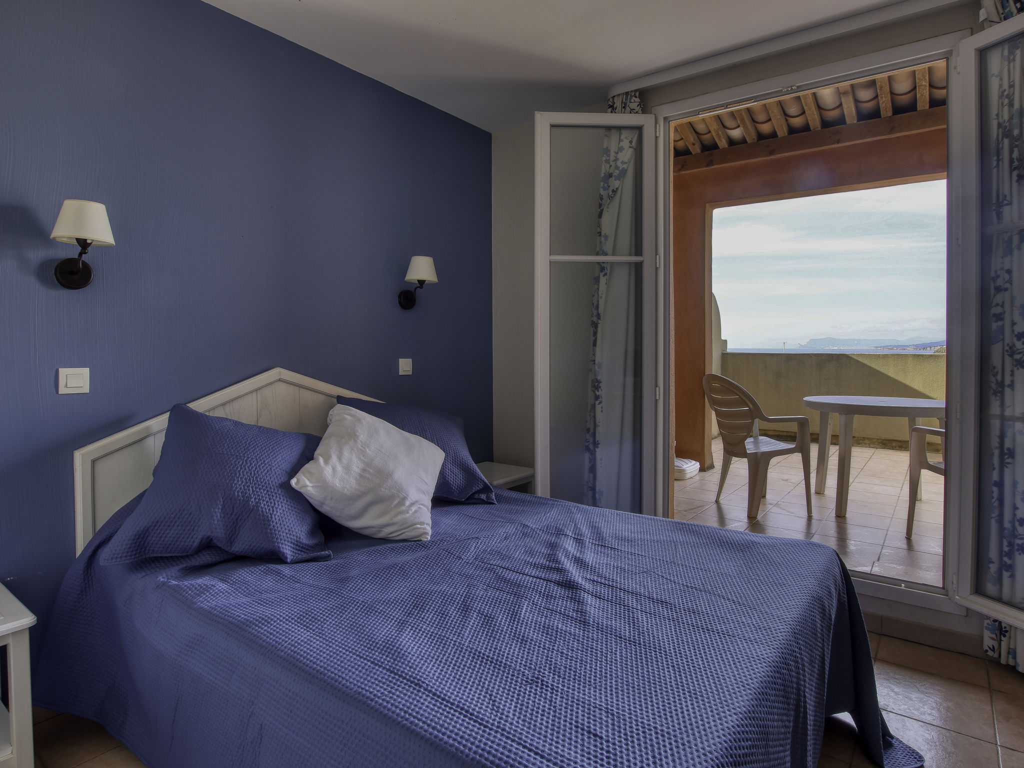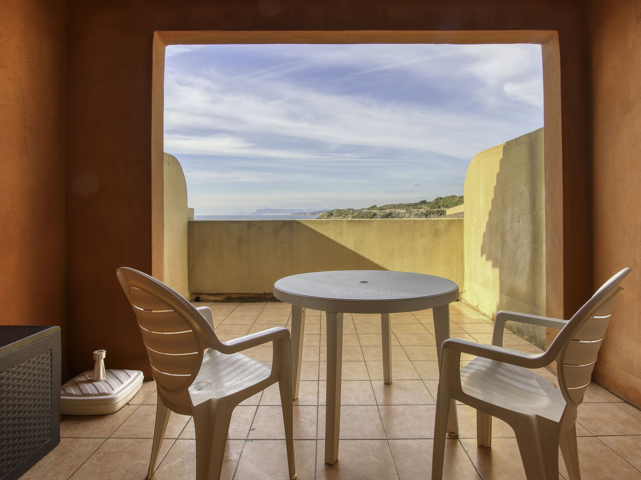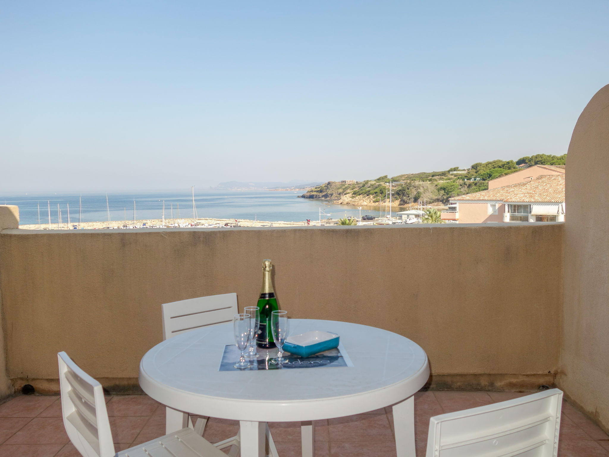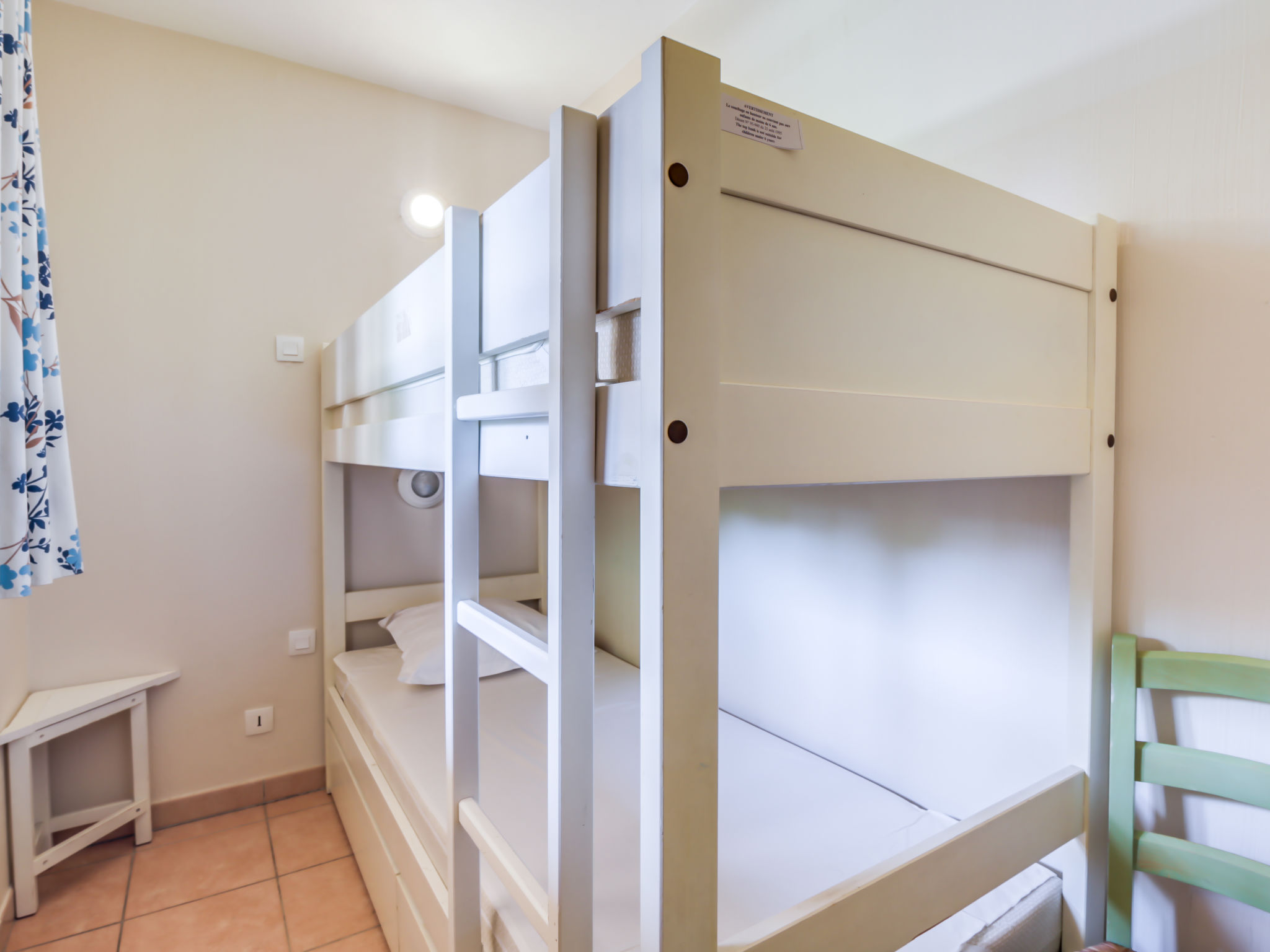 3-Zimmer-Wohnung 45 m2 auf 2 Stockwerken im 2. Stock. Zweckmässig und schön eingerichtet: Wohn-/Esszimmer mit 2 Betten (80 cm, Länge 190 cm), TV (Flachbildschirm). Ausgang zur Terrasse. Kabine mit 1 x 2 Etagenbetten (80 cm, Länge 190 cm). Kochnische (Geschirrspüler, 4 Glaskeramikherd Platten, Toaster, Wasserkocher, Tiefkühler, elektrische Kaffeemaschine, Kombinationsmikrowelle). Dusche/WC. Obergeschoss: 1 Zimmer mit 1 franz. Bett (140 cm, Länge 190 cm). Ausgang zum Balkon. Bad/WC. E-Heizung. Balkon 12 m2, Westlage, Terrasse 7 m2, überdacht, Westlage. Terrassenmöbel. Schöne Sicht auf das Meer. Zur Verfügung: Waschmaschine. Internet (Wireless LAN, extra). Parkplatz Nr. 549 (niveau 2) (überdacht), Höhe 190 cm, Breite 249 cm. Bitte beachten: Nichtraucher-Unterkunft. TV nur FR. Rauchmelder. Inserat einer Privatperson nach Artikel 155, IV, CGI.