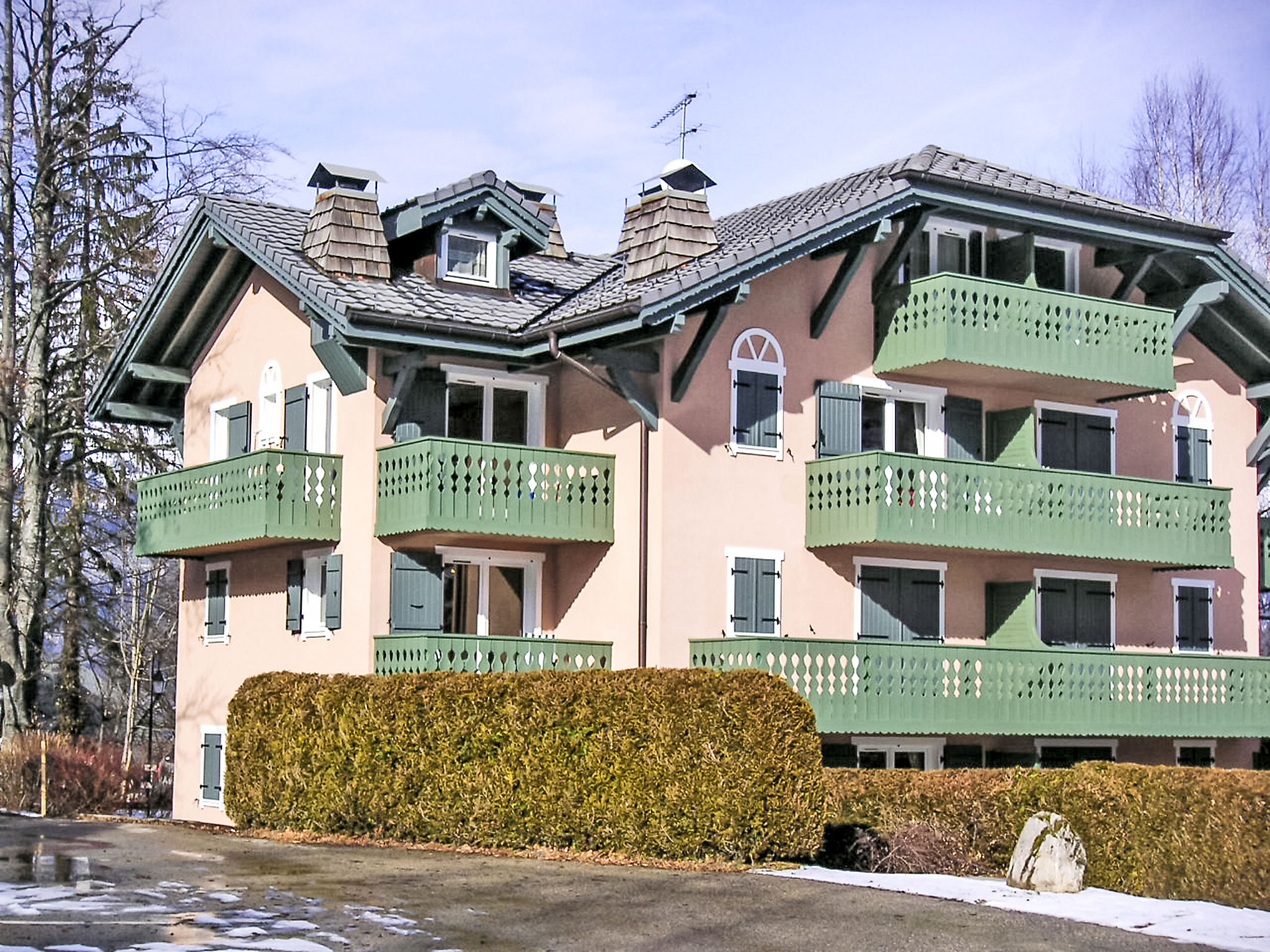 Residenz "Parc du Mont Joly". Am Ortsrand, 800 m vom Zentrum von St Gervais, ruhige, sonnige Lage, an einer Strasse. Zur Mitbenutzung: Park 4'000 m2 (eingezäunt). In der Anlage: Skiraum. Im Winter bitte Schneeketten mitbringen. Einkaufsgeschäft, Bäckerei 500 m, Bahnstation "Saint Gervais les Bains le Fayet" 5.8 km, Freibad 1.2 km, Thermalbad "Thermes de Saint Gervais" 6.3 km. Tennis 1.2 km, Sportzentrum 1.2 km, Skisportanlagen, Skipisten 750 m, Eisfeld 700 m. Bekannte Skigebiete sind gut erreichbar: Evasion Mont Blanc. Bitte beachten: Fahrzeug empfohlen. Die Residenz wird durch elektrische Tore geschlossen.