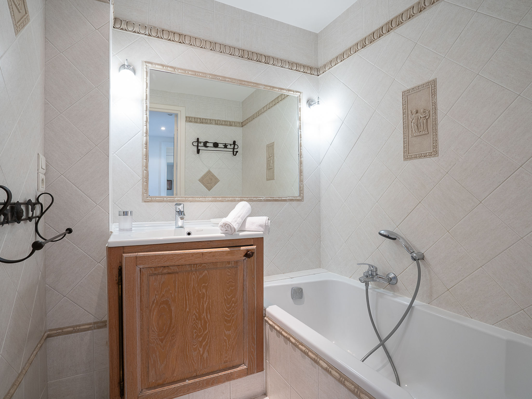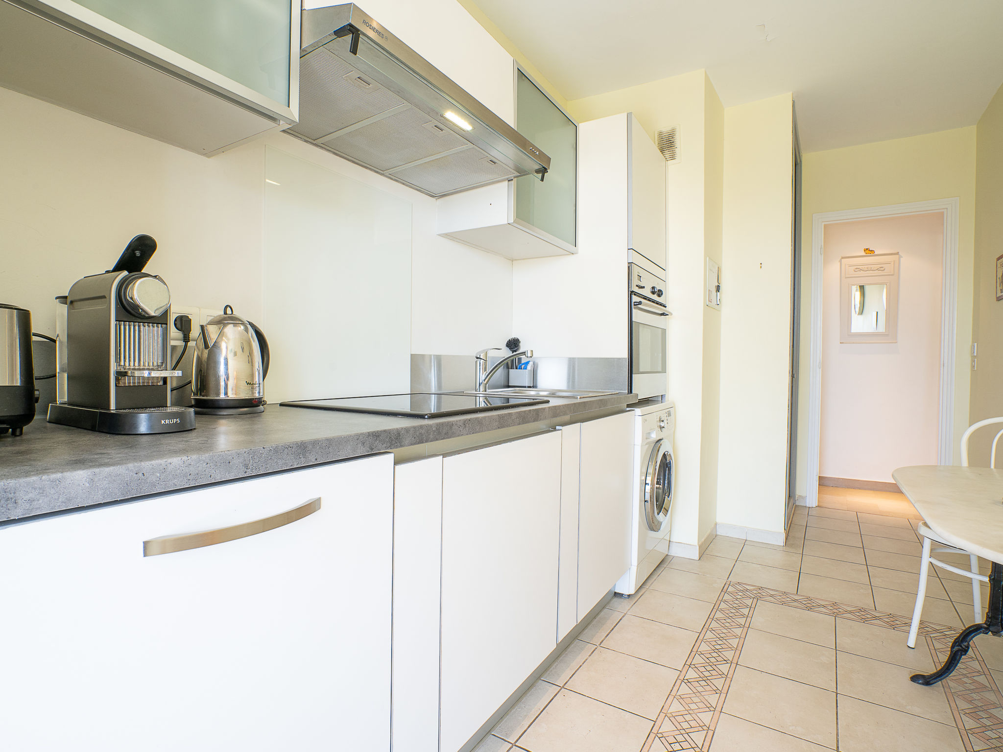 2-Zimmer-Wohnung 50 m2 im 3. Stock. Komfortabel und schön eingerichtet: Wohn-/Esszimmer mit 1 Doppeldiwanbett (1 x 140 cm, Länge 190 cm), TV. Ausgang zur Terrasse. 1 Zimmer mit 2 Betten (90 cm, Länge 140 cm). Küche (Backofen, Geschirrspüler, 4 Glaskeramikherd Platten, elektrische Kaffeemaschine). Ausgang zur Terrasse. Bad/WC. Bodenheizung. Terrasse 10 m2, Terrasse. Terrassenmöbel. Zur Verfügung: Waschmaschine. Internet (Wireless LAN, gratis). Bitte beachten: Rauchmelder. 06029021516HT