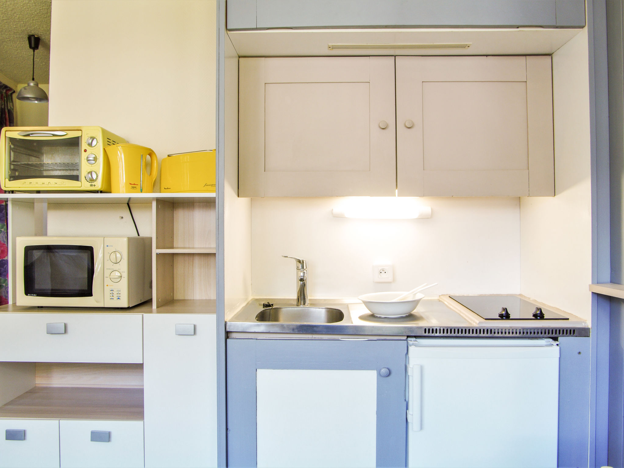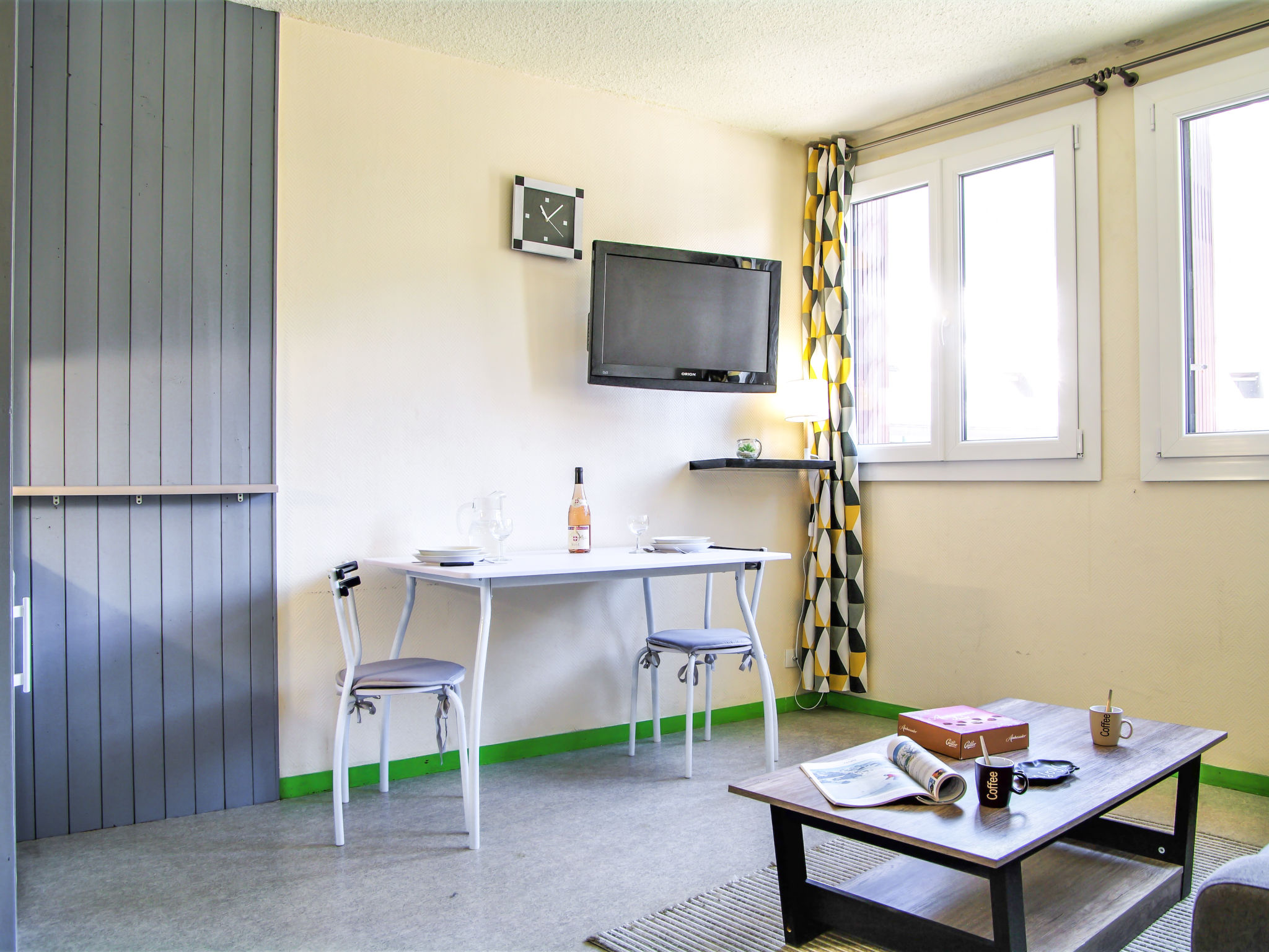 1-Zimmer-Studio 19 m2 im 3. Stock, Nordwestlage. Wohn-/Esszimmer mit 1 Doppeldiwanbett (160 cm, Länge 200 cm), TV. Kochnische (2 Kochplatten, Backofen, Wasserkocher, Mikrowelle, elektrische Kaffeemaschine). Dusche/WC. E-Heizung, Boiler. Sicht auf die Berge. Zur Verfügung: Internet (Wireless LAN, extra). Höhe 185 cm. Bitte beachten: TV nur FR. Rauchmelder. Inserat einer Privatperson nach Artikel 155, IV, CGI.