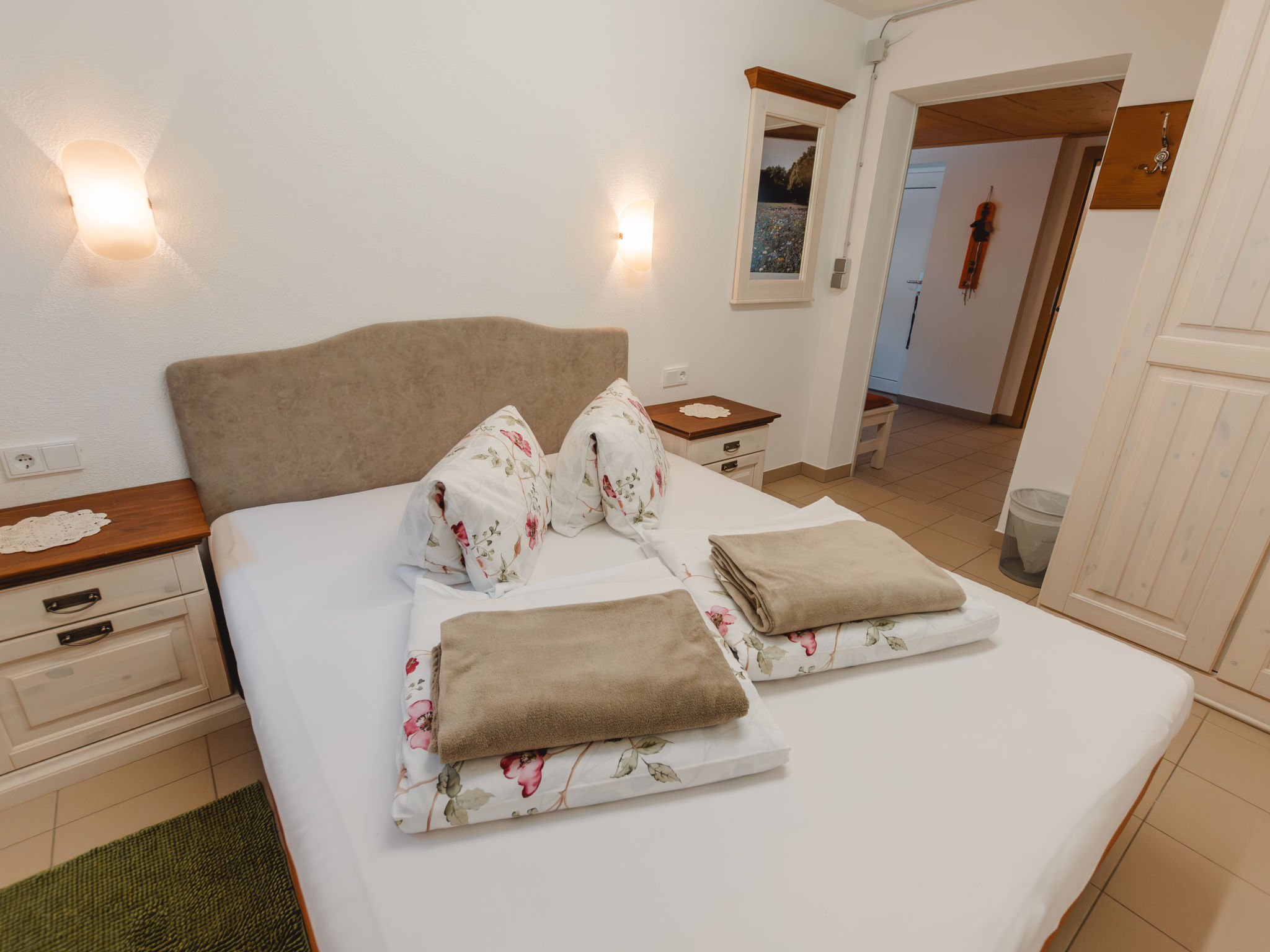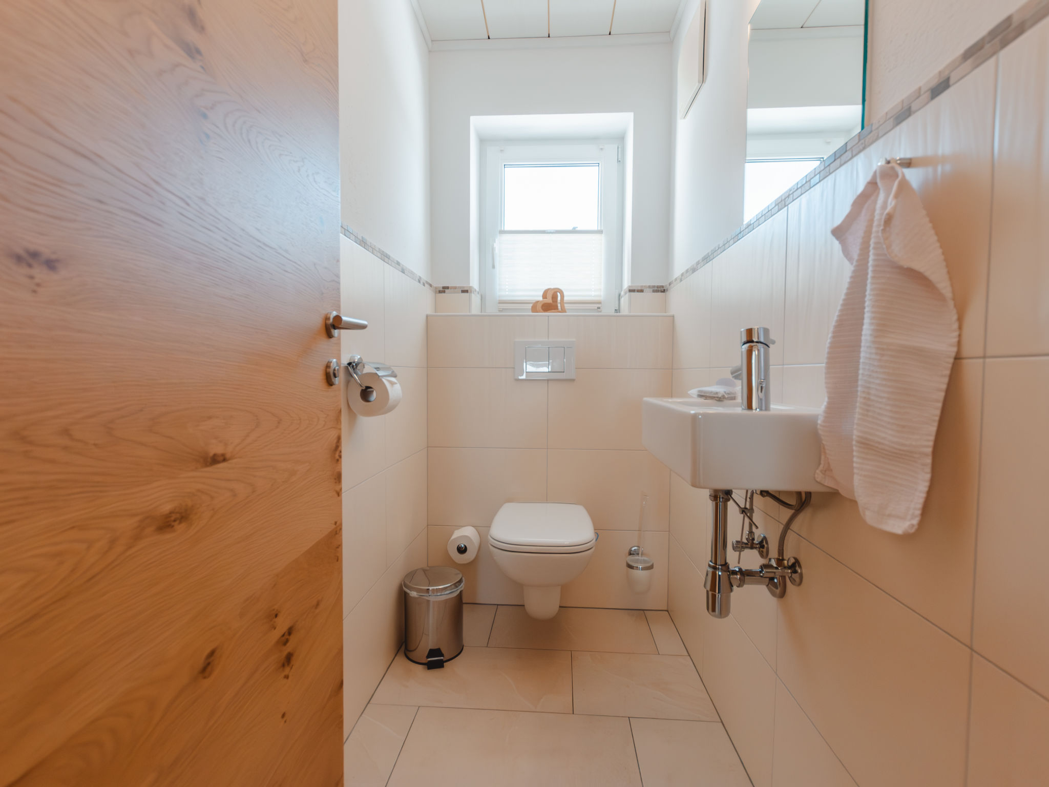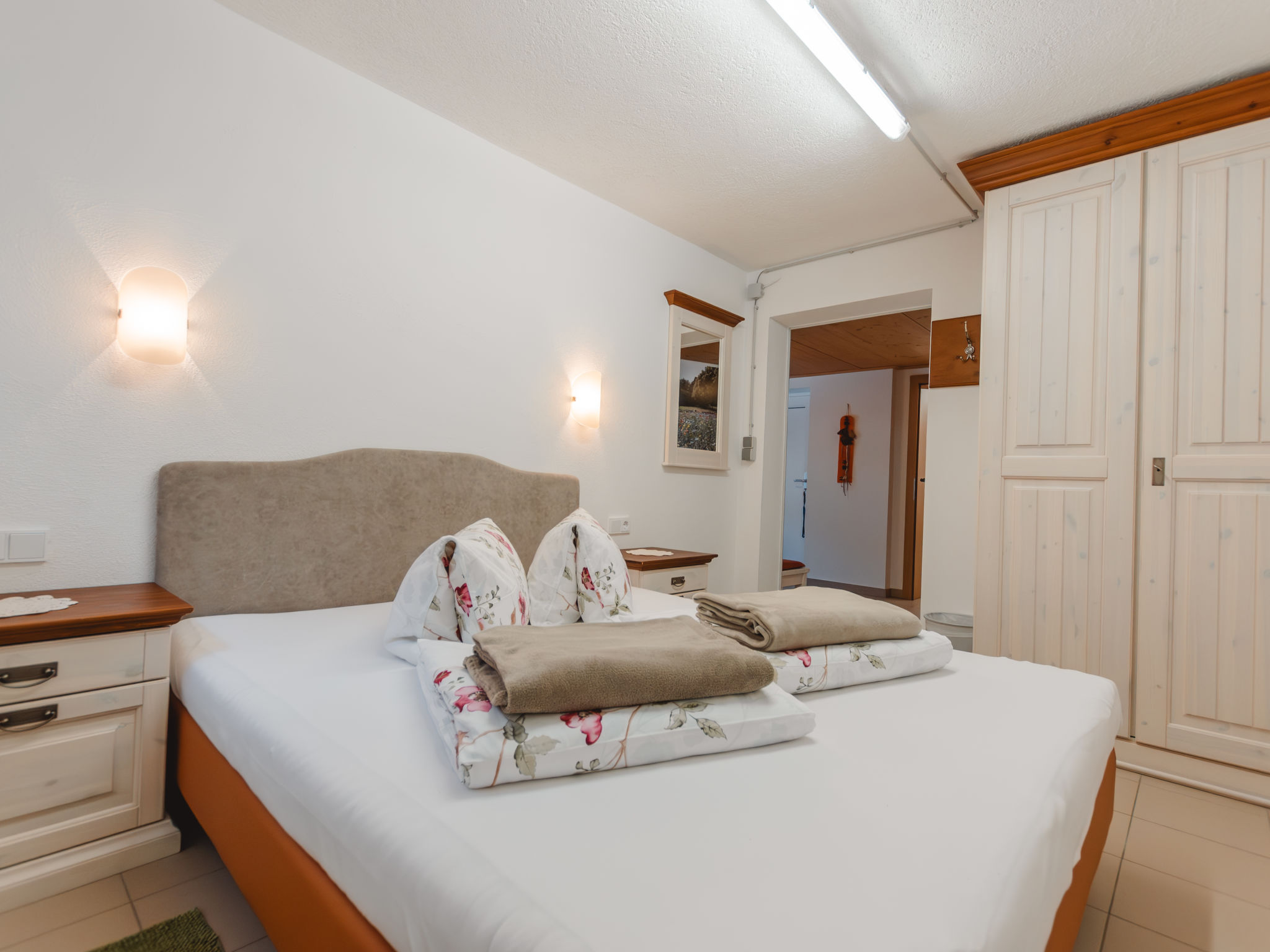 5-Zimmer-Wohnung, Erdgeschoss (Hanglage), ca. 120 m². Separater Eingang über Terrasse in Flur mit Garderobe. Kleiner Wohnraum mit 2 Sesseln. Wohnraum mit Essplatz (Eckbank) und Küchenzeile (4 Ceranfelder, Backofen, Mikrowelle, Geschirrspüler, Kühlschrank, Kaffeemaschine, Wasserkocher, Toaster). Doppelzimmer (höher gelegenes Fenster). 2 Schlafzimmer, jeweils mit Doppelbett, Einzelbett, Terrassenausgang und Dusche/WC. Sep.WC. Bei Belegung mit weniger Personen als der maximalen Personenzahl stehen nicht alle Wohneinheiten zur Verfügung. 50601-000537-2020