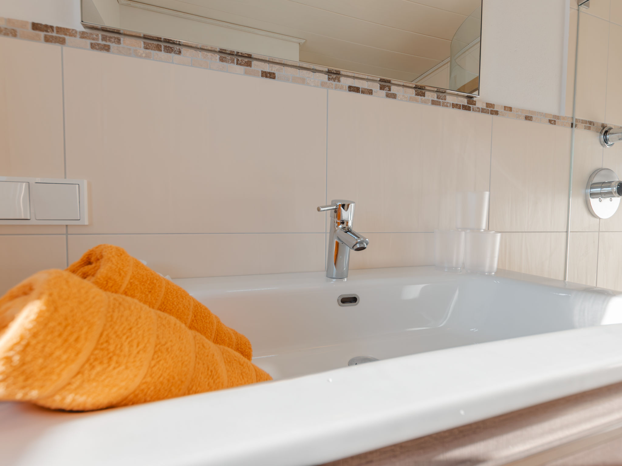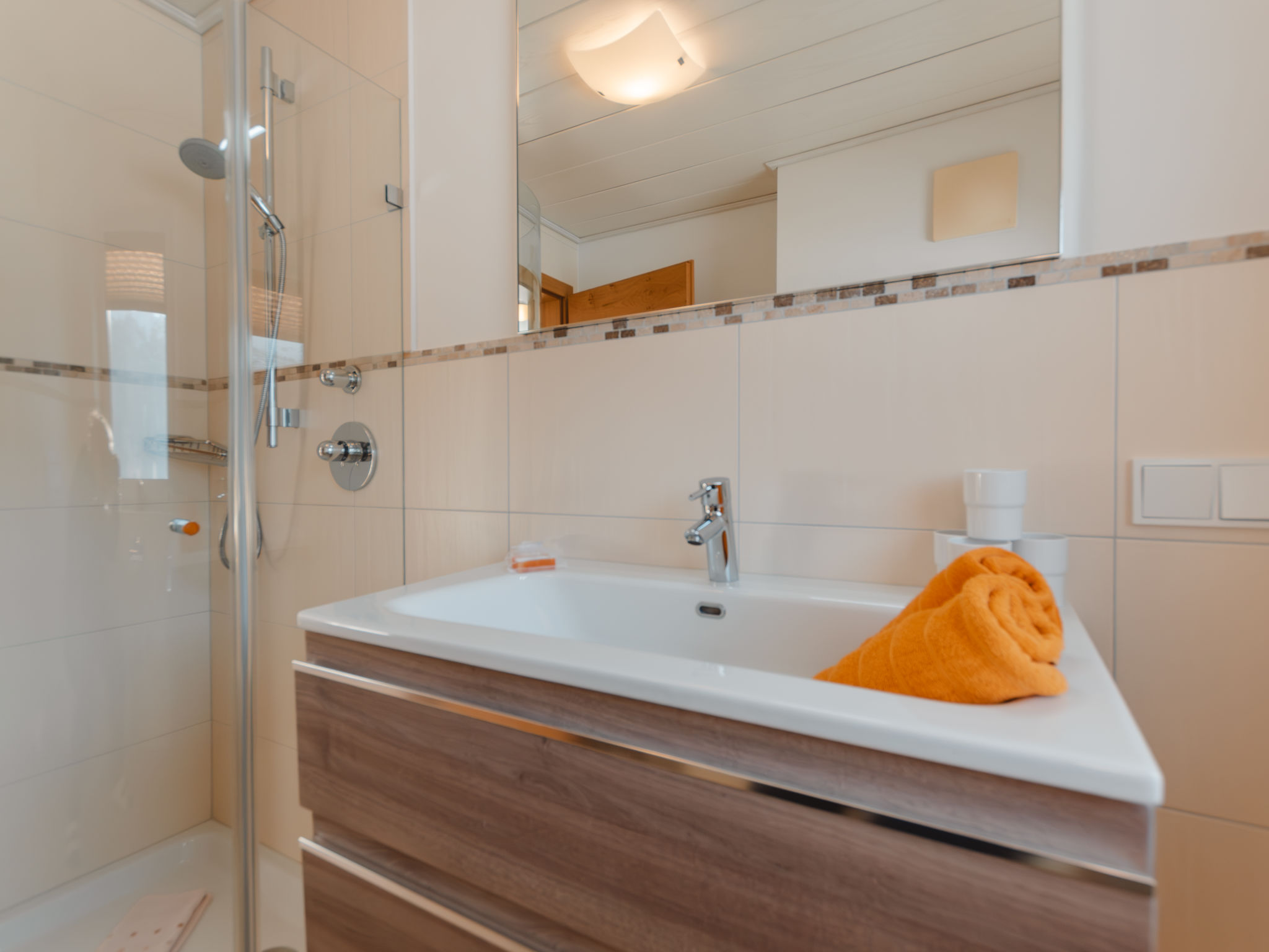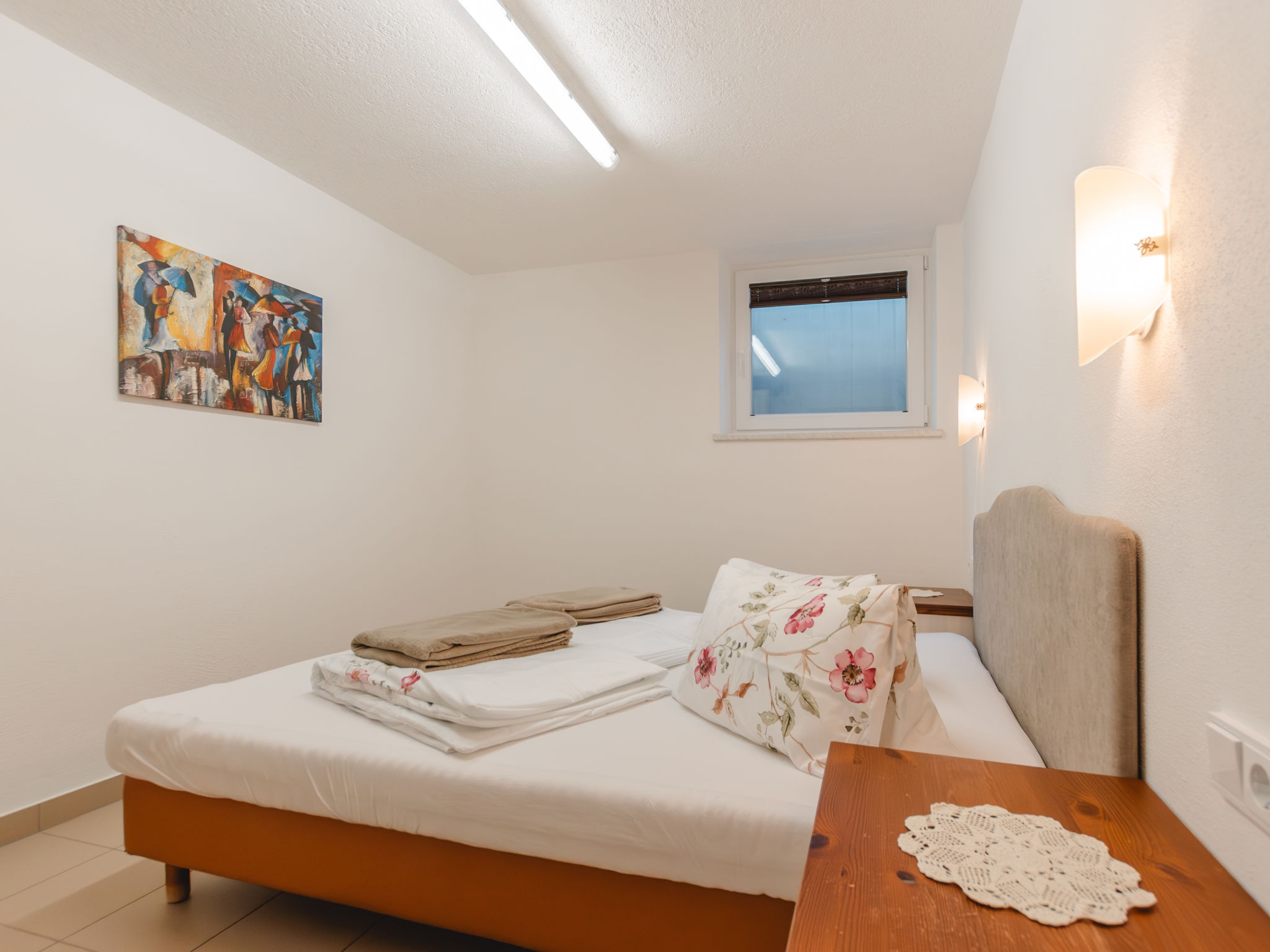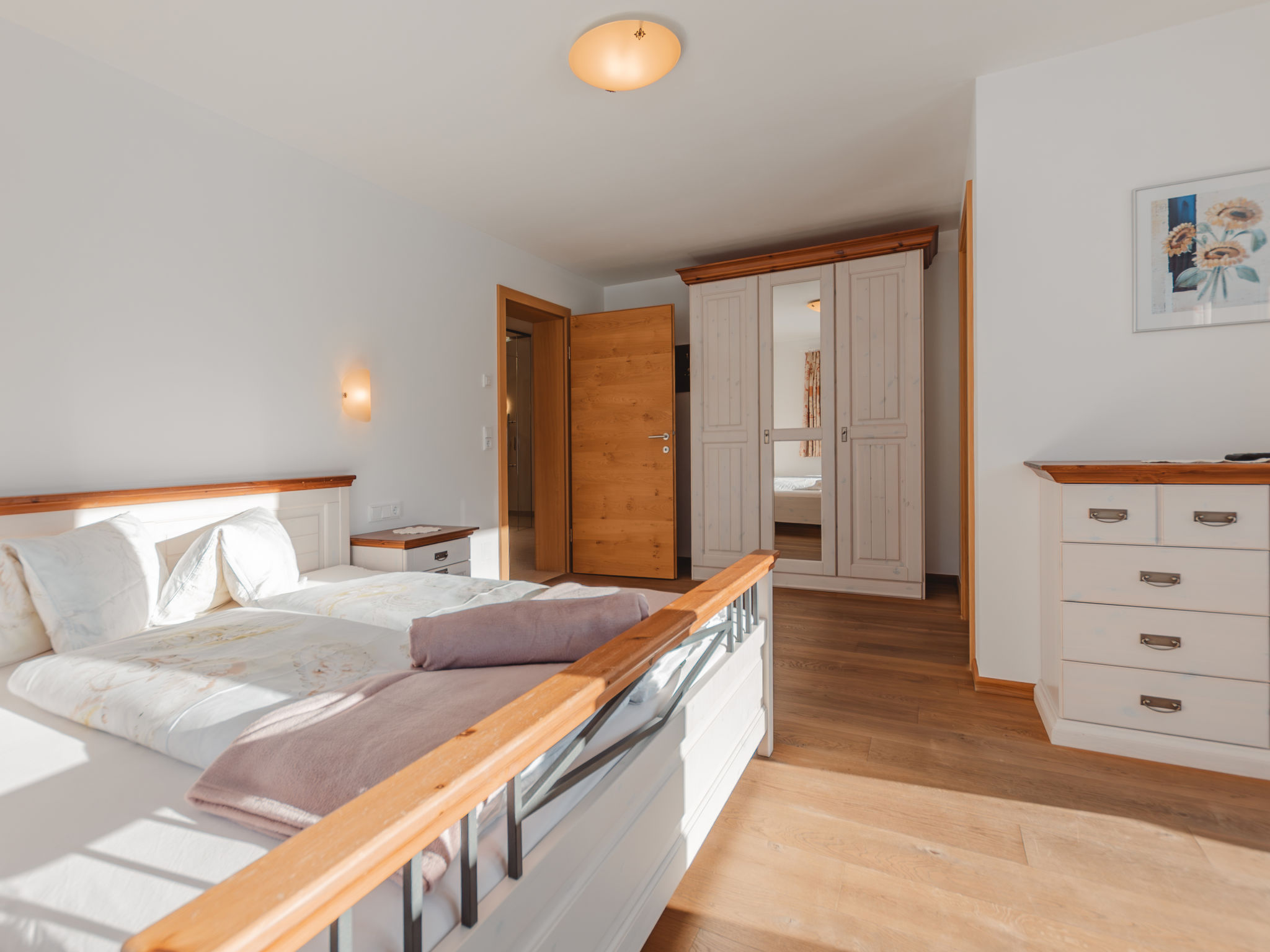 5-Zimmer-Wohnung, Erdgeschoss (Hanglage), ca. 120 m². Separater Eingang über Terrasse in Flur mit Garderobe. Kleiner Wohnraum mit 2 Sesseln. Wohnraum mit Essplatz (Eckbank) und Küchenzeile (4 Ceranfelder, Backofen, Mikrowelle, Geschirrspüler, Kühlschrank, Kaffeemaschine, Wasserkocher, Toaster). Doppelzimmer (höher gelegenes Fenster). 2 Schlafzimmer, jeweils mit Doppelbett, Einzelbett, Terrassenausgang und Dusche/WC. Sep.WC. Bei Belegung mit weniger Personen als der maximalen Personenzahl stehen nicht alle Wohneinheiten zur Verfügung. 50601-000537-2020