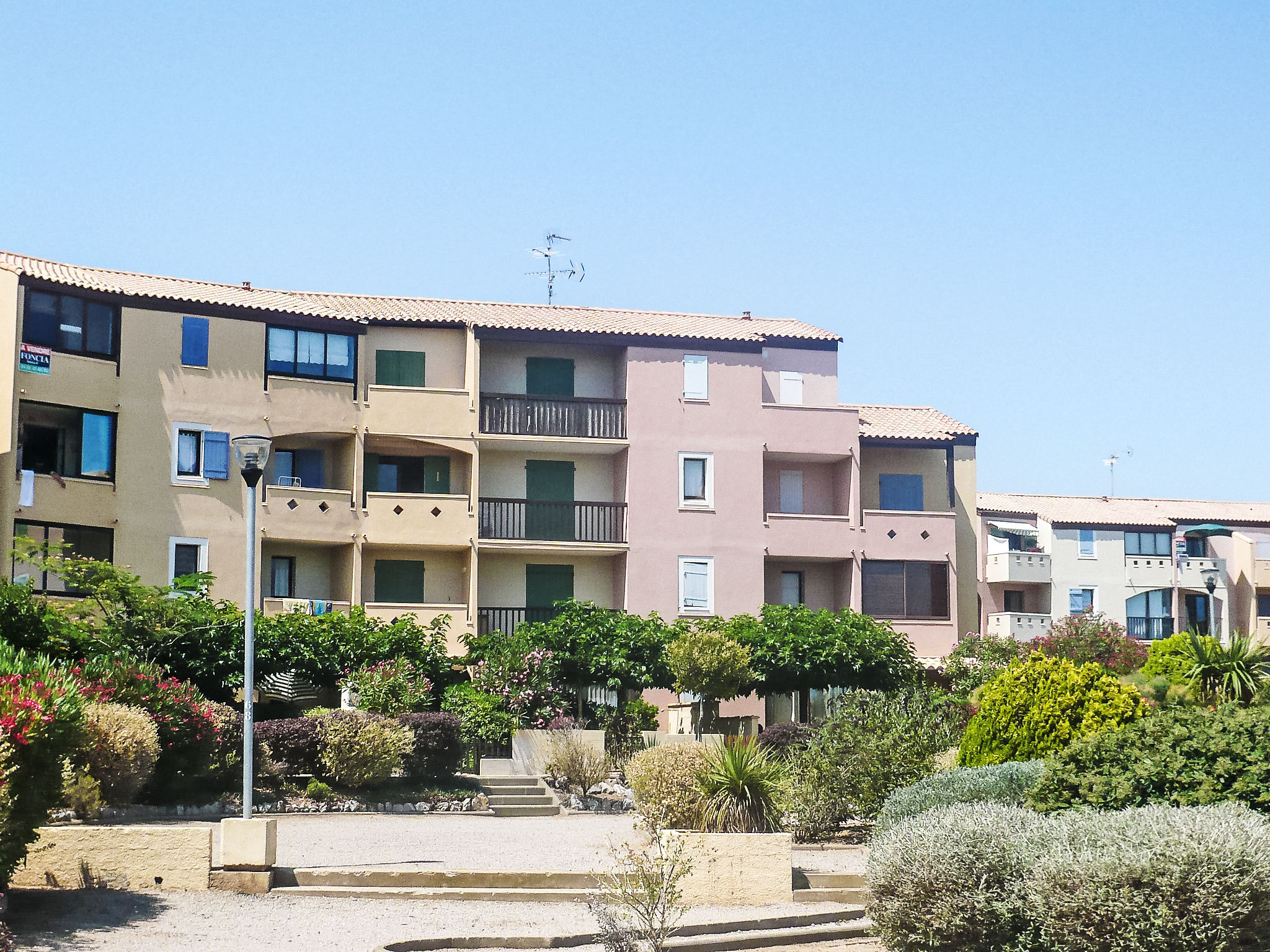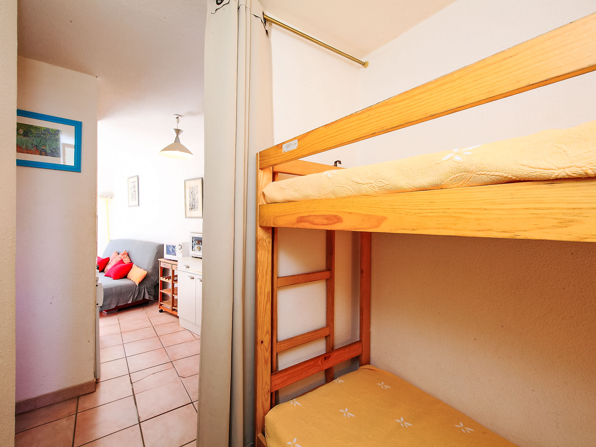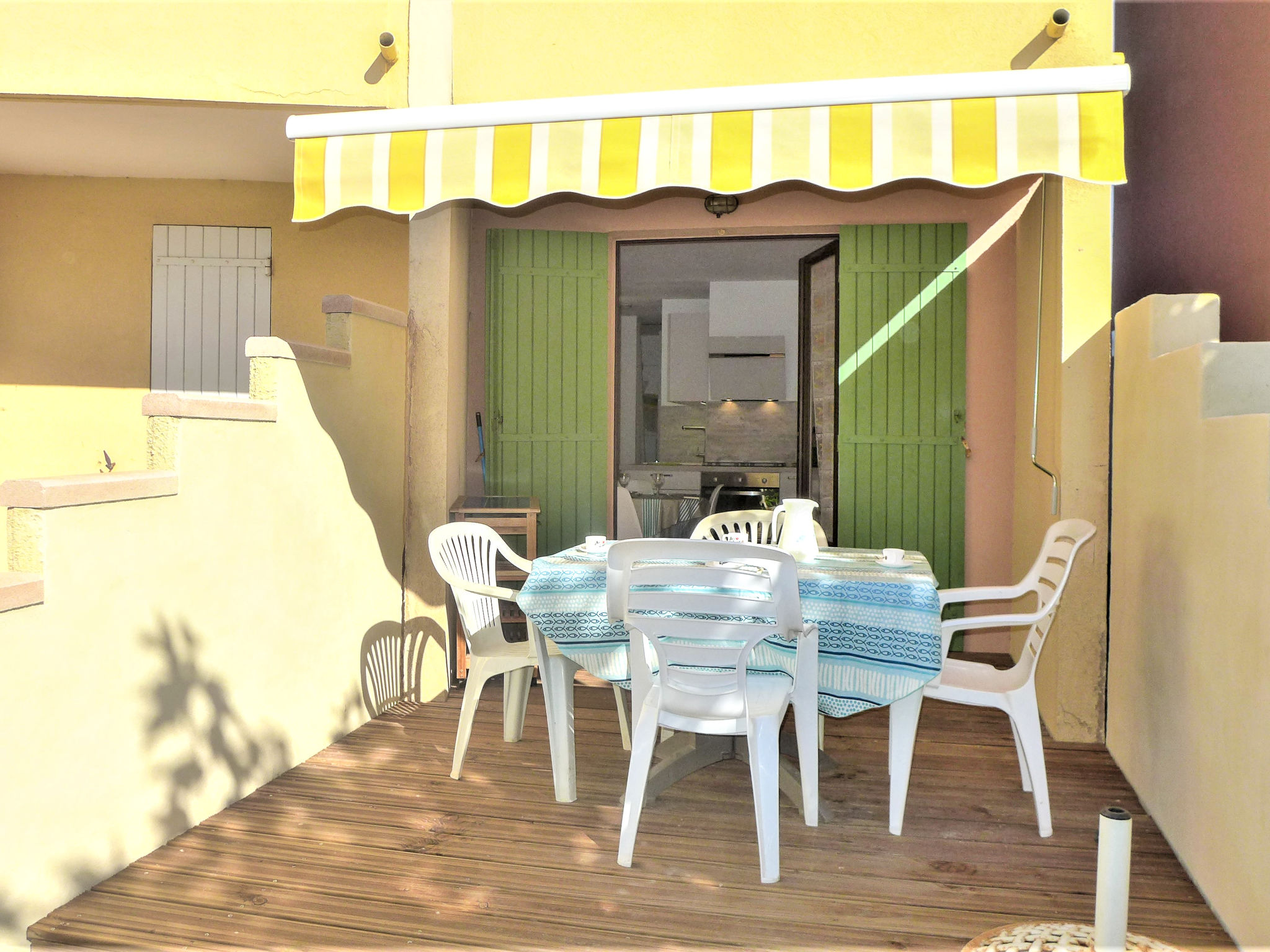 Residenz "Les Terrasses de la Méditérranée". Oberhalb von Saint Pierre La Mer, 1 km vom Meer. Zur Mitbenutzung: Schwimmbad (20 x 10 m, 120 - 120 cm tief, saisonale Verfügbarkeit: 15.Jun.-15.Sep.). Tennis. Einkaufsgeschäft 1 km, Restaurant 1 km, Bar 1 km, Tauchzentrum 2 km. Sporthafen 2 km, Reitstall 3 km. Nahe gelegene Sehenswürdigkeiten: Réserve Africaine de sigean 36 km, Cité de Carcassonne 78 km, Espace balnéoludique de Gruissan 11 km. Bitte beachten: Die Schlüsselübergabe findet bei der Agentur Interhome in Narbonne Plage statt, 3 km. Das Foto ist nur ein Hausbeispiel. In diesem Haus sind weitere Ferienwohnungen mietbar.