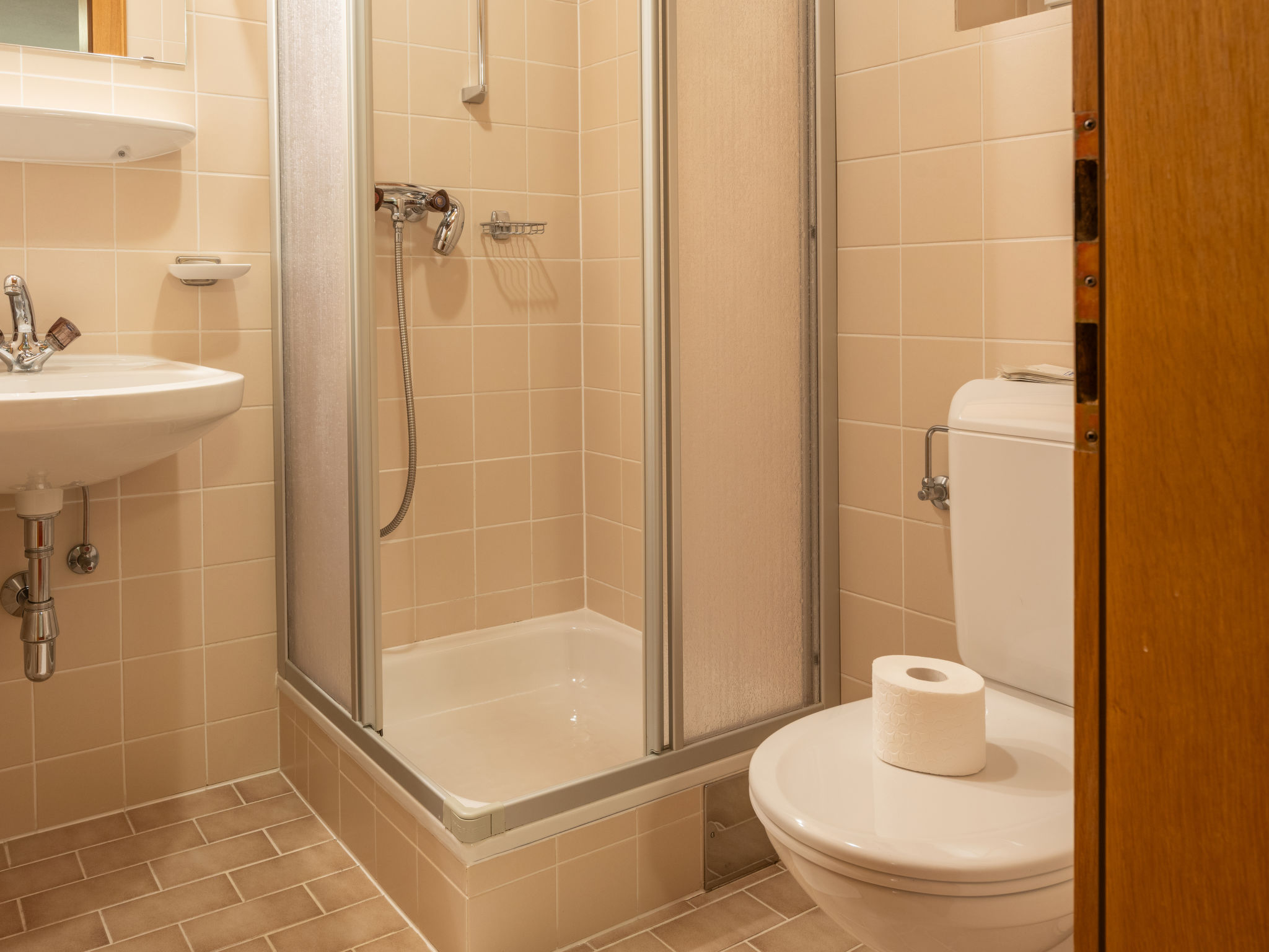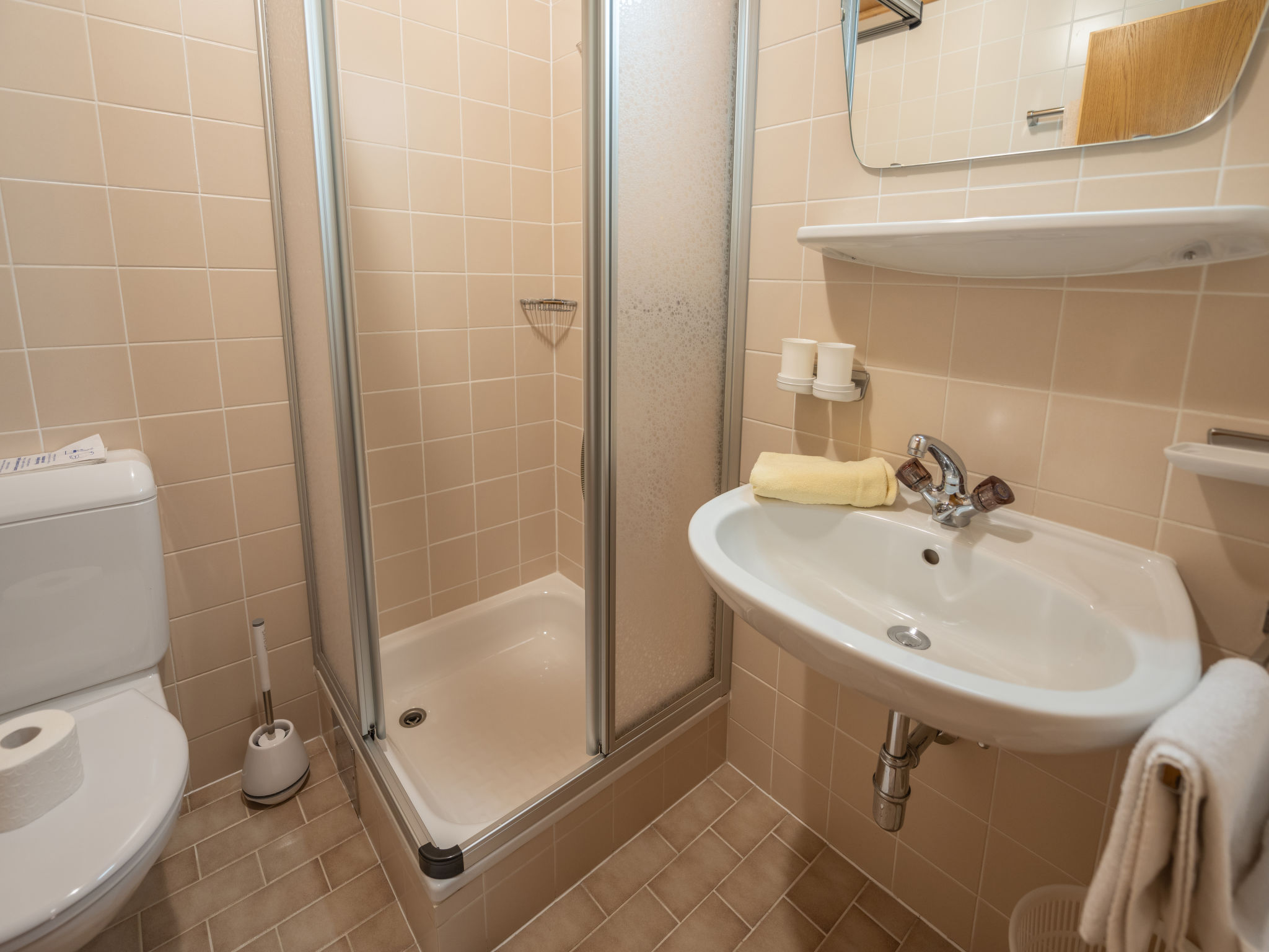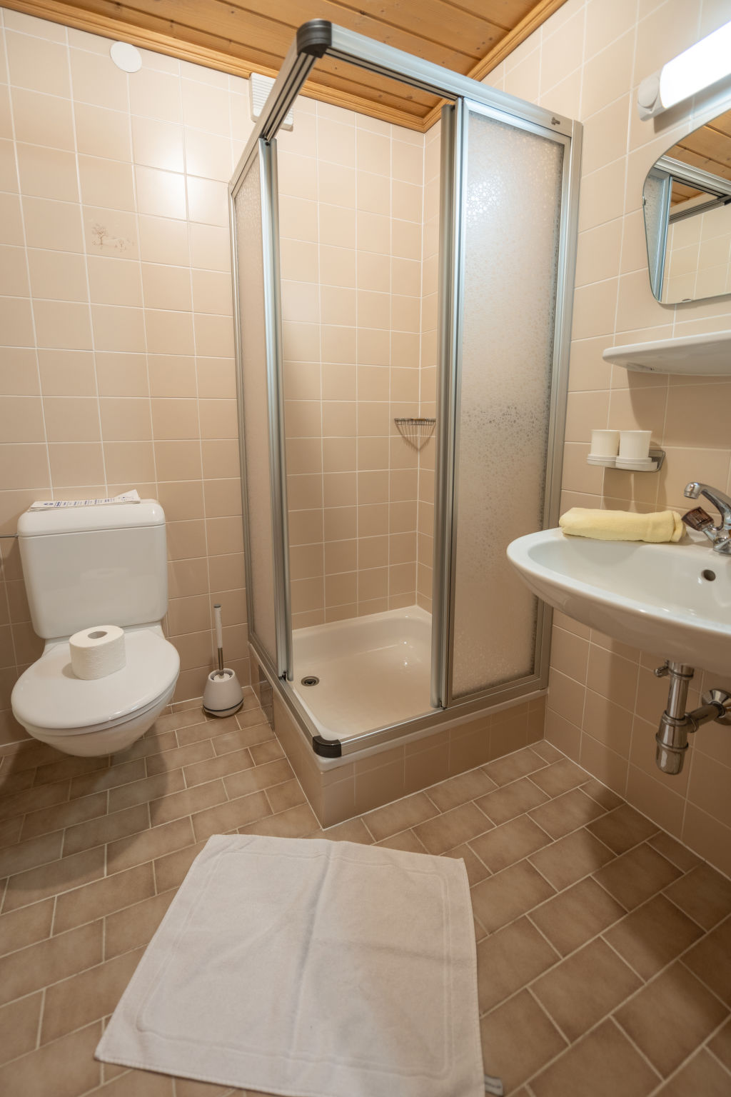 6-Zimmer-Wohnung, 2 Etagen, ca. 130 m². Erdgeschoss (Hanglage): Flur. Großer Wohn-/Aufenthaltsraum mit Essecken für 11 Personen und Küchenzeile (4 Ceranfelder, Backofen, Mikrowelle, Geschirrspüler, Kühlschrank, kleiner Gefrierschrank, Kaffeemaschine, Wasserkocher, Toaster), Terrassenausgang. Sep.WC. 2. Etage: 2 Doppelzimmer, jeweils mit Dusche/WC. 2 Schlafzimmer, jeweils mit Doppelbett, Bettcouch und Dusche/WC. Einzelzimmer mit Dusche/WC. Bei Belegung mit weniger Personen als der maximalen Personenzahl stehen nicht alle Wohneinheiten zur Verfügung.