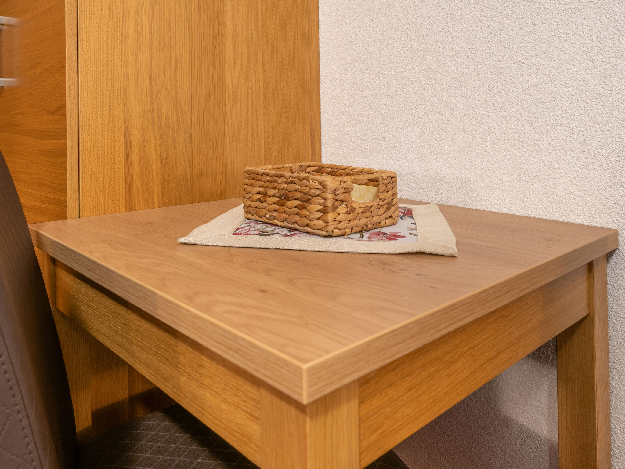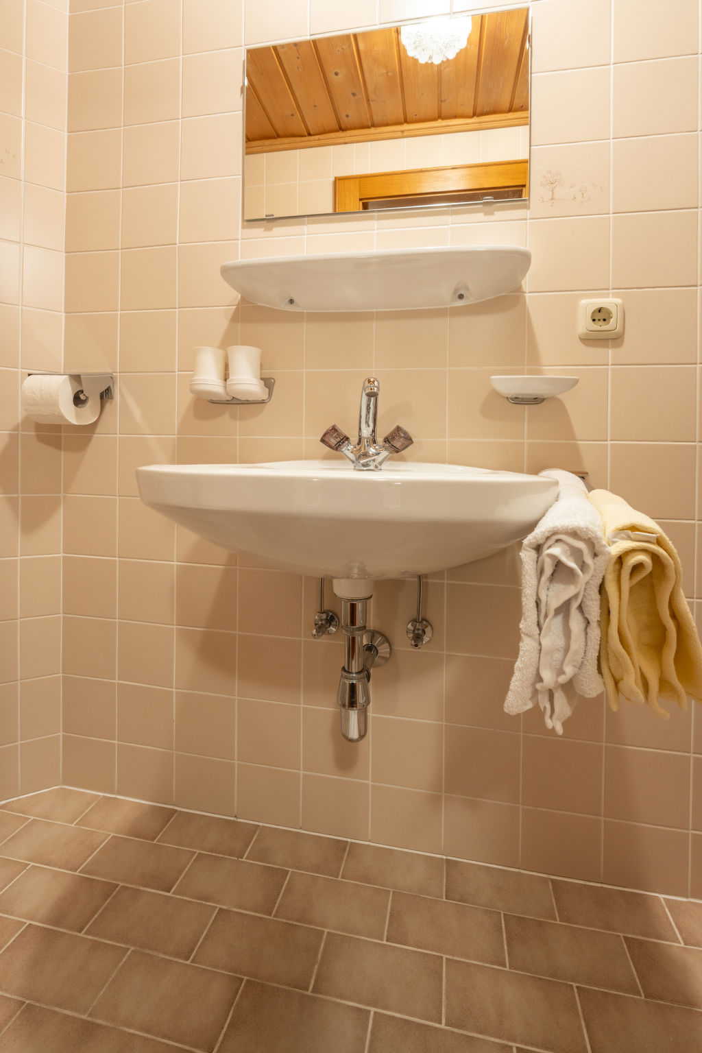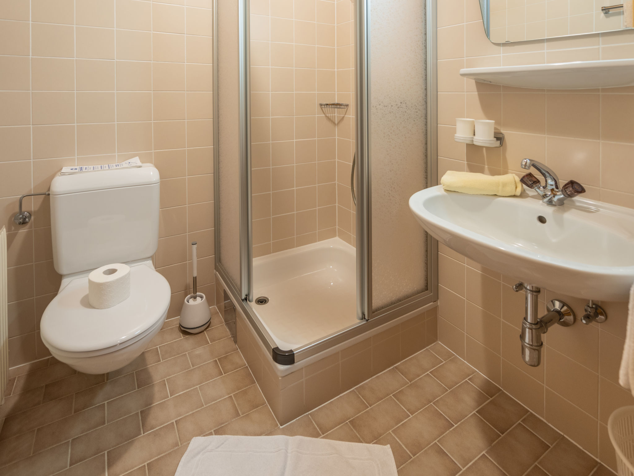 6-Zimmer-Wohnung, 2 Etagen, ca. 130 m². Erdgeschoss (Hanglage): Flur. Großer Wohn-/Aufenthaltsraum mit Essecken für 11 Personen und Küchenzeile (4 Ceranfelder, Backofen, Mikrowelle, Geschirrspüler, Kühlschrank, kleiner Gefrierschrank, Kaffeemaschine, Wasserkocher, Toaster), Terrassenausgang. Sep.WC. 2. Etage: 2 Doppelzimmer, jeweils mit Dusche/WC. 2 Schlafzimmer, jeweils mit Doppelbett, Bettcouch und Dusche/WC. Einzelzimmer mit Dusche/WC. Bei Belegung mit weniger Personen als der maximalen Personenzahl stehen nicht alle Wohneinheiten zur Verfügung.