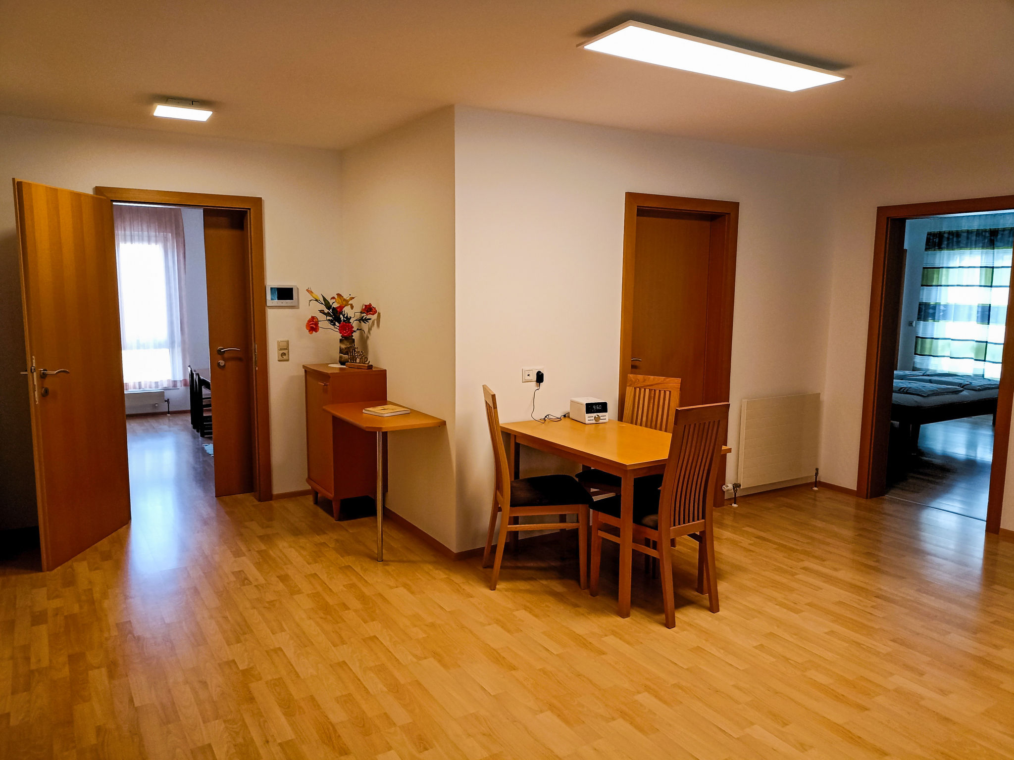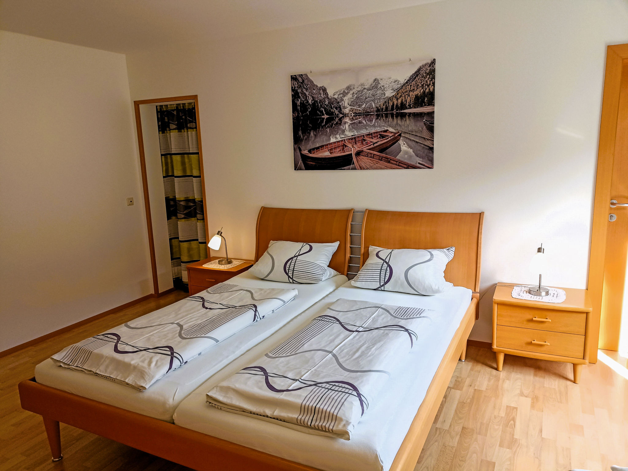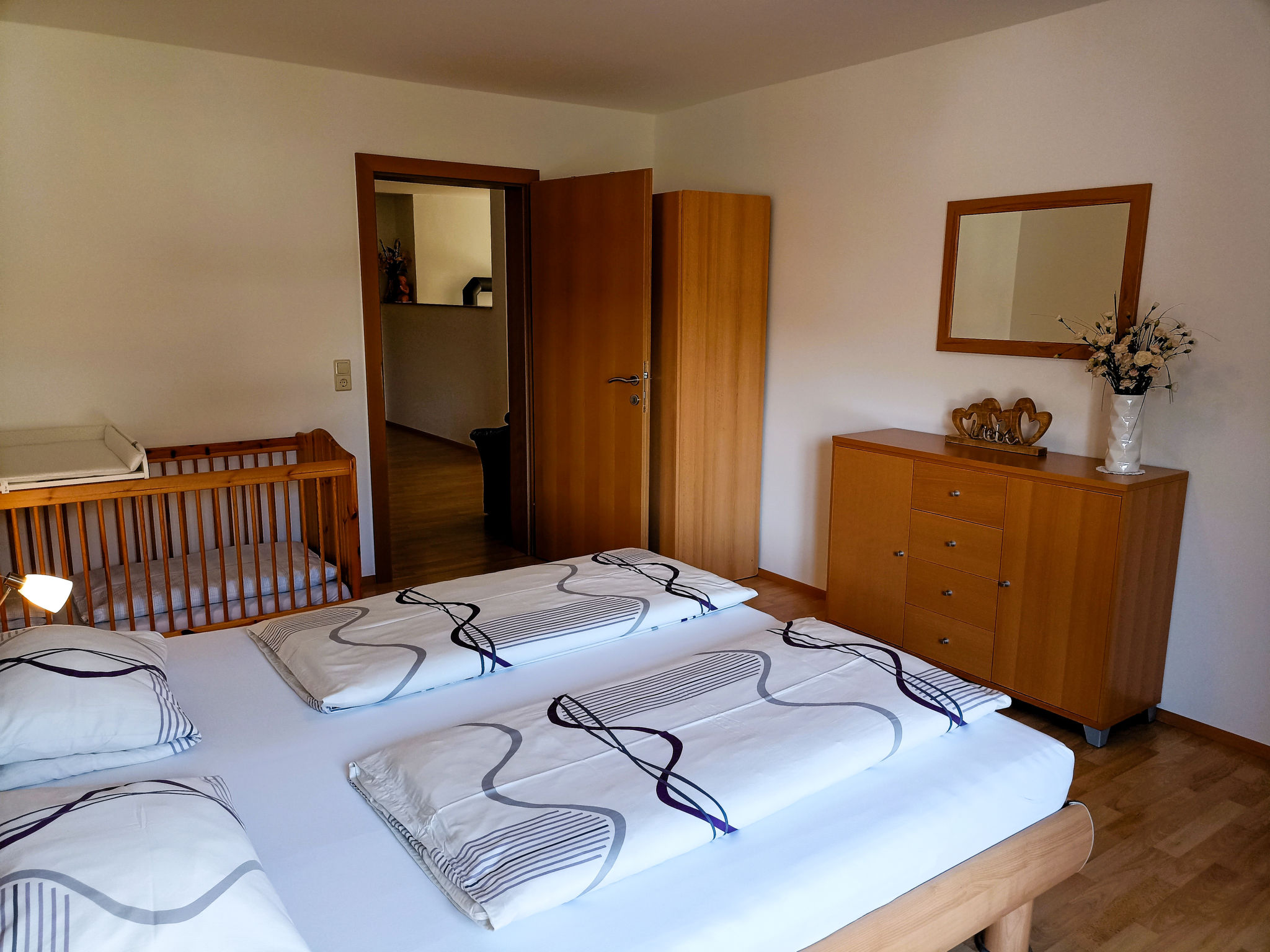 "Schmidt (VNN140)", 5-Zimmer-Wohnung 140 m2, im Erdgeschoss. Komfortabel und modern eingerichtet: Wohnzimmer mit Schwedenofen, Sat-TV und DVD. Ausgang zur Terrasse. 1 Doppelzimmer. 1 kleines Doppelzimmer. 1 Zimmer mit 2 Betten. Küche (Backofen, Geschirrspüler, 4 Glaskeramikherd Platten, Toaster, Wasserkocher, Mikrowelle, Tiefkühler, elektrische Kaffeemaschine, Fondue Set (Käse)) mit Esstisch. Ausgang zur Terrasse. Bad/WC, sep. WC. Heizung. 2 Terrassen 12 m2, überdacht. Terrassenmöbel, Gartengrill. Zur Verfügung: Waschmaschine, Kinderhochstuhl, Babybett. Internet (Wireless LAN, gratis). Bitte beachten: Nichtraucher-Unterkunft. Maximal 1 Haustier/Hund erlaubt.