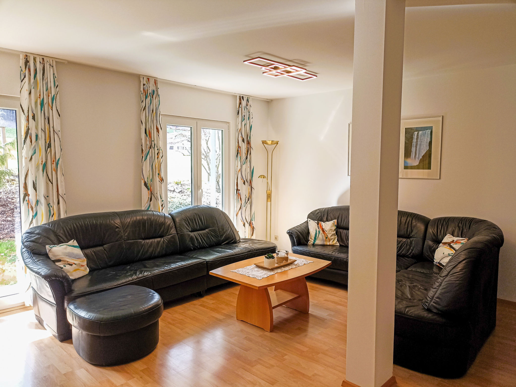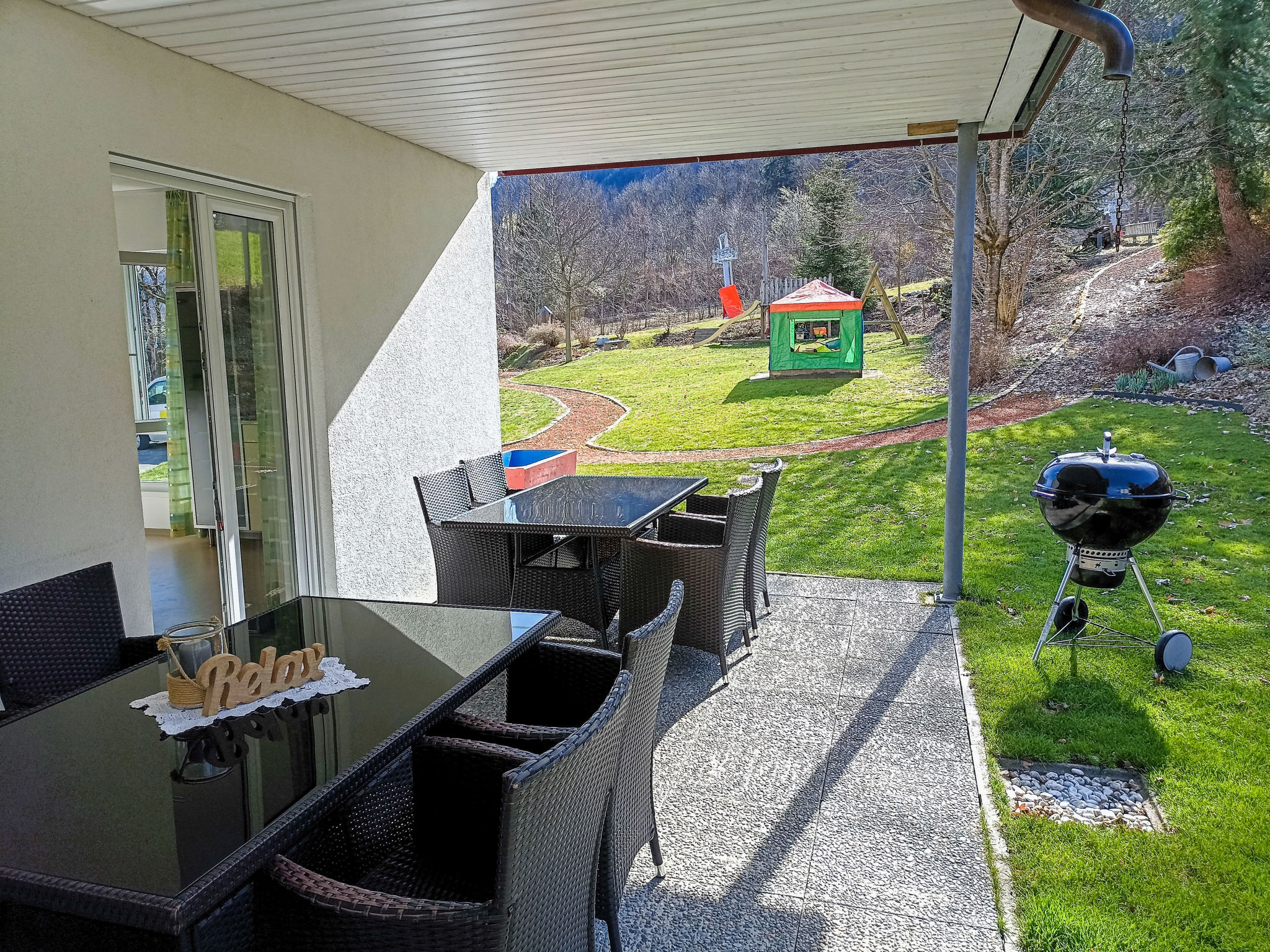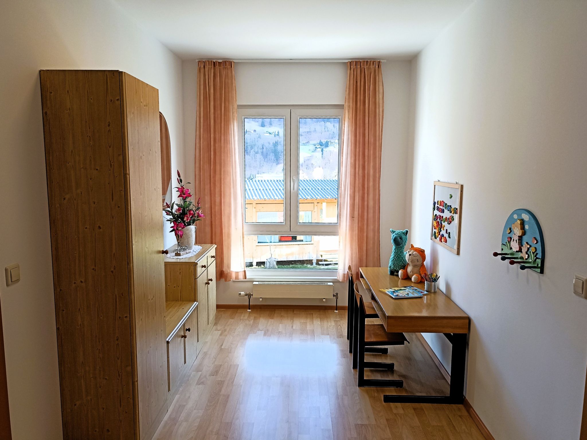 "Schmidt (VNN140)", 5-Zimmer-Wohnung 140 m2, im Erdgeschoss. Komfortabel und modern eingerichtet: Wohnzimmer mit Schwedenofen, Sat-TV und DVD. Ausgang zur Terrasse. 1 Doppelzimmer. 1 kleines Doppelzimmer. 1 Zimmer mit 2 Betten. Küche (Backofen, Geschirrspüler, 4 Glaskeramikherd Platten, Toaster, Wasserkocher, Mikrowelle, Tiefkühler, elektrische Kaffeemaschine, Fondue Set (Käse)) mit Esstisch. Ausgang zur Terrasse. Bad/WC, sep. WC. Heizung. 2 Terrassen 12 m2, überdacht. Terrassenmöbel, Gartengrill. Zur Verfügung: Waschmaschine, Kinderhochstuhl, Babybett. Internet (Wireless LAN, gratis). Bitte beachten: Nichtraucher-Unterkunft. Maximal 1 Haustier/Hund erlaubt.