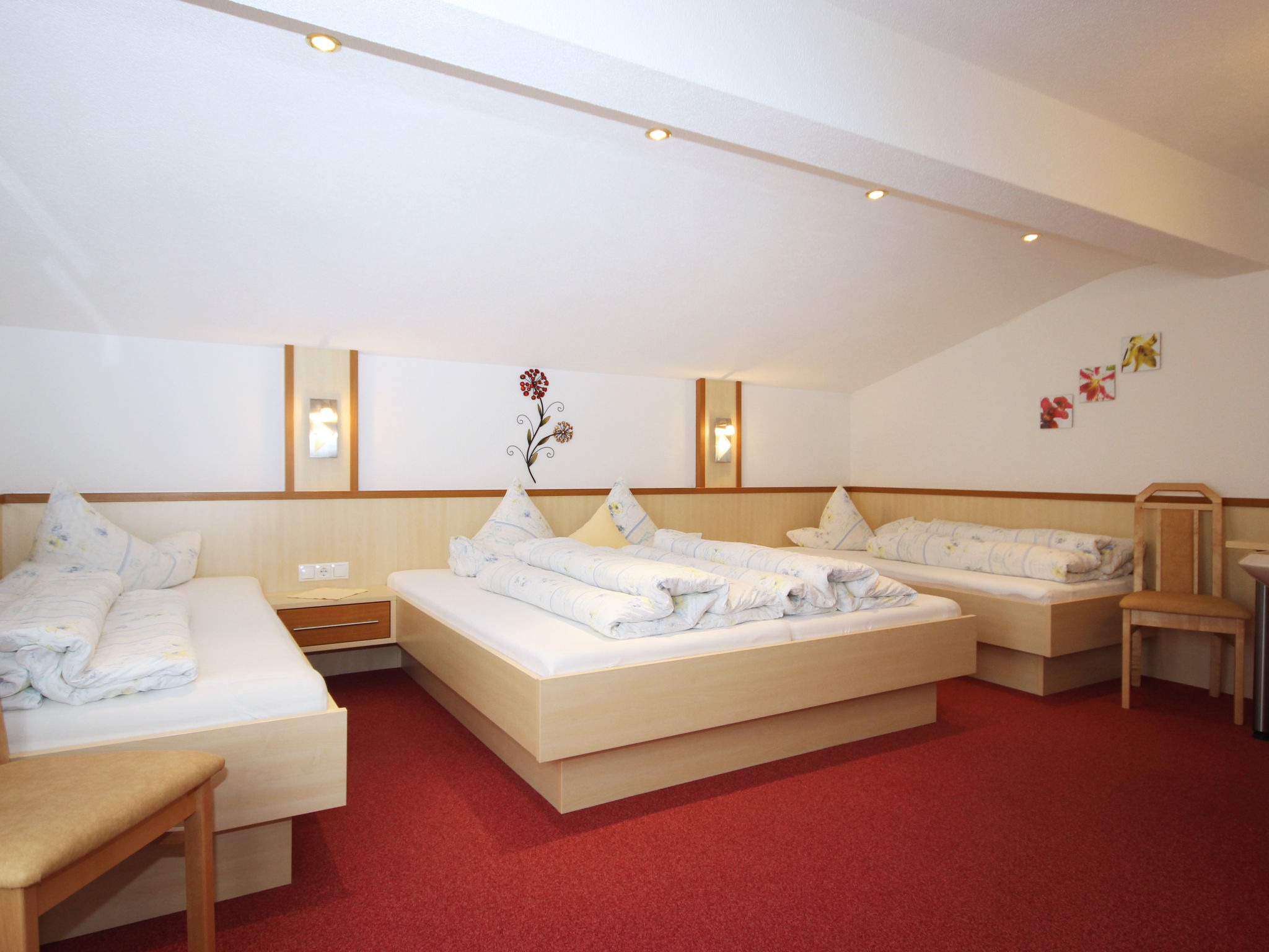 3-Zimmer-Wohnung, 1. Etage (Dachschräge), ca. 80 m². Wohn-/Schlafraum mit Doppelbettcouch, Essplatz (Eckbank), Küchenzeile (4 Platten, Backofen, Geschirrspüler, Kühlschrank, Kaffeemaschine, Wasserkocher, Toaster). Doppelzimmer mit Waschbecken. Schlafzimmer mit Doppelbett, 2 Einzelbetten, Waschbecken, Balkonausgang. Dusche. Sep.WC. Flexibilität bei der Bettenaufteilung: Es stehen mehr Schlafmöglichkeiten zur Verfügung als die maximal zugelassene Personenzahl, diese darf dennoch nicht überschritten werden.
