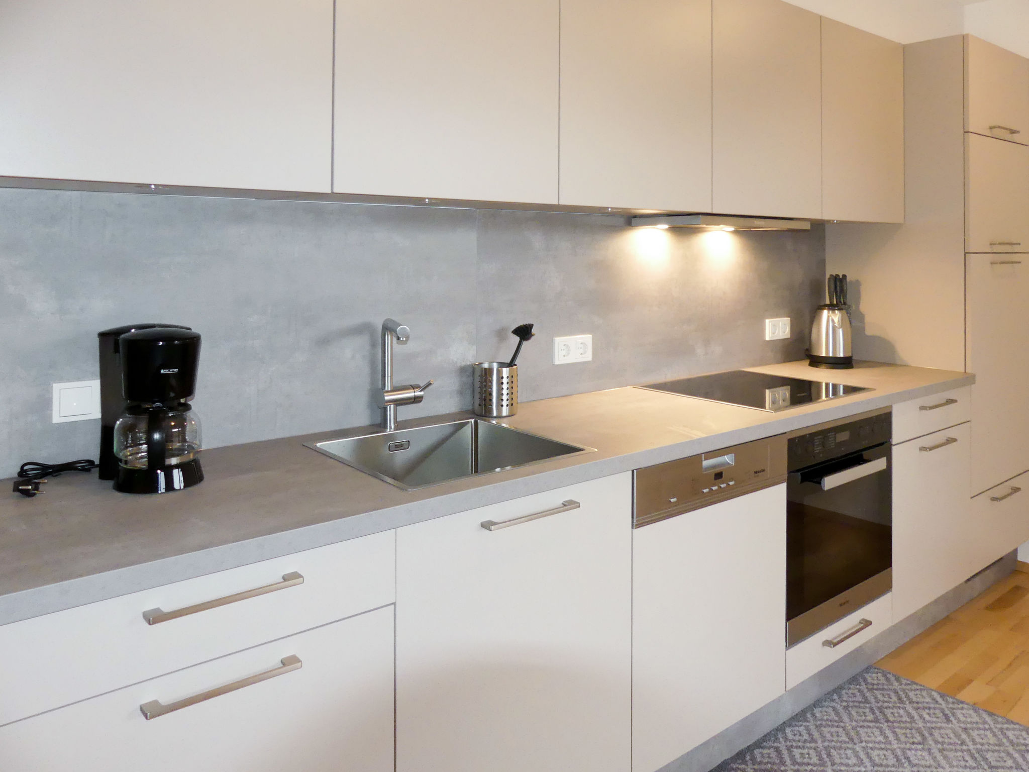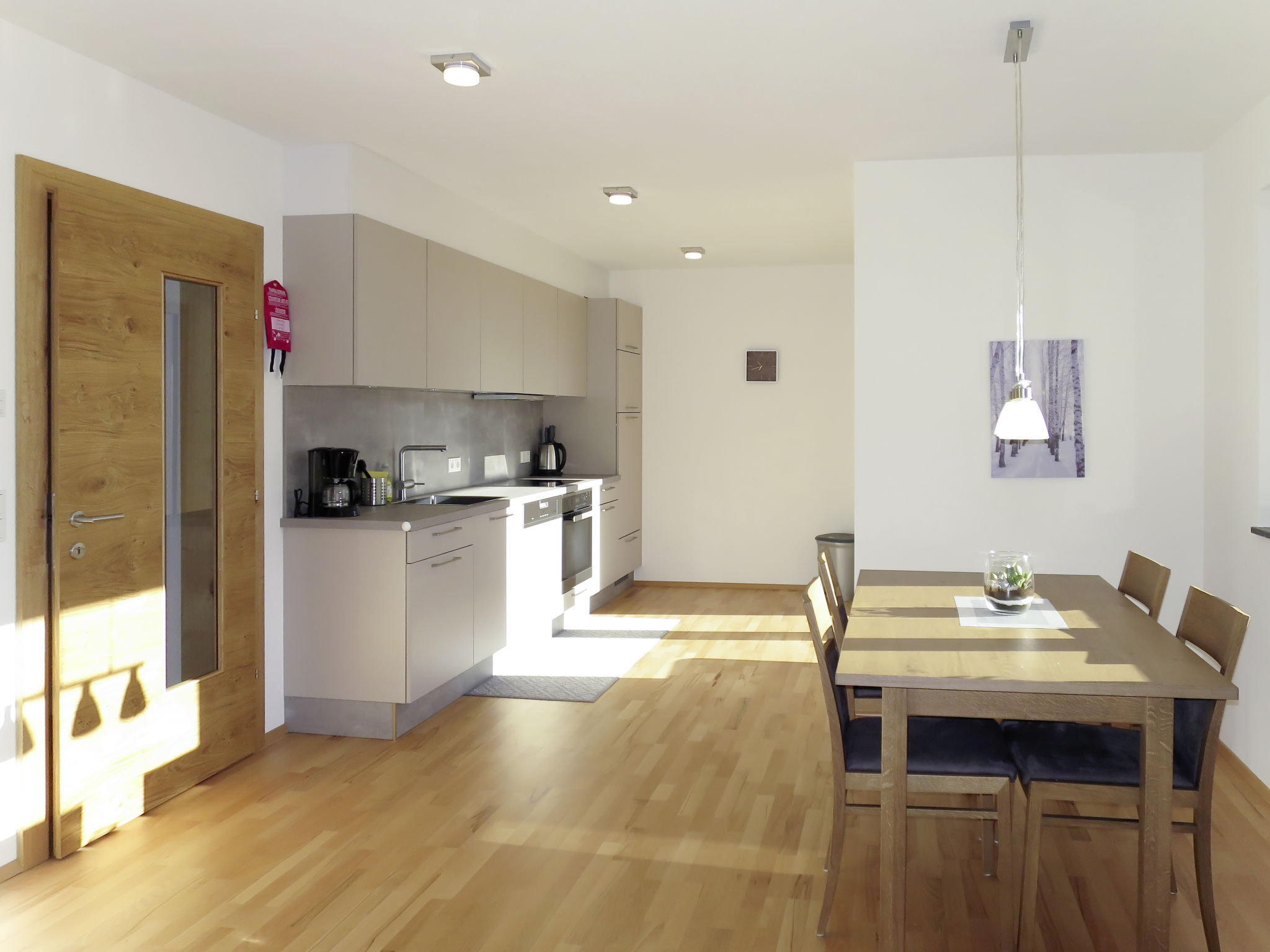 3-Zimmer-Wohnung, Obergeschoss, ca. 70 m². Wohnraum mit Sitzcouch, Essplatz, Küchenzeile (4 Ceranfelder, Backofen, Mikrowelle, Geschirrspüler, Kühl-/Gefrierkombination, Kaffeemaschine, Wasserkocher, Toaster) und Balkonausgang. 2 Doppelzimmer, eines davon mit Balkonausgang. Bad/Dusche/WC. Sep.WC.