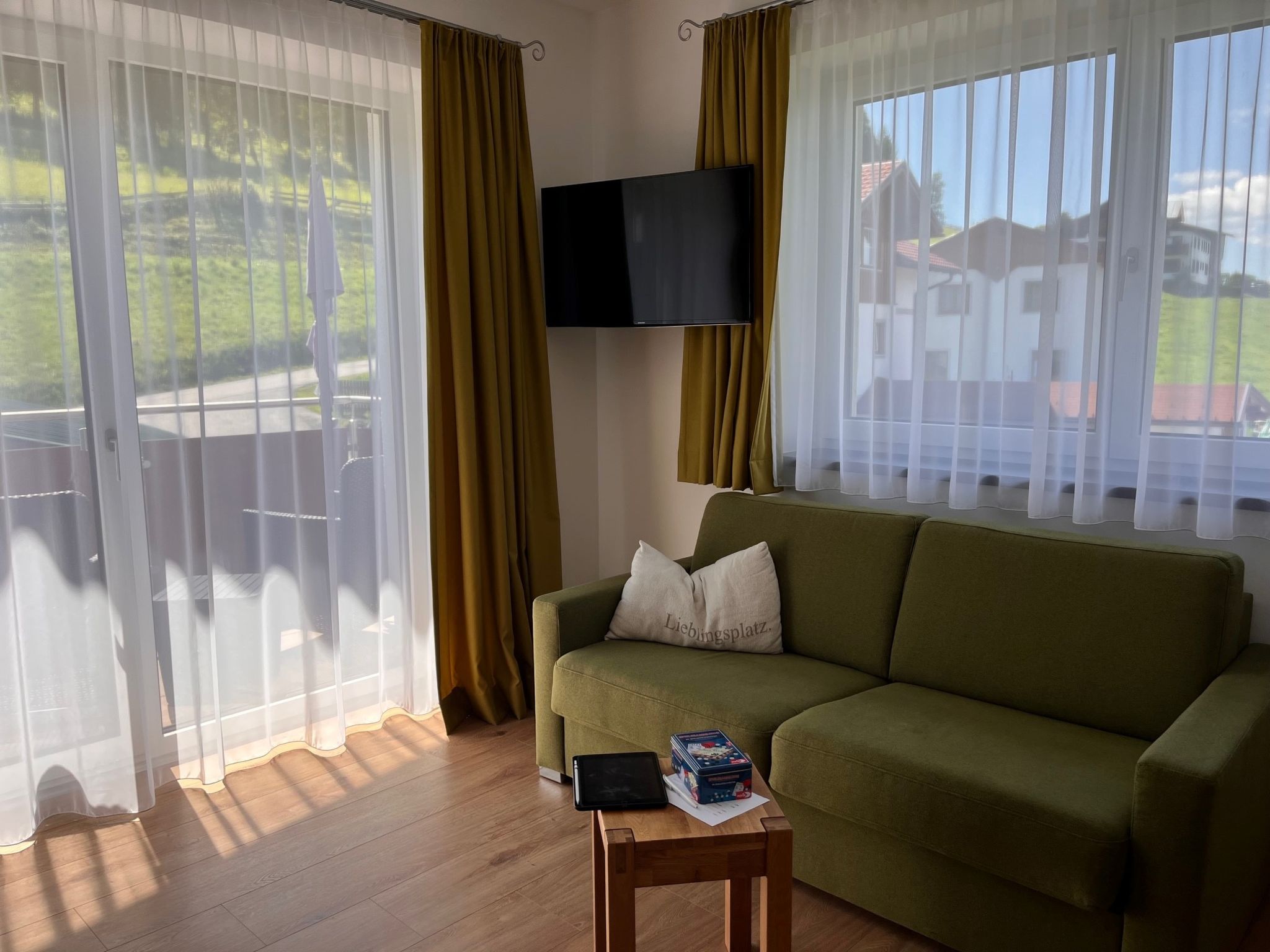 2-Zimmer-Wohnung 'Rubin', Obergeschoss, ca. 50 m². Wohn-/Schlafraum mit Doppelbettcouch, Küchenzeile (4 Ceranfelder, Backofen, Mikrowelle, Geschirrspüler, Kühl-/Gefrierkombination, Kaffeemaschine, Wasserkocher, Toaster), Essplatz (Eckbank) und Balkonausgang. Doppelzimmer mit Balkonausgang. Dusche/WC. Bei Belegung mit weniger Personen als der maximalen Personenzahl stehen nicht alle Wohneinheiten zur Verfügung.