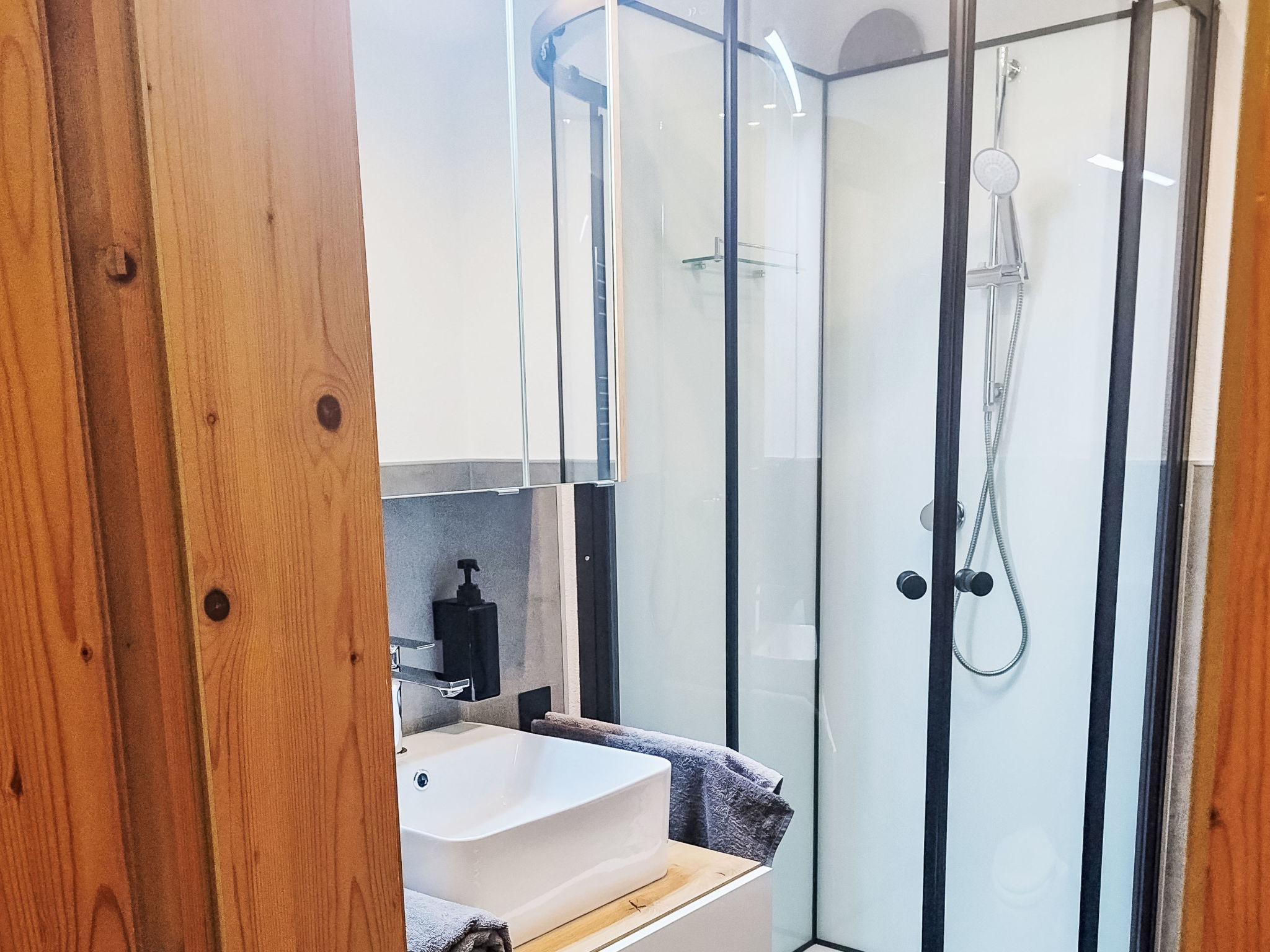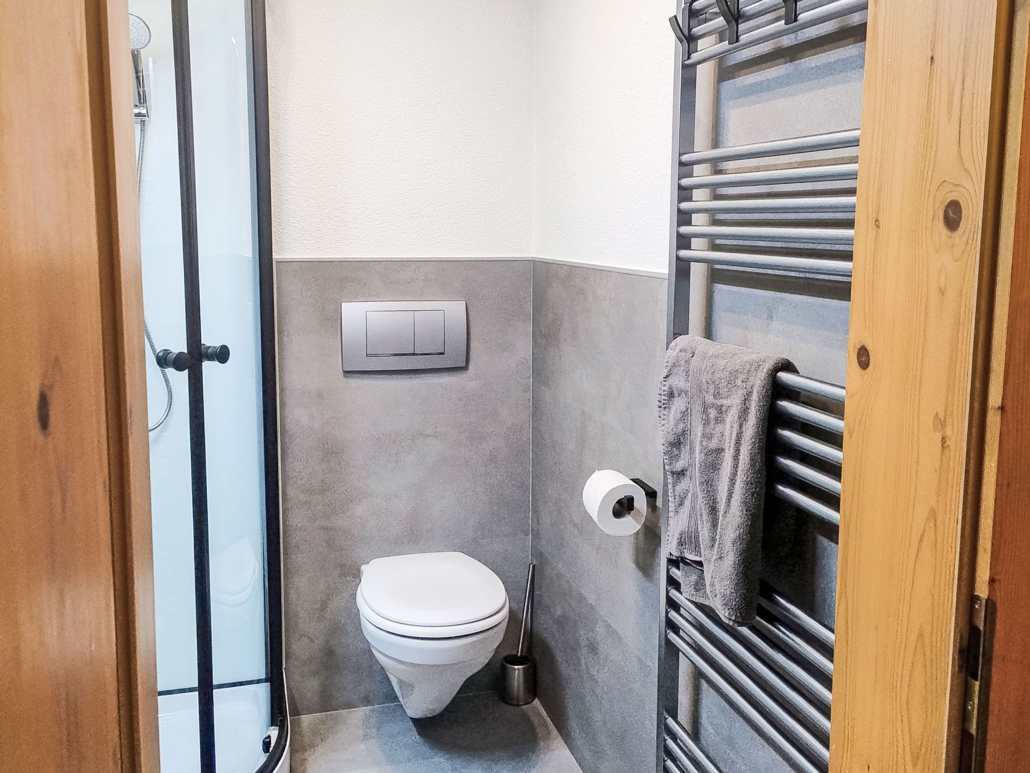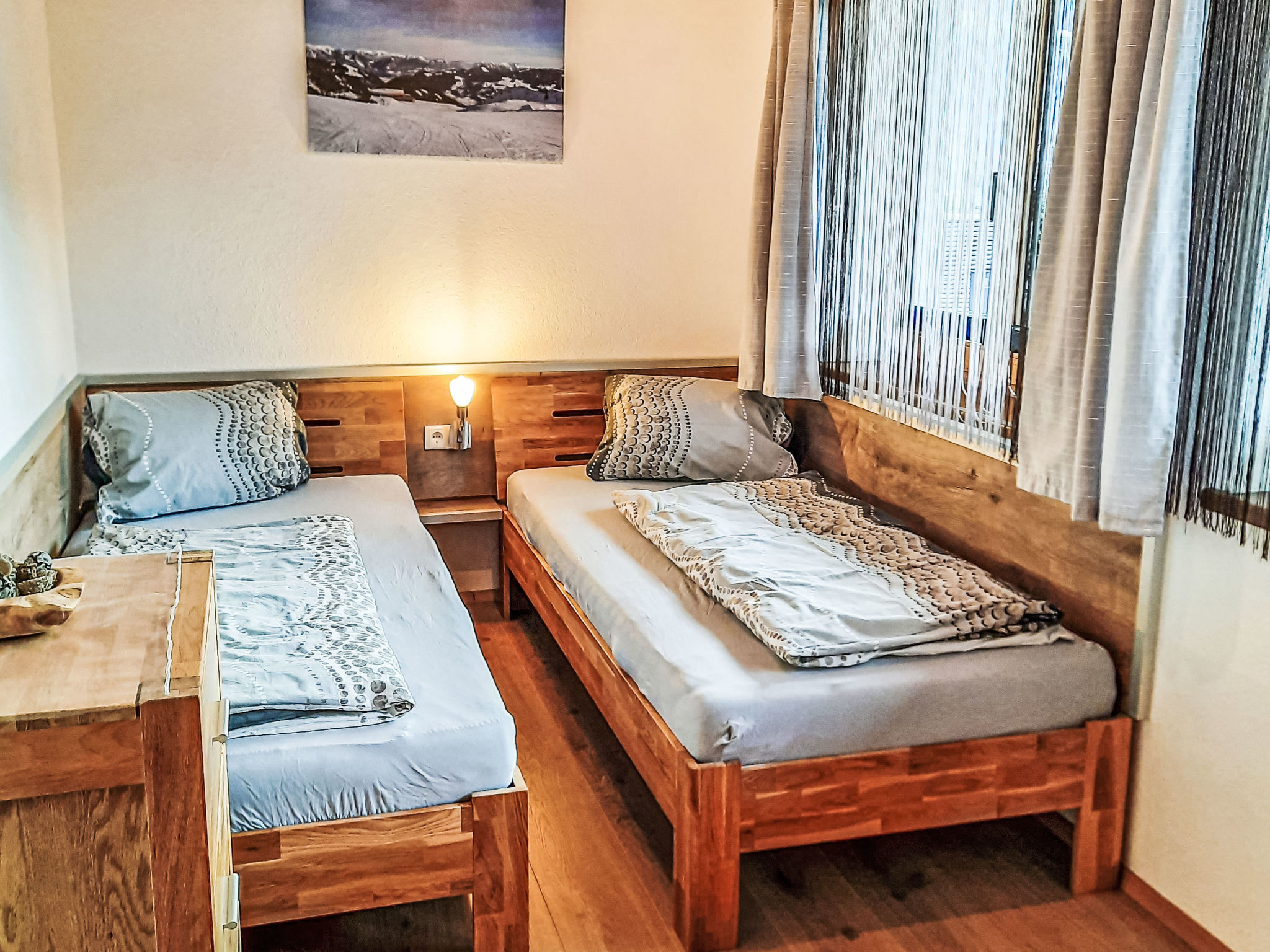 3-Zimmer-Wohnung 55 m2, im Obergeschoss. Renoviert im Jahre 2021, schön und modern eingerichtet: 1 Zimmer mit 2 Betten, Sat-TV und Flachbildschirm. 1 Doppelzimmer mit Sat-TV und Flachbildschirm. Ausgang zum Balkon. Wohnküche (Backofen, 4 Glaskeramikherd Platten, Toaster, Wasserkocher, Mikrowelle, elektrische Kaffeemaschine) mit Essecke. Dusche/WC. Holzheizung, Solarheizung. Balkon 8 m2. Sicht auf die Berge. Bitte beachten: Kühlschrank ohne Gefrierfach, Nichtraucher-Unterkunft.