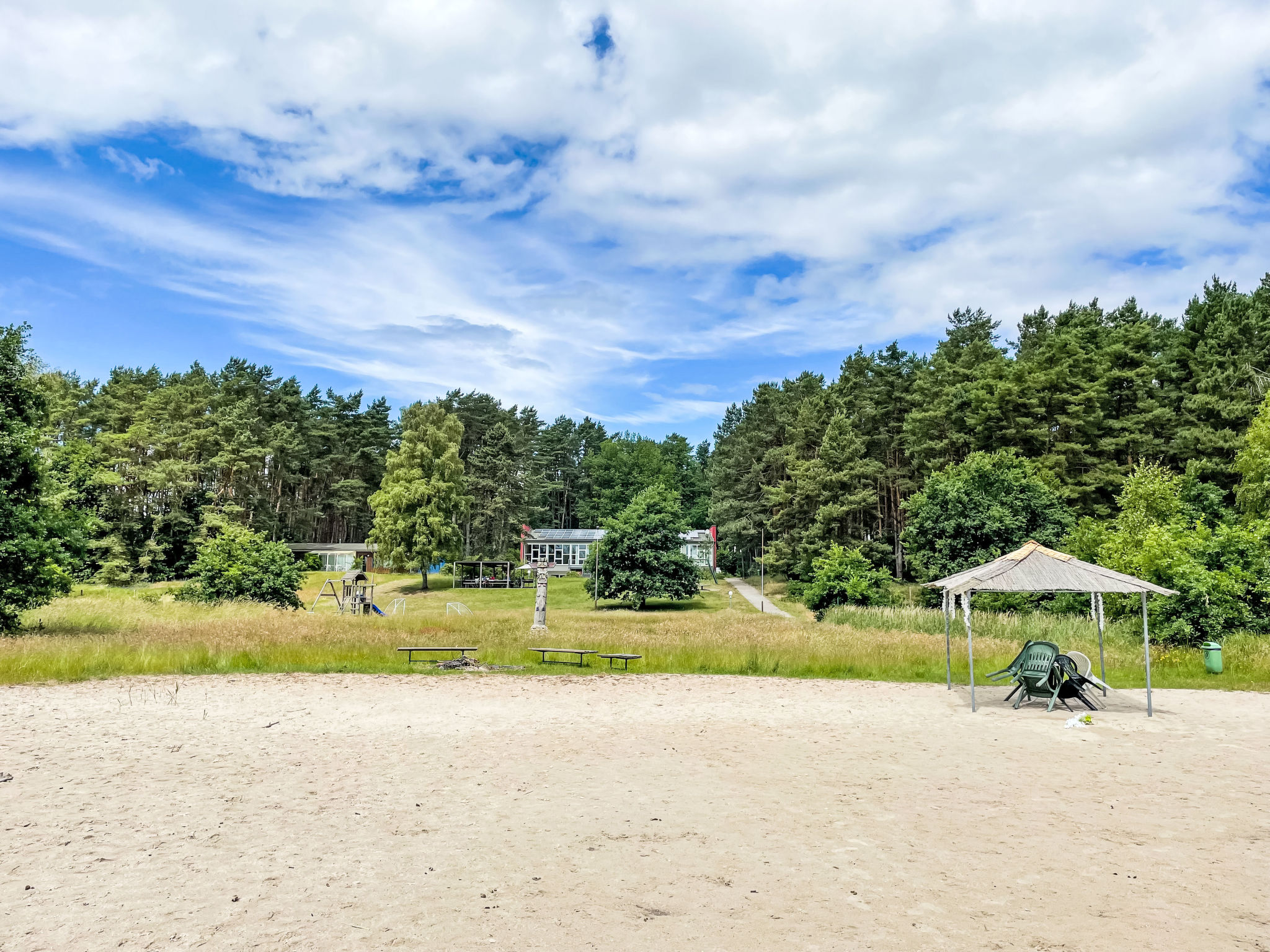 Ferienanlage "Silz am Fleesensee". 30 Häuser im Ferienresort. 1 km vom Zentrum von Silz, 8 km vom Zentrum von Malchow, 76 km vom Zentrum von Schwerin, direkt am See, direkter Zugang zum Strand. Zur Mitbenutzung: naturbelassenes Grundstück mit Bäumen, Liegewiese. Volleyballfeld, Grill, Kinderspielplatz (Schaukel). In der Anlage: Empfang, Wireless LAN (extra). Tischtennis, Waschmaschine, Wäschetrockner (zur Mitbenutzung, extra), Fahrradverleih. Ruderboot (auf Anfrage Absprache am Ort). Zentralparkplätze. Supermarkt 8 km, Restaurant 500 m, Bushaltestelle "Nossentin" 3 km, Bahnstation "Nossentin" 3 km, Thermalbad "Göhren-Lebbin" 12 km. Golfplatz (18 Loch) 12 km. Nahe gelegene Sehenswürdigkeiten: Waren (Müritz) 20 km, Müritz Nationalpark 20 km. Bitte beachten: Fahrzeug empfohlen. Angeln (mit Bewilligung), private Bootsanlegestelle. Be- und Entladen am Ferienhaus möglich. Standup Paddle Verleih gegen Gebühr. Großer Grillplatz mit Mobiliar und Überdachung.