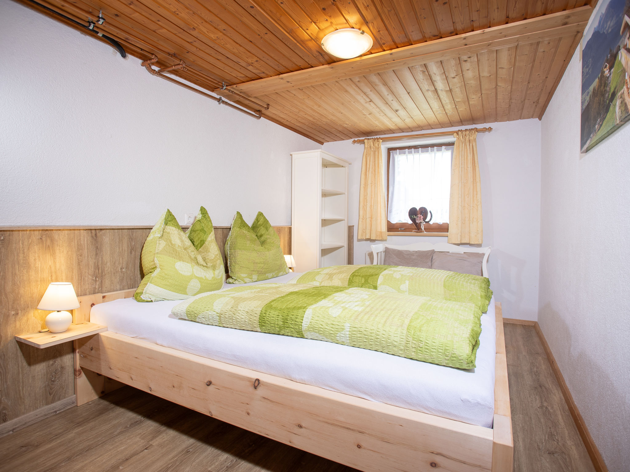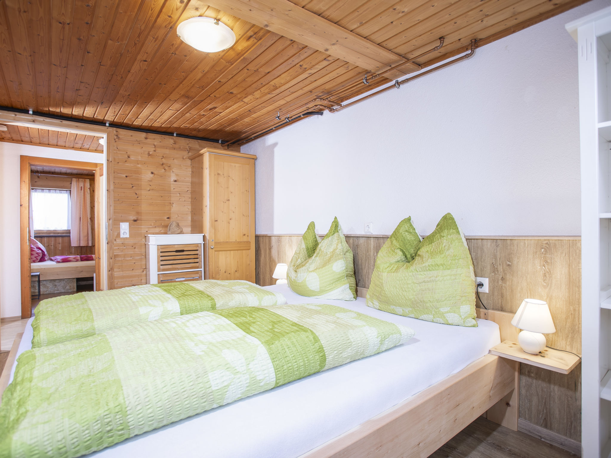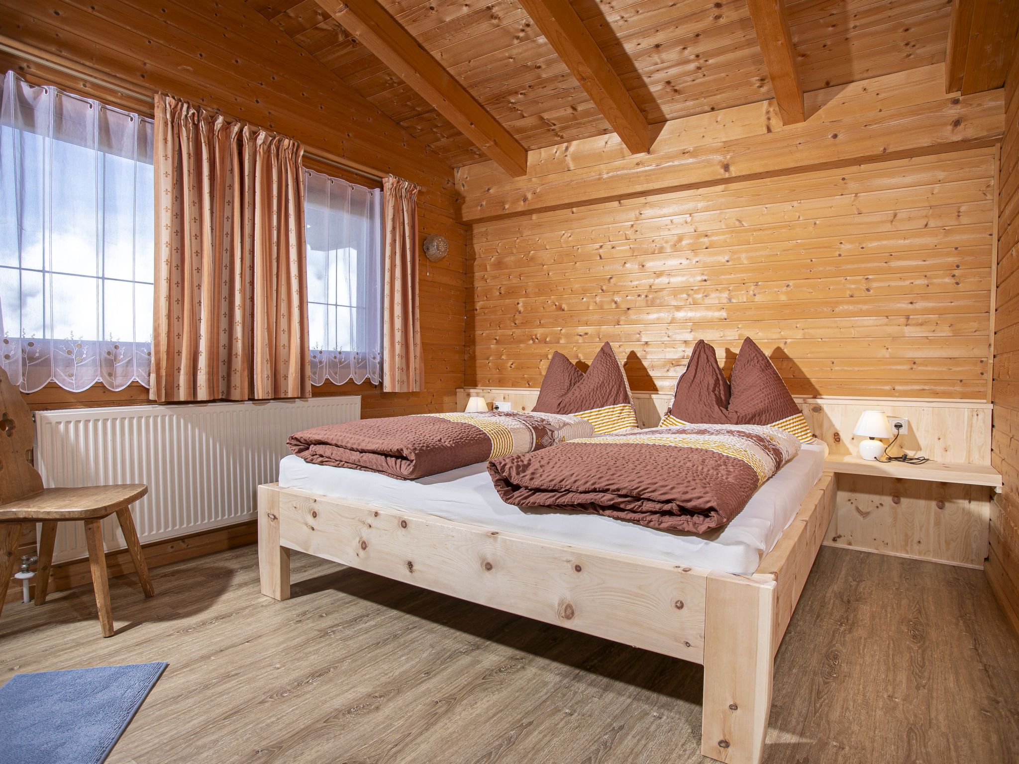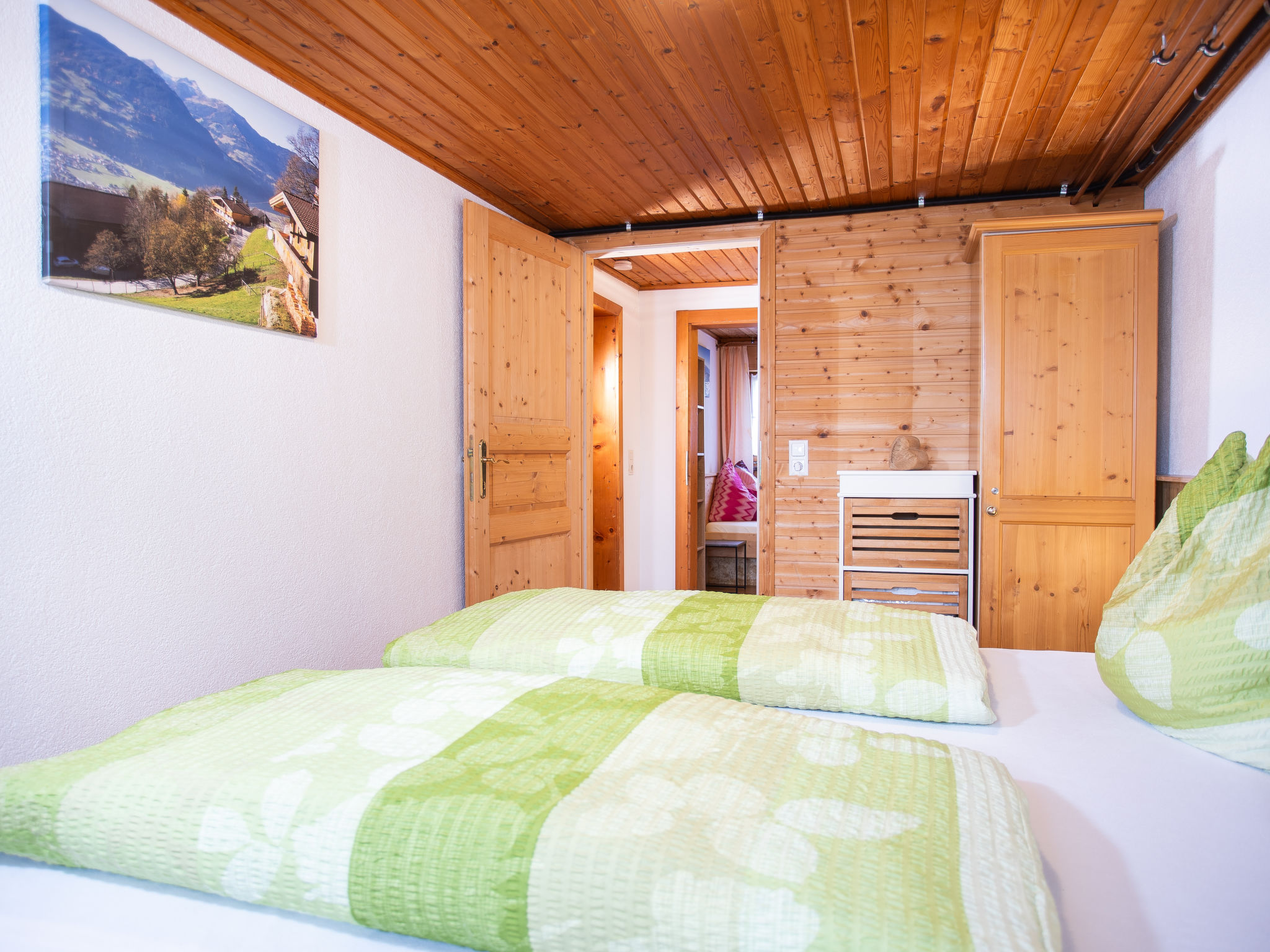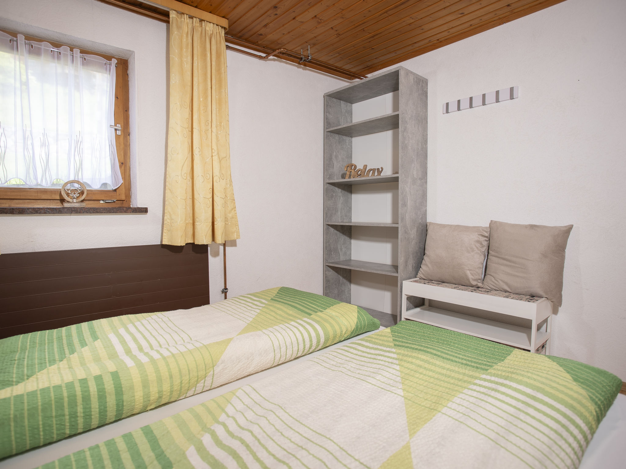 5-Zimmer-Chalet 93 m2 auf 2 Stockwerken. Einfach und gemütlich eingerichtet: 1 Doppelzimmer mit Dusche. Wohn-/Esszimmer mit Schwedenofen, Essecke und Sat-TV (Flachbildschirm), Radio. Offene Küche (Backofen, Geschirrspüler, 4 Glaskeramikherd Platten, Mikrowelle). Sep. WC. Unteres Geschoss: 2 Doppelzimmer. 1 kleines Zimmer mit 2 Betten. Dusche, sep. WC. Balkon, Terrasse überdacht. Herrliche Sicht auf die Berge und das Tal. 2 Haustiere/Hunde erlaubt.